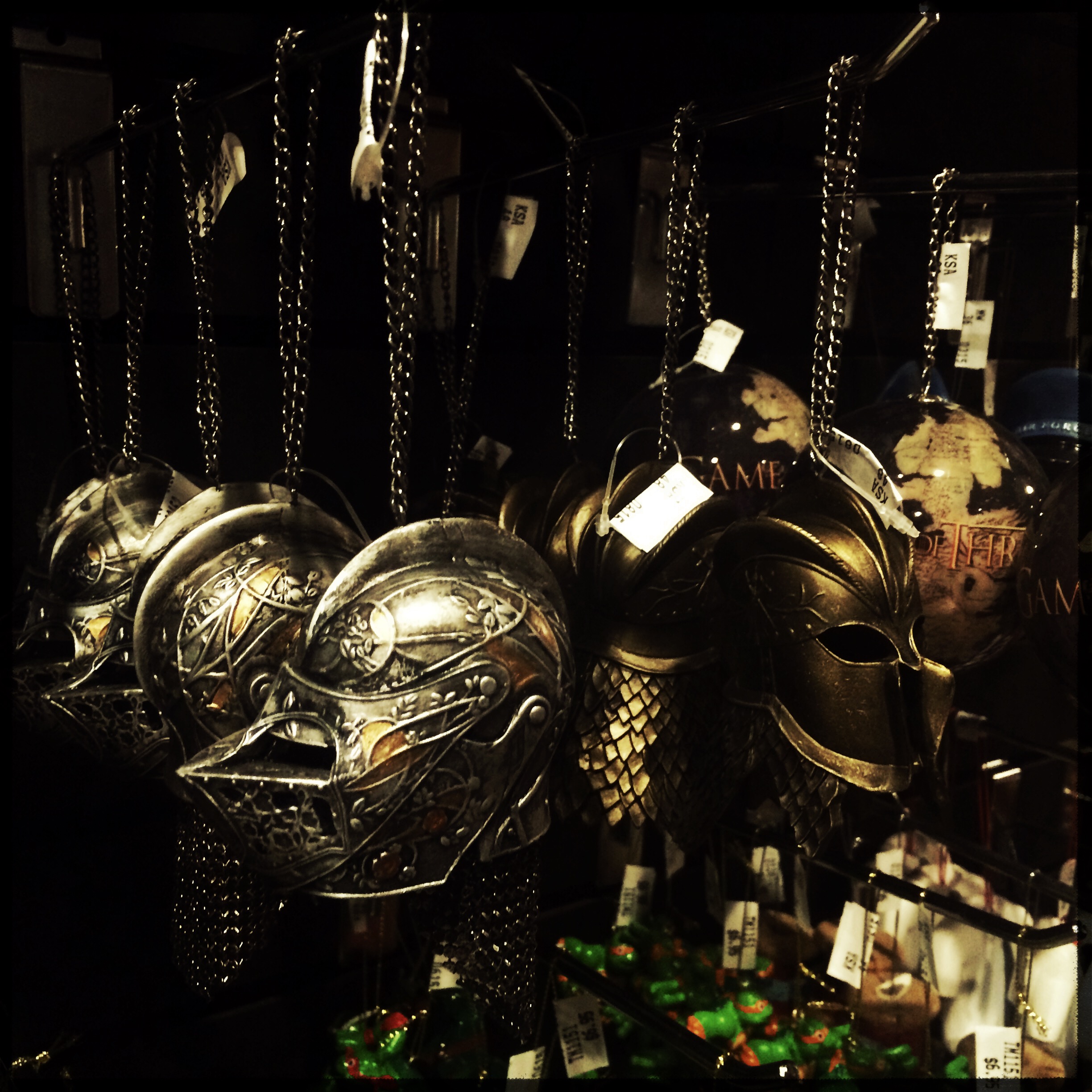 On shoppe, on essaye de trouver des petits cadeaux rigolos à ramener, c’est pas facile. Ca me fait un peu toujours le même effet quand on voyage. A Venise par exemple, en arrivant, je me suis dit « Wooo, c’est TROP ringard les gars, vos masques à la con ». Et au fur et à mesure… La quantité, le visuel récurrent… « Oh tiens, on prend un masque pour les enfants, c’est marrant ». RHAAA.