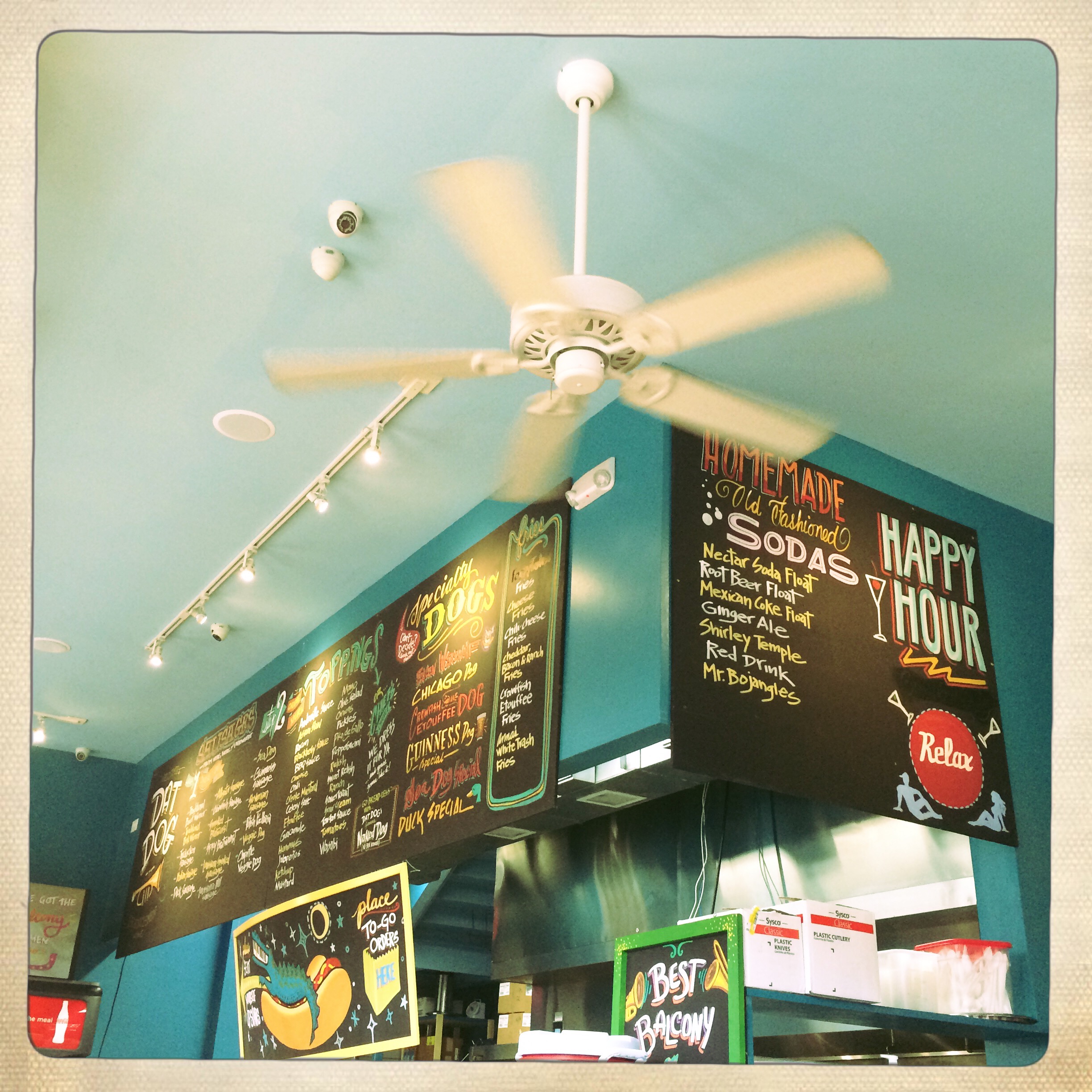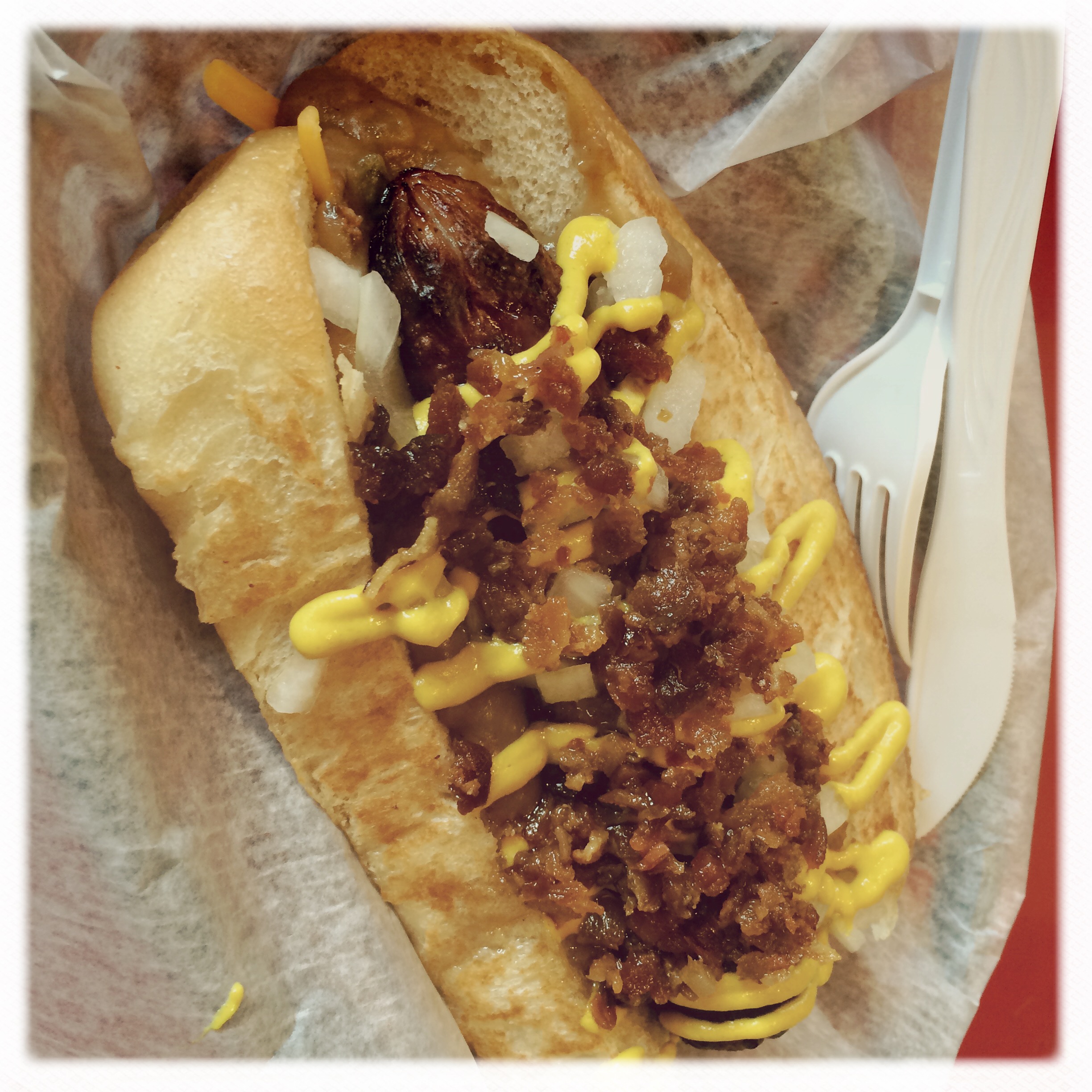 Petite pause déjeuner vers 16h, au Dat Dog. Il y a des saucisses de tout. Moi j’ai pris Guiness, et Manu, canard. C’est un épatant hot dog, voilà.
