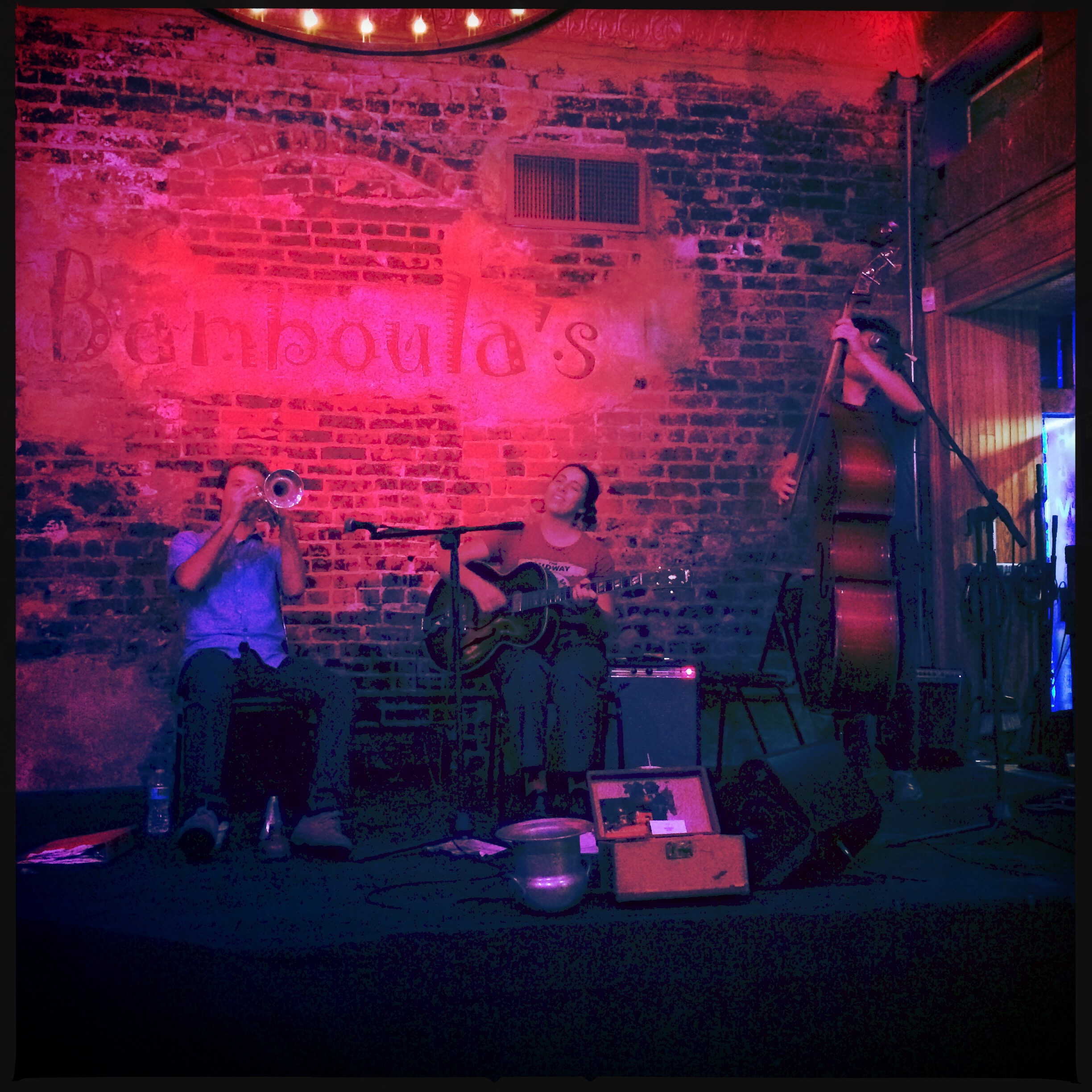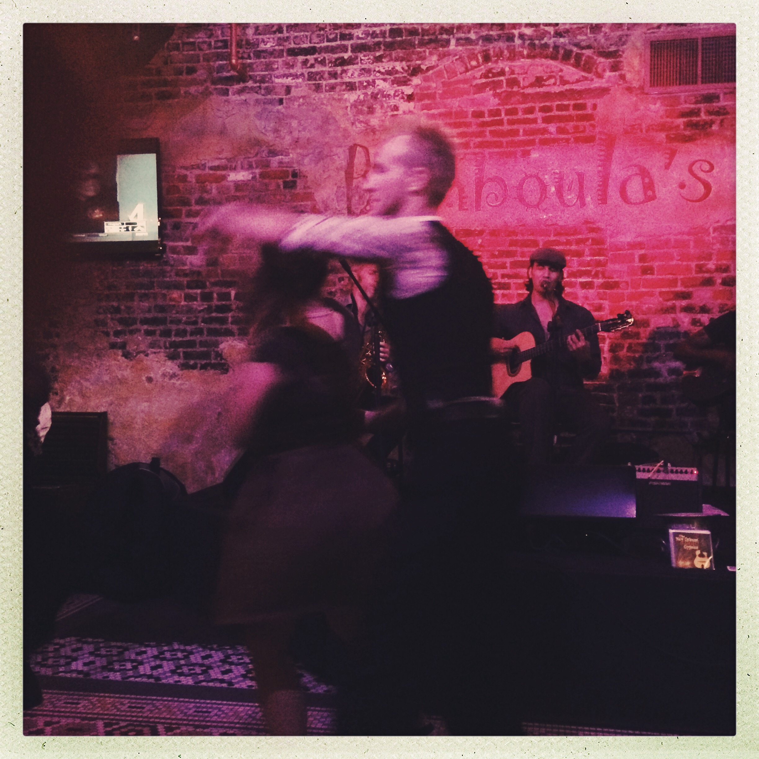 Ce soir, on voulait éviter Bourbon Street. Dans mes farfouilles matinales, ils avaient l’air de dire que sur Frenchmen (le nom d’une rue), la musique est moins Sweet Home Alabama. On se dirige vers le Bamboulas (http://www.clubbamboulas.com) , on a pile poil une table juste devant. Il n’y a pas trop de monde, il n’y a pas de serveuse qui font boire des shots entre leurs nichons, et pas de rednecks ivres morts qui font des selfies. Il est très bien cet endroit dites donc.