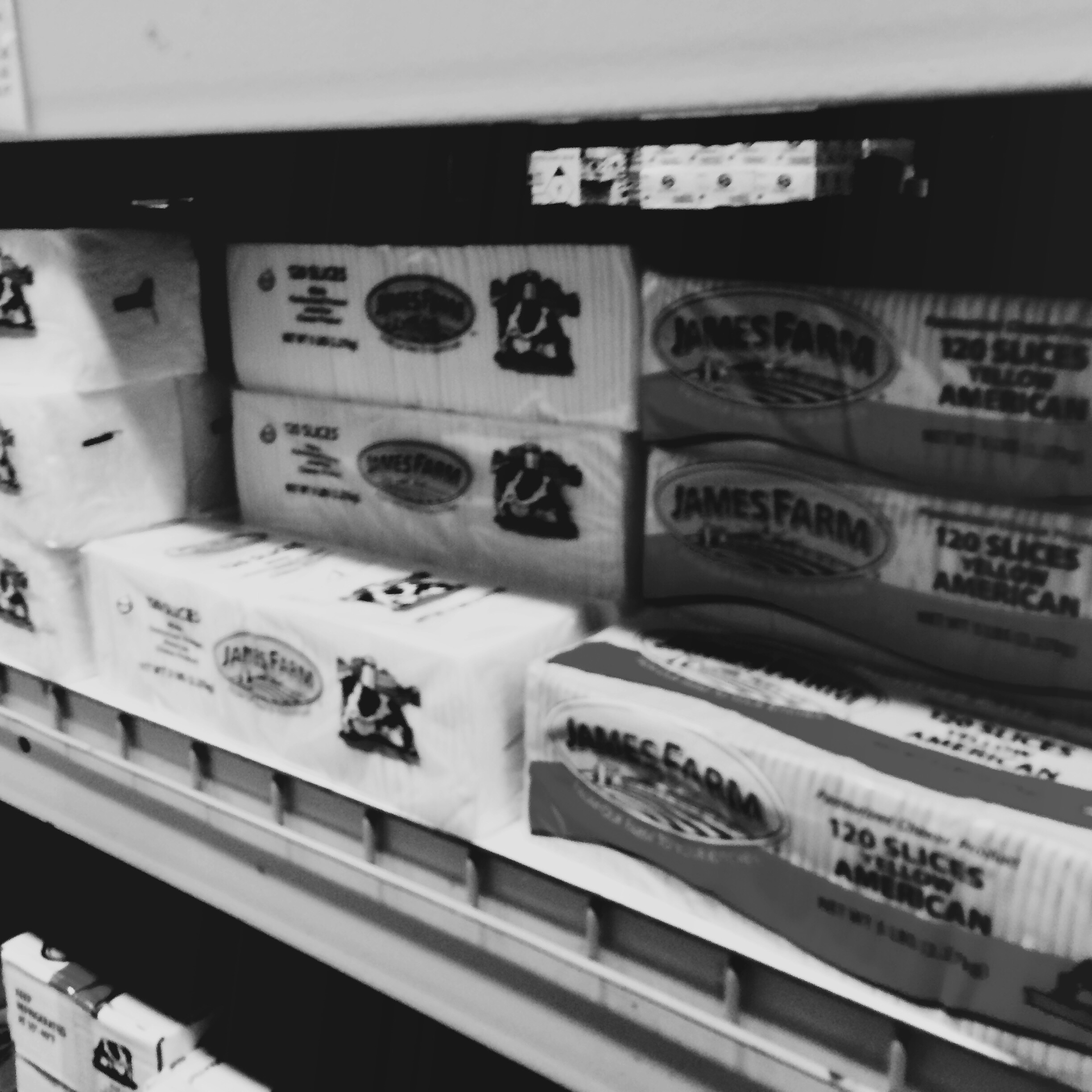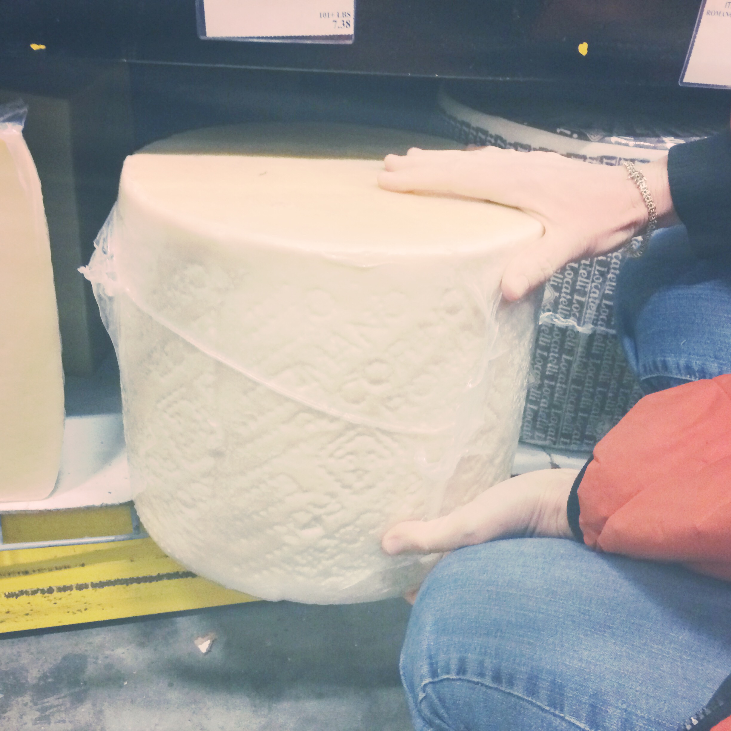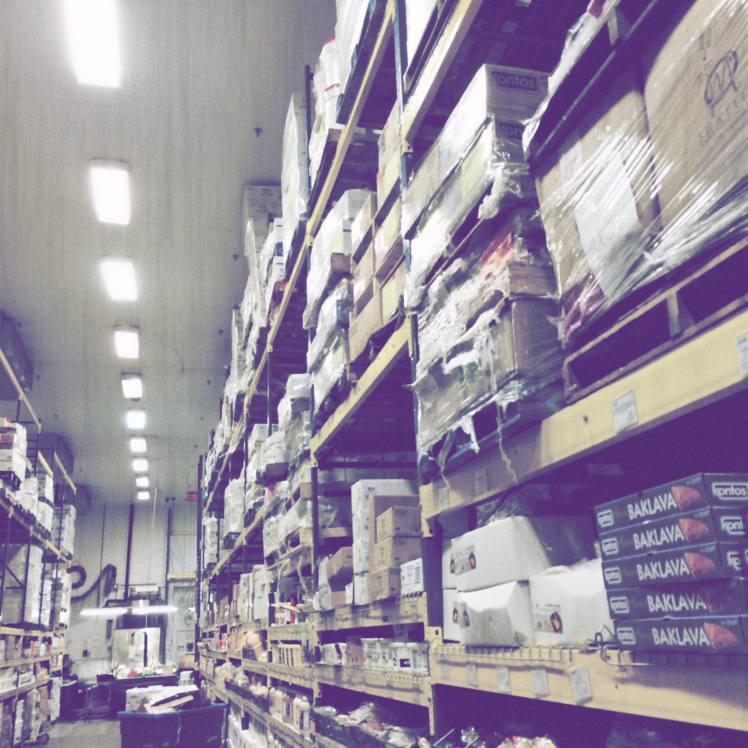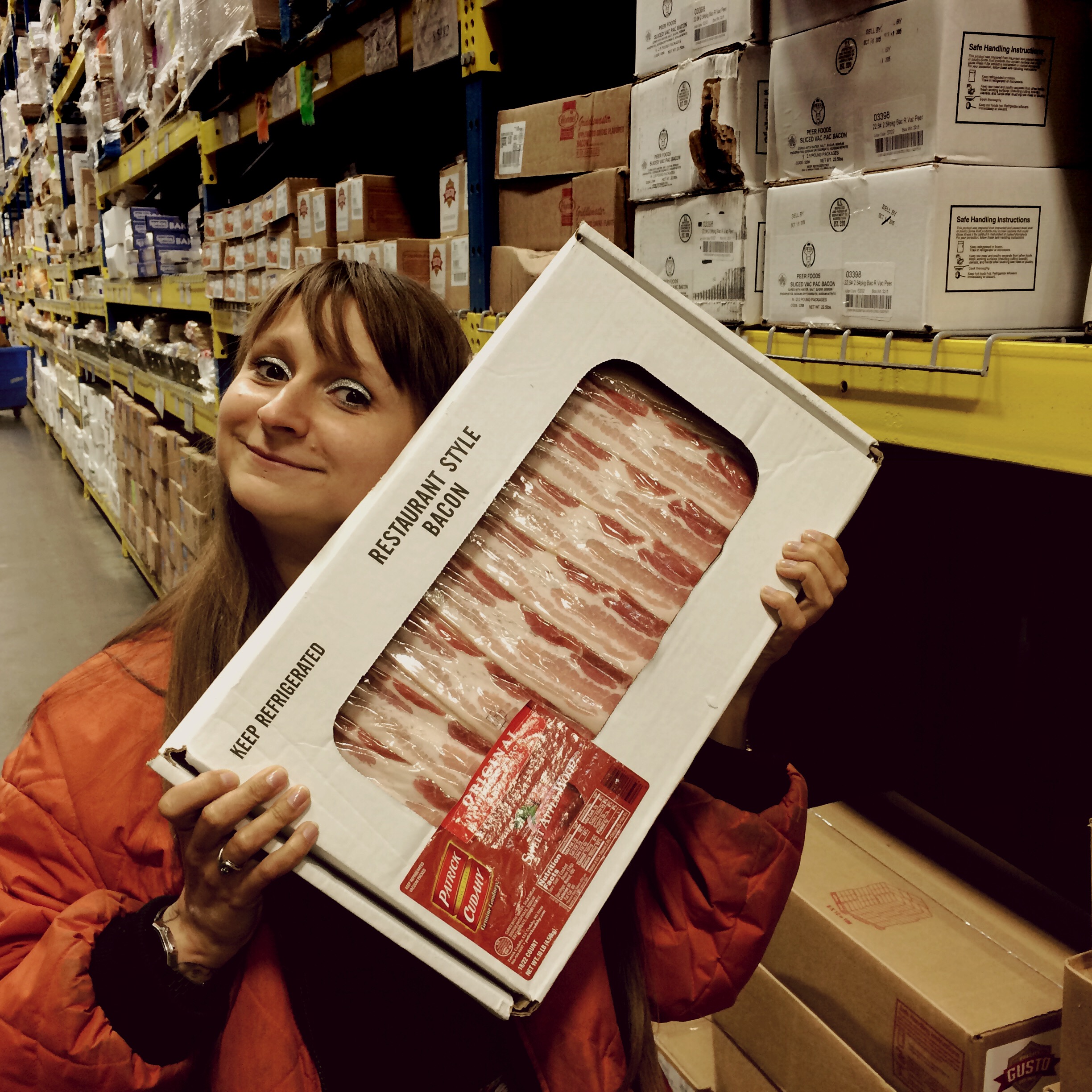 À l’entrée du rideau de plastique lourd, des blousons orange qui tiennent chaud. Je fais la maline un peu, Uncle Jack m’a dit de prendre un pull, j’ai un gilet épais comme une mue d’escargot. Je passe le fameux rideau de plastique lourd. Je fais instantanément demi tour, car, figurez-vous que l’on se déplace dans un gigantesque frigo. Un hangar frigo. C’est-su-per-cool. Des fromages entiers démesurés, des seaux de yaourt, des plateaux de bacon… tout le frais est là, en fois mille.