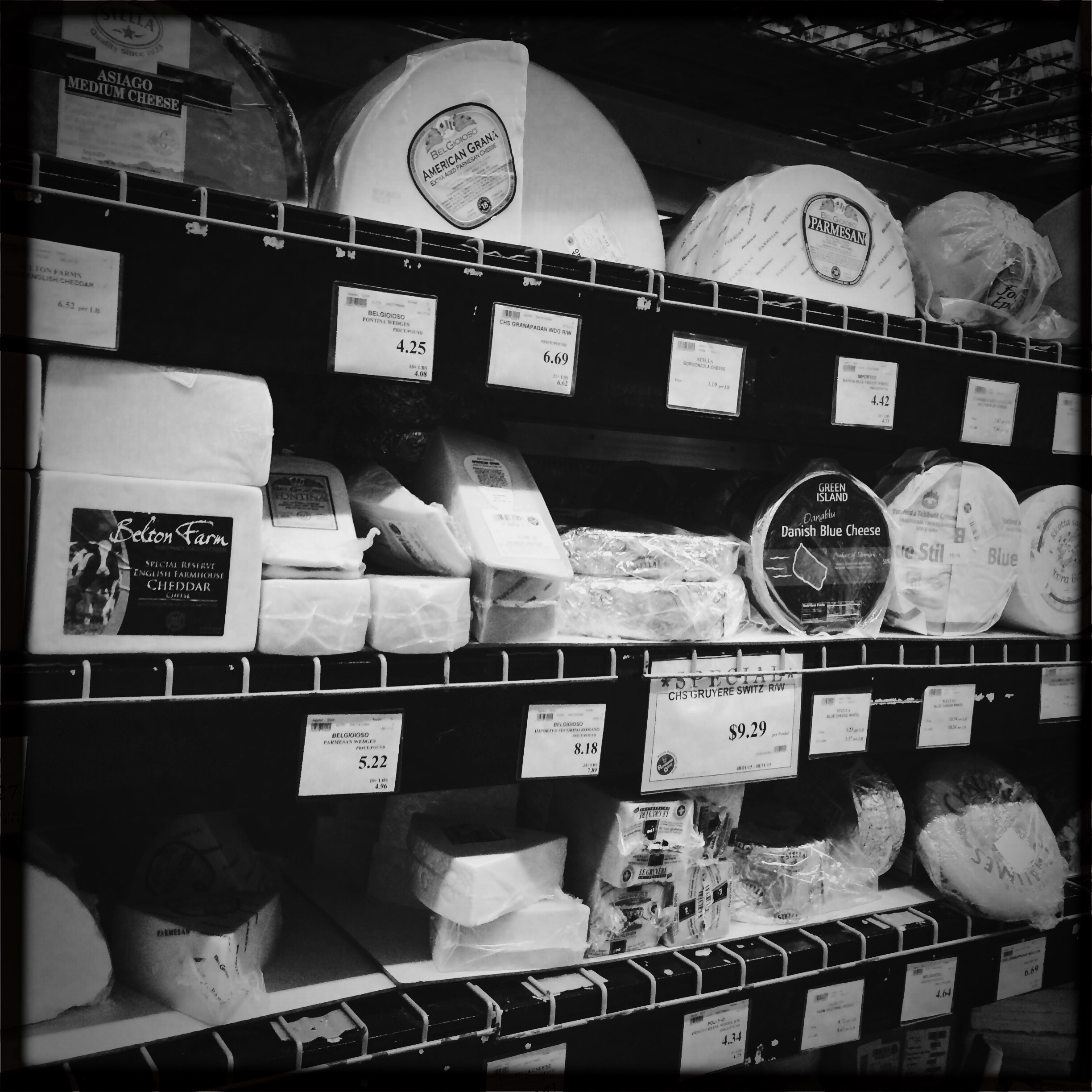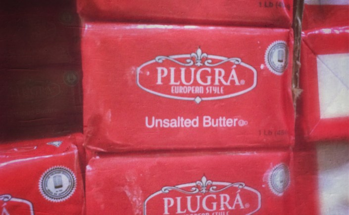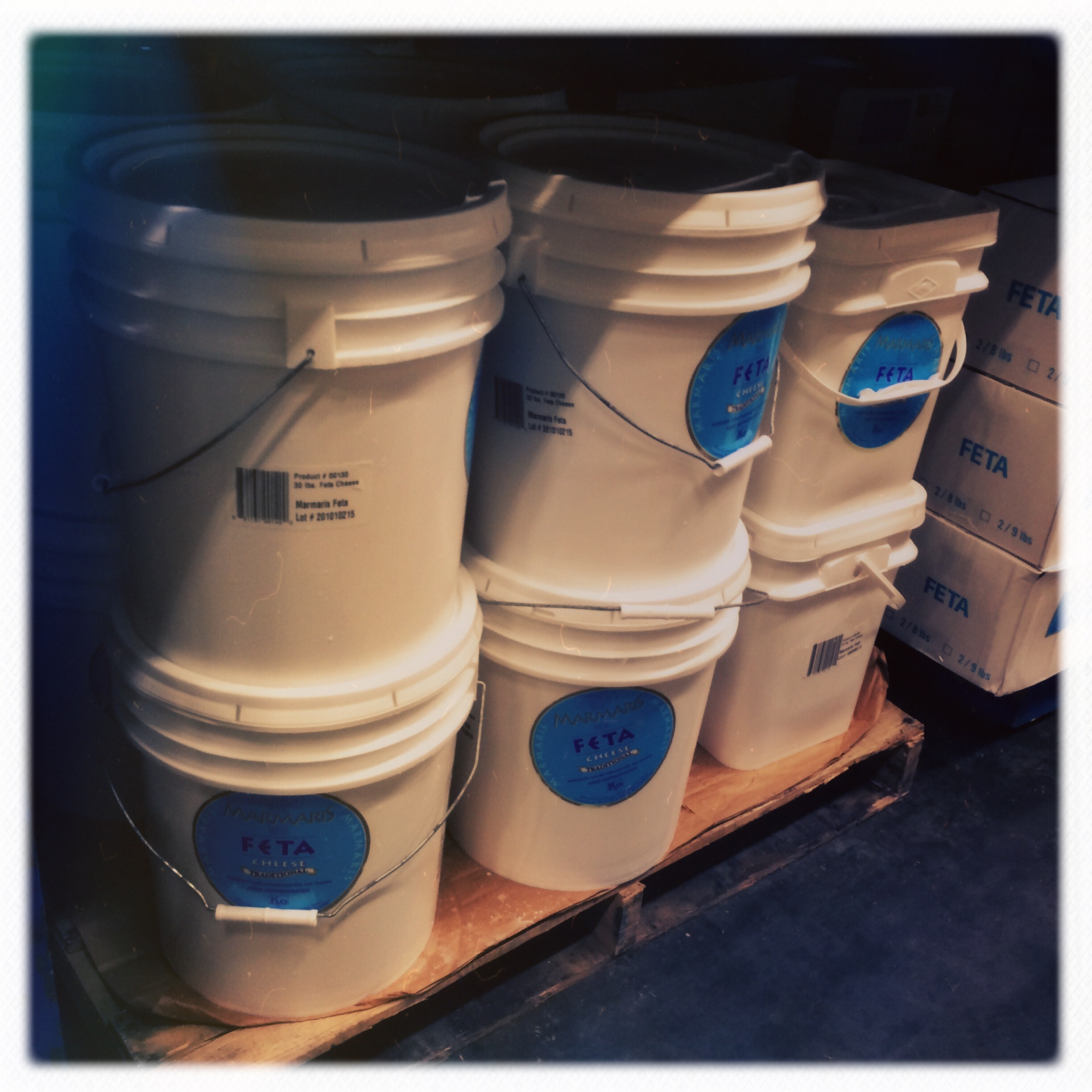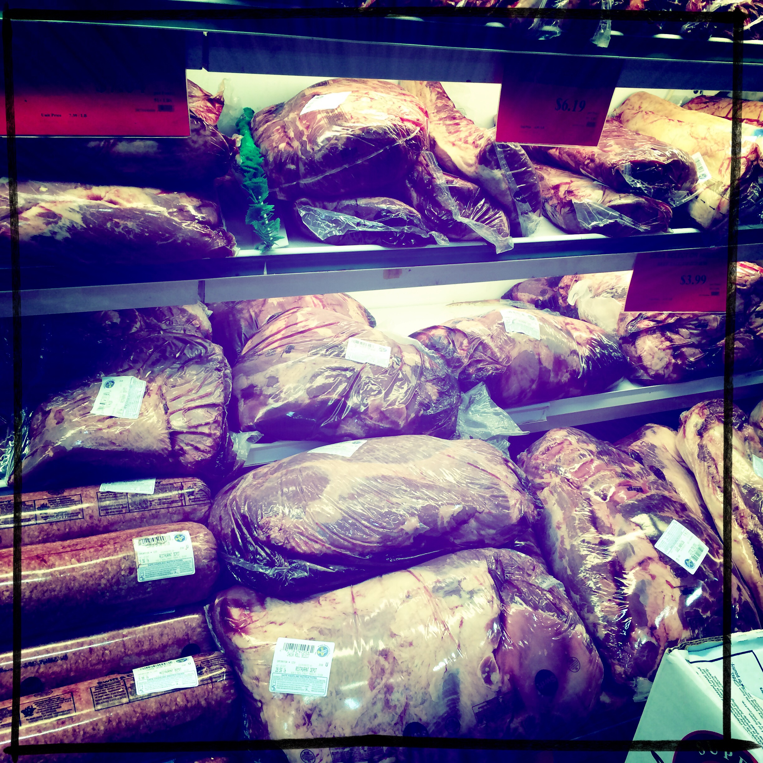 À l’entrée du rideau de plastique lourd, des blousons orange qui tiennent chaud. Je fais la maline un peu, Uncle Jack m’a dit de prendre un pull, j’ai un gilet épais comme une mue d’escargot. Je passe le fameux rideau de plastique lourd. Je fais instantanément demi tour, car, figurez-vous que l’on se déplace dans un gigantesque frigo. Un hangar frigo. C’est-su-per-cool. Des fromages entiers démesurés, des seaux de yaourt, des plateaux de bacon… tout le frais est là, en fois mille.