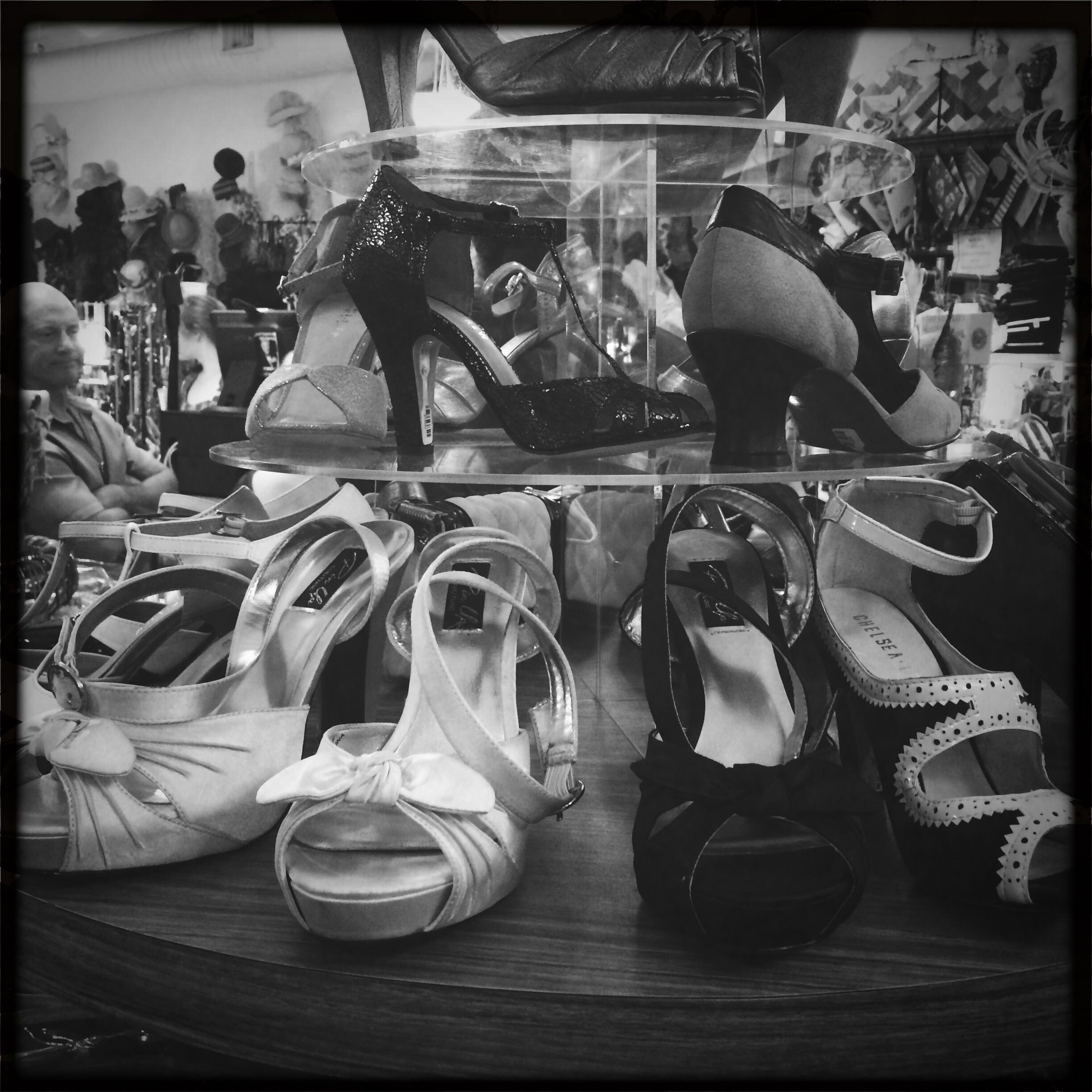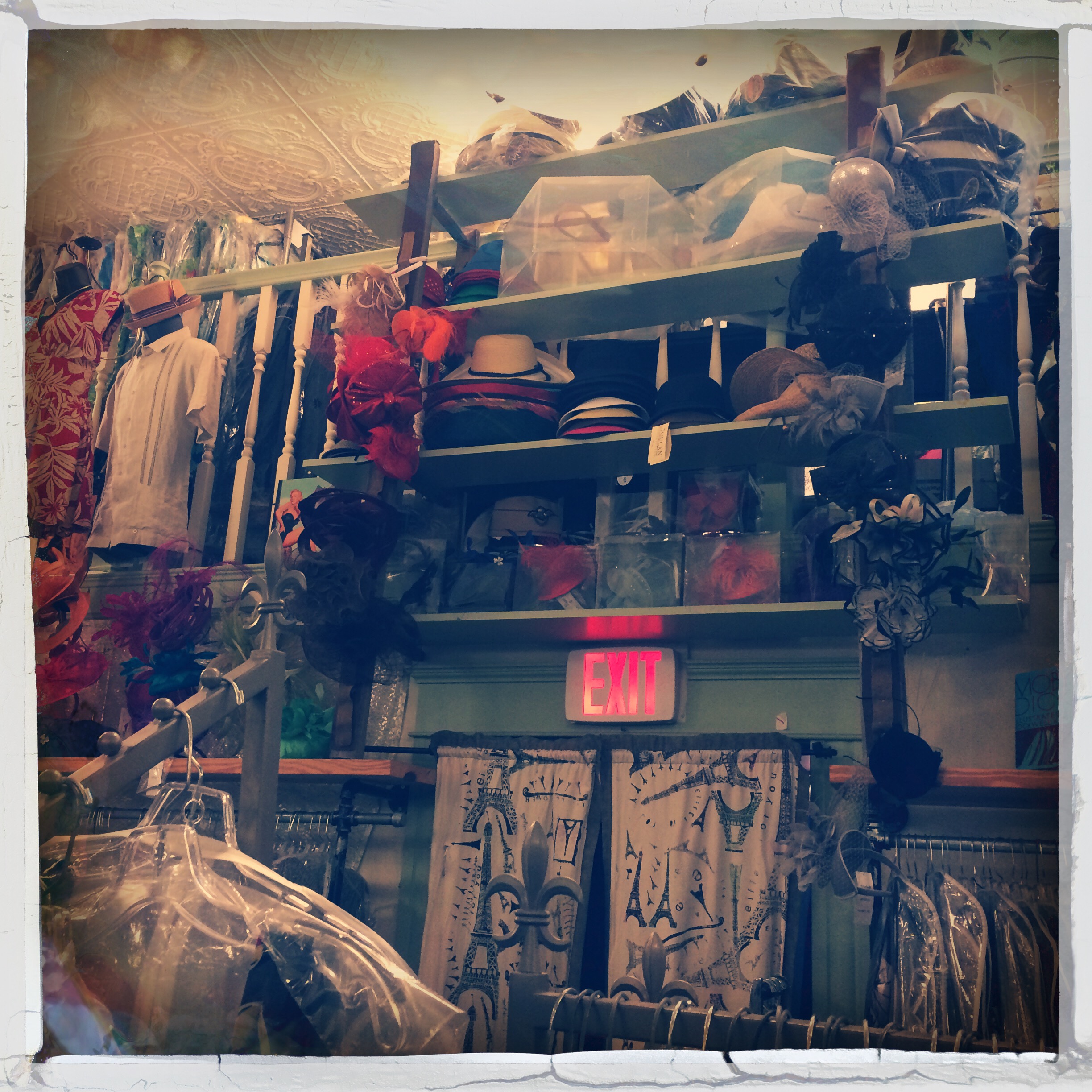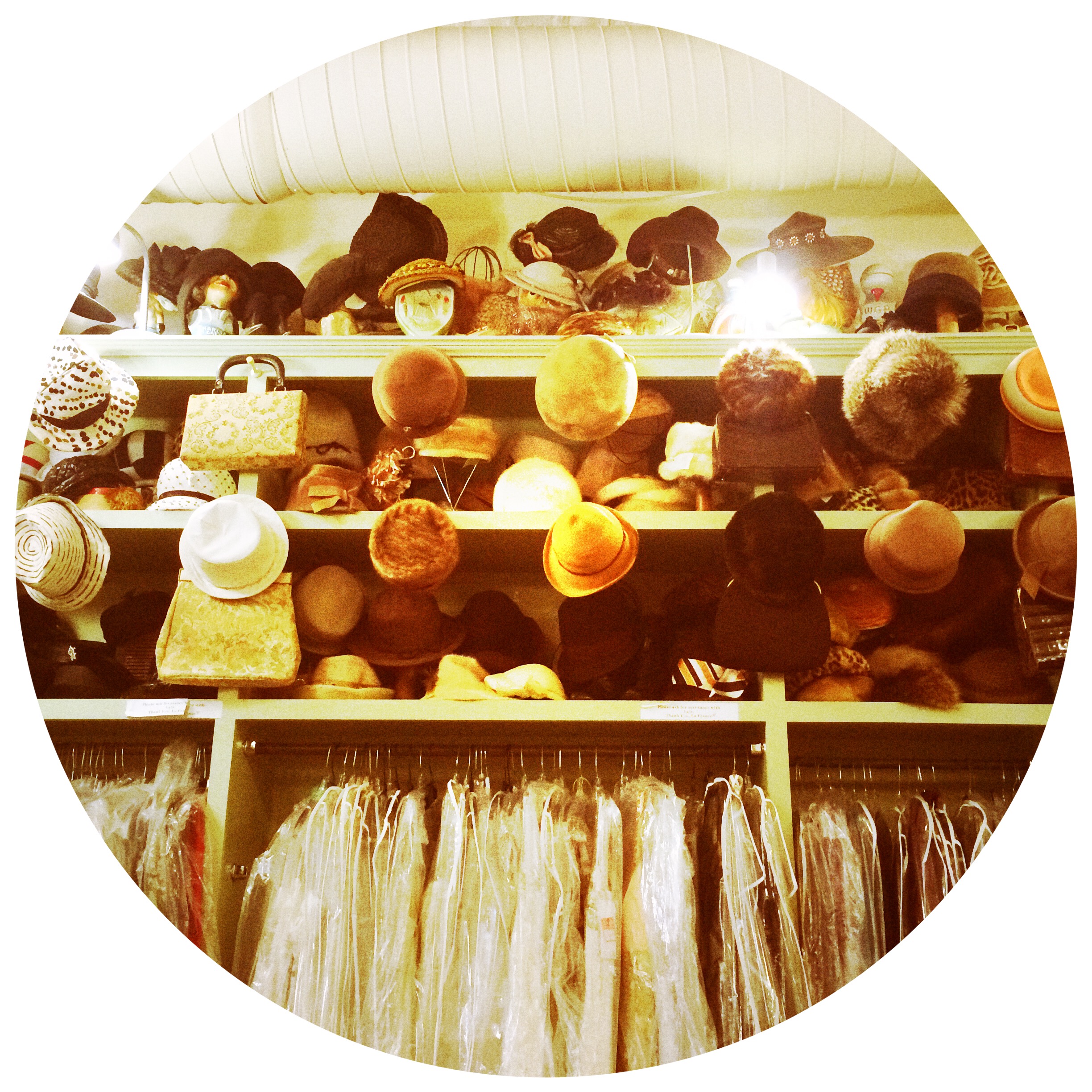 C’est un magasin de fripes (et de vêtements neufs) vintages. Je pousse des petits cris réjouis. Les vêtements de toutes les époques sont emballés dans du plastique et mis sur des cintres. Au plafond, il y a des jupons et des chapeaux, sur les étagères, des chaussures et des bottines. C’est un arrêt dans le temps, de plusieurs époques. Je sautille un peu, c’est ridicule, d’autant que je capitule un peu face aux tarifs, qui sont eux aussi, très français. Aheum.