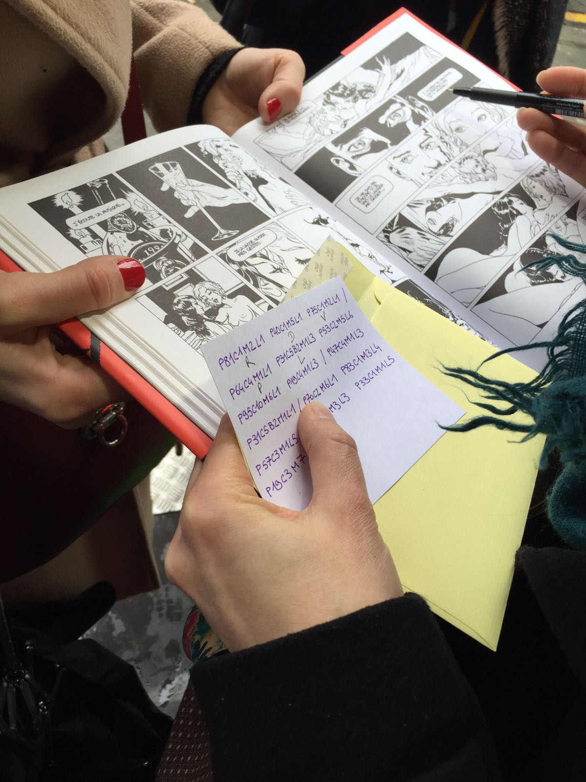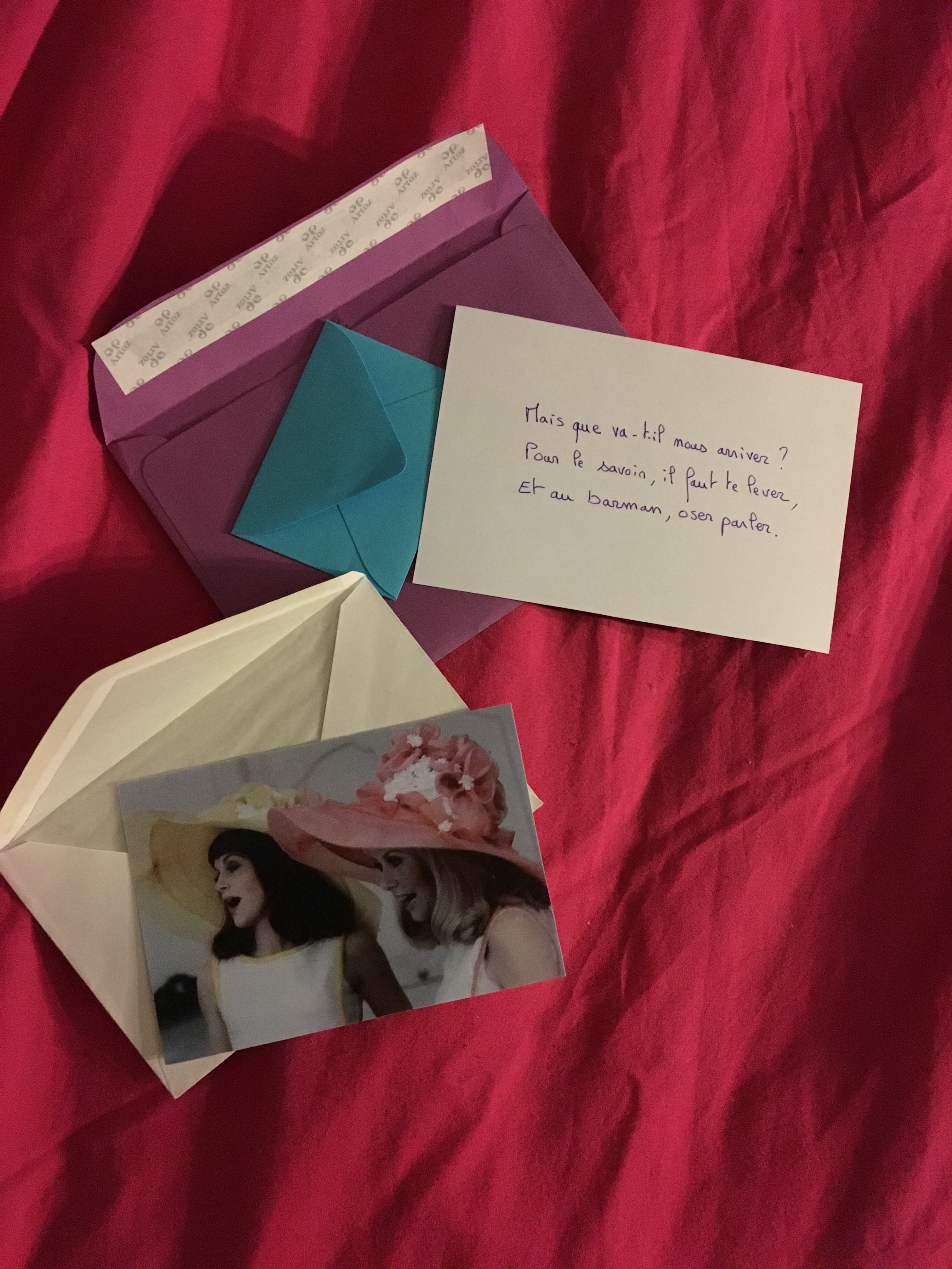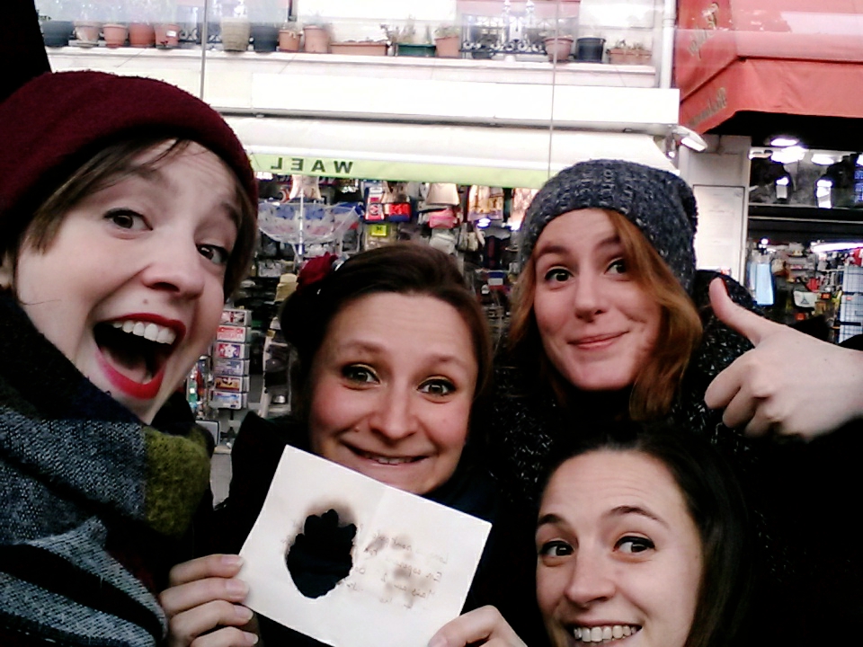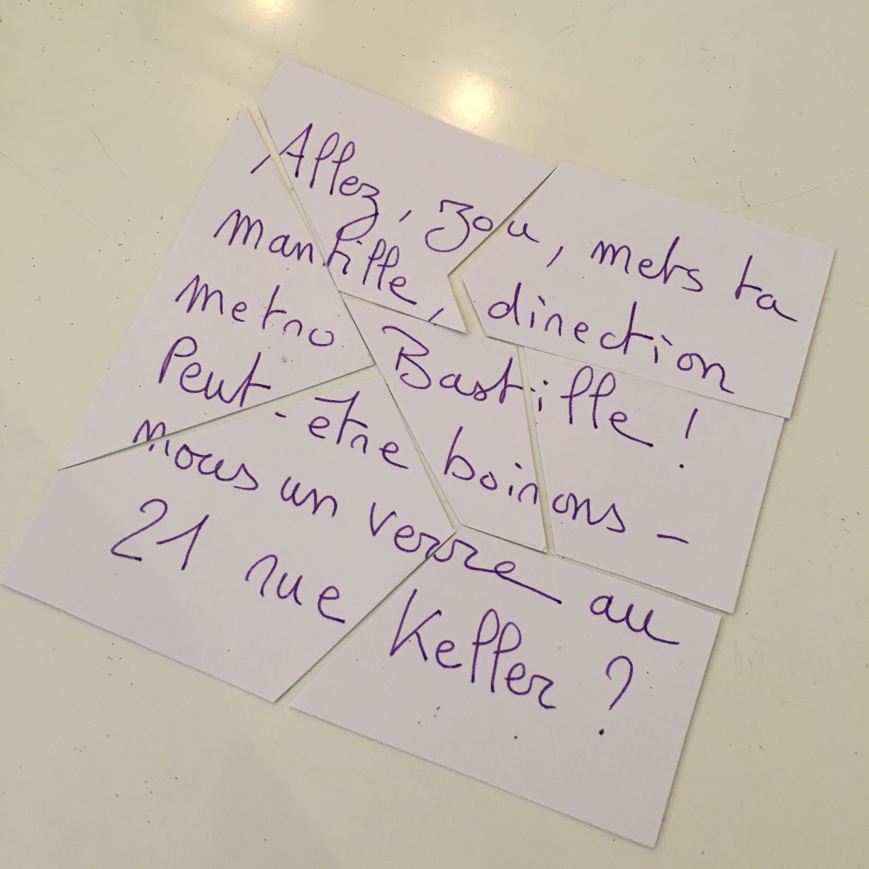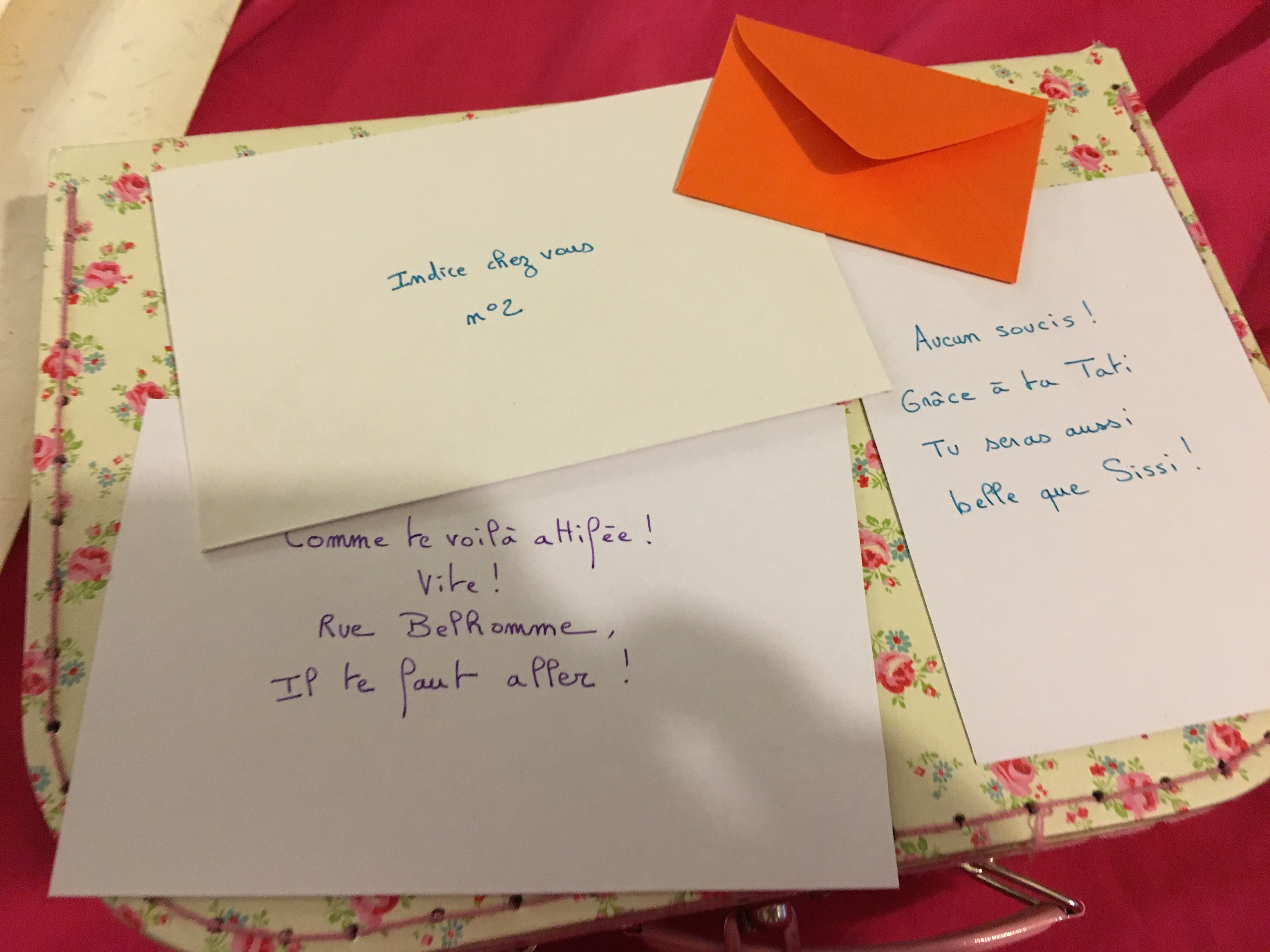 Un nouvelle indice : il faut que j’explore les toutes petites enveloppes qui se trouvaient dans les plus grandes enveloppes où y’avait les enveloppes à indices. Les fameuses pièces de puzzle. Une nouvelle adresse ! Rue Keller ! On se rejette dans le métro, toujours maquillées, avec nos cheveux si bien laqués.