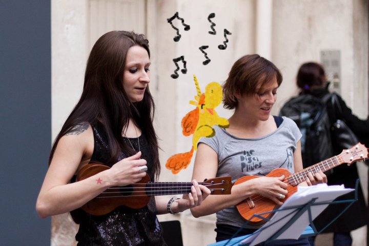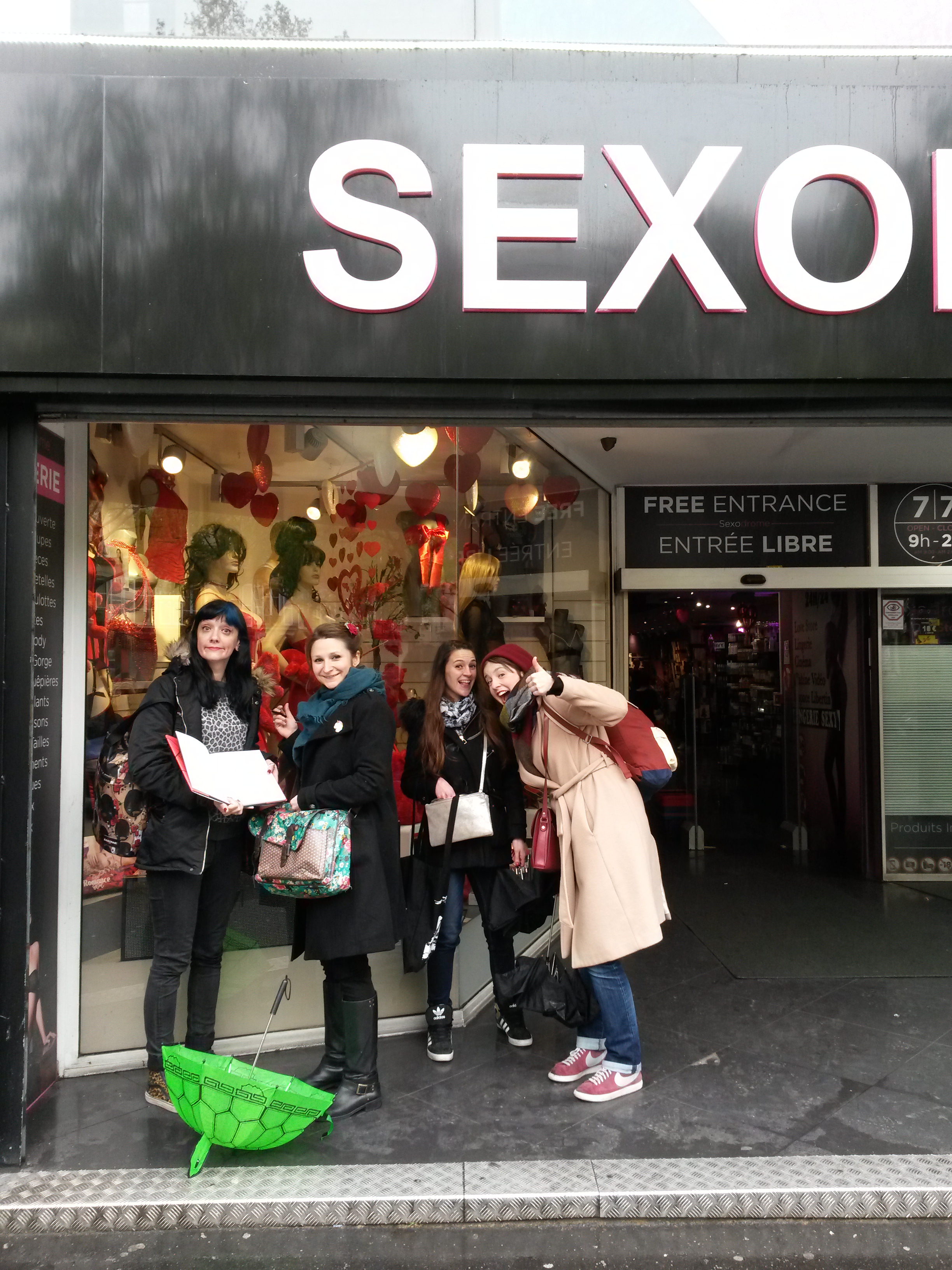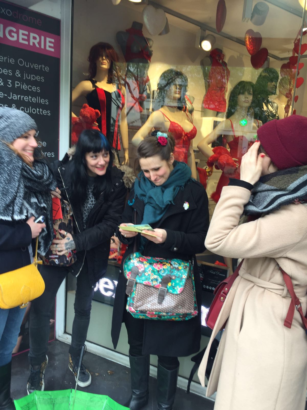 La photographe arrive quand on est prêtes, on commence les photos, toute seule, en groupe, et même dehors. Dans le froid. Oh ça, on devait avoir la cuisse ferme. Coup de bol c’était juste à côté de la galerie Vero Dodat. La gardienne nous a copieusement virées, avant qu’on ose demander à Charles le luthier des ukuleles (et autres) si on peut faire des photos devant sa vitrine. Il a dit oui. Triomphales, on a posé en grelottant mais avec grâce. La professionnelle de l’affaire, c’est Steph, qui est la plus forte en sexy attitude.