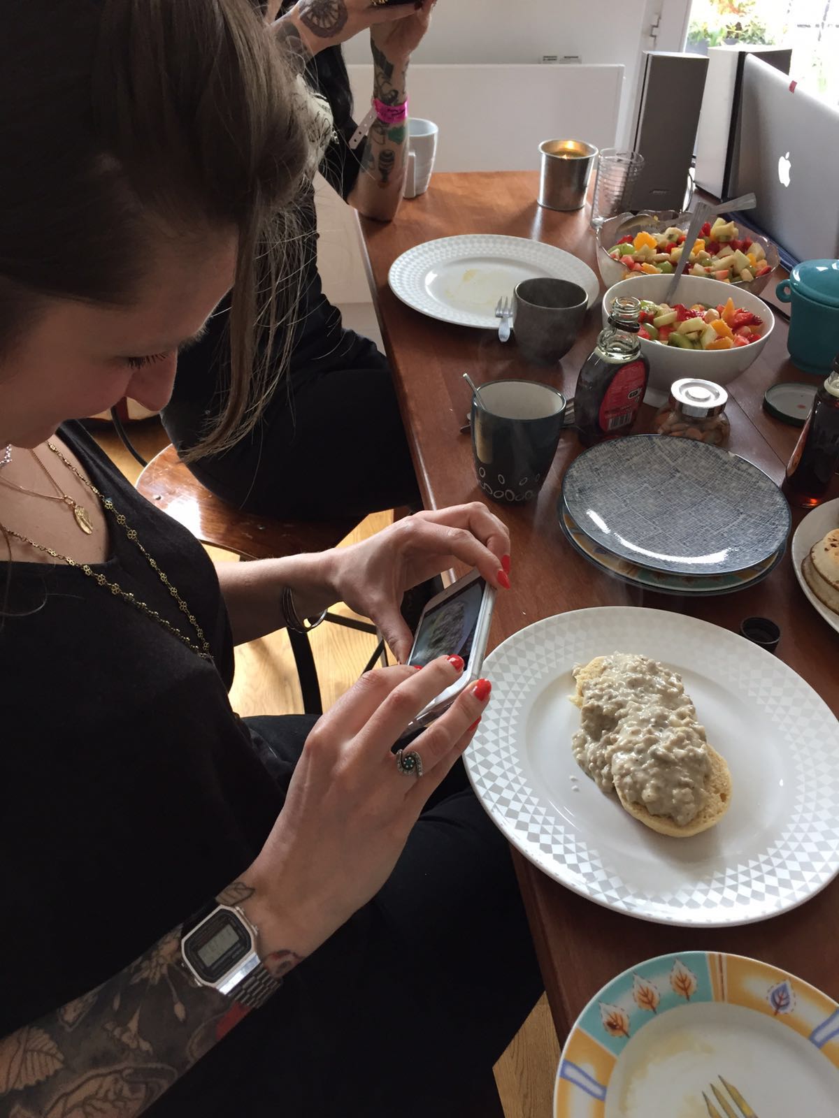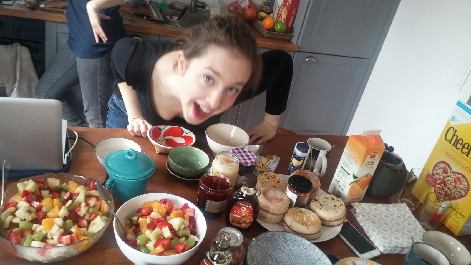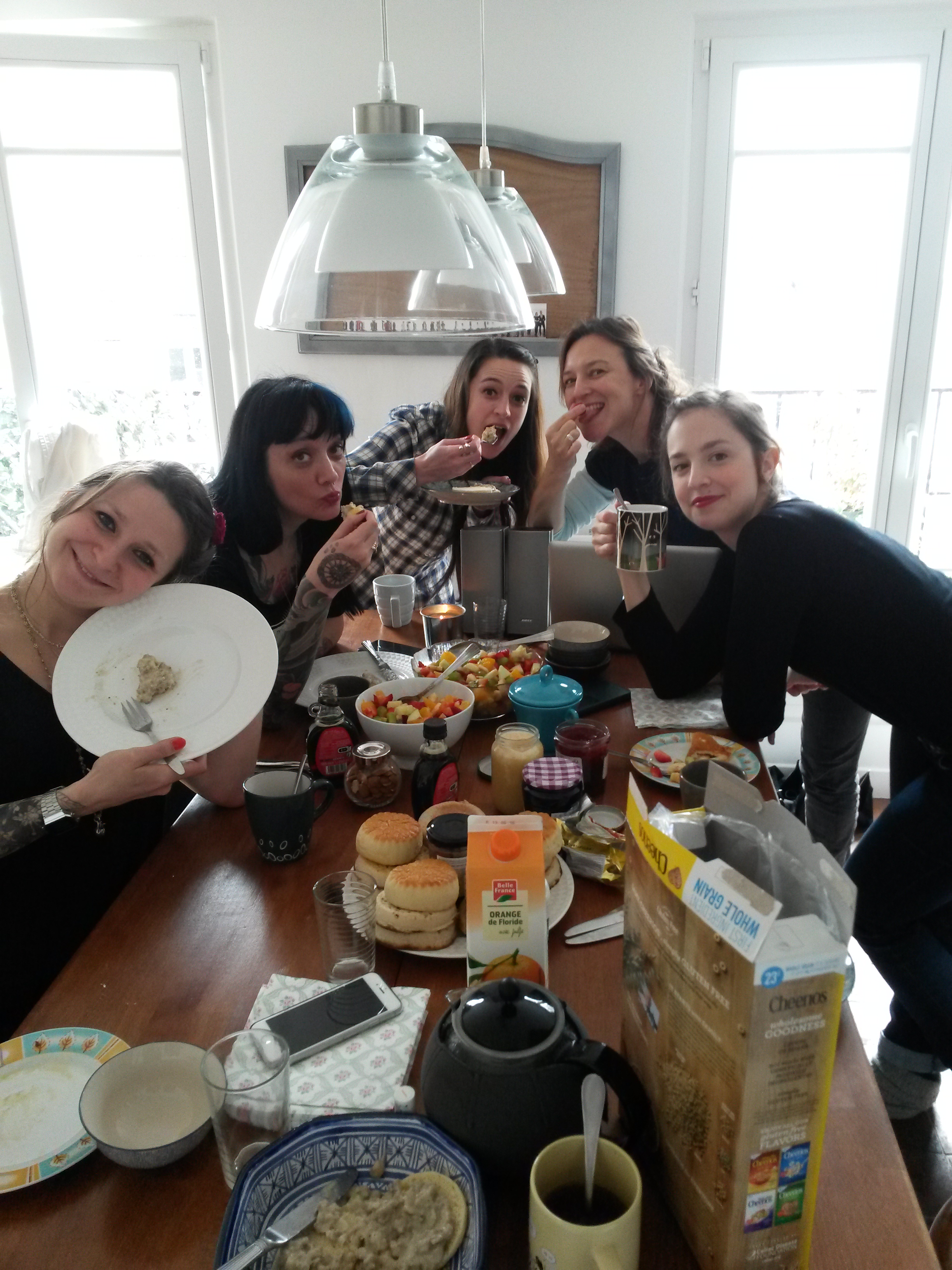 Marie s’est mise aux fourneaux, Steph touillait une pâte à pancakes, y’avait aussi de la salade fruits et des crumpets.