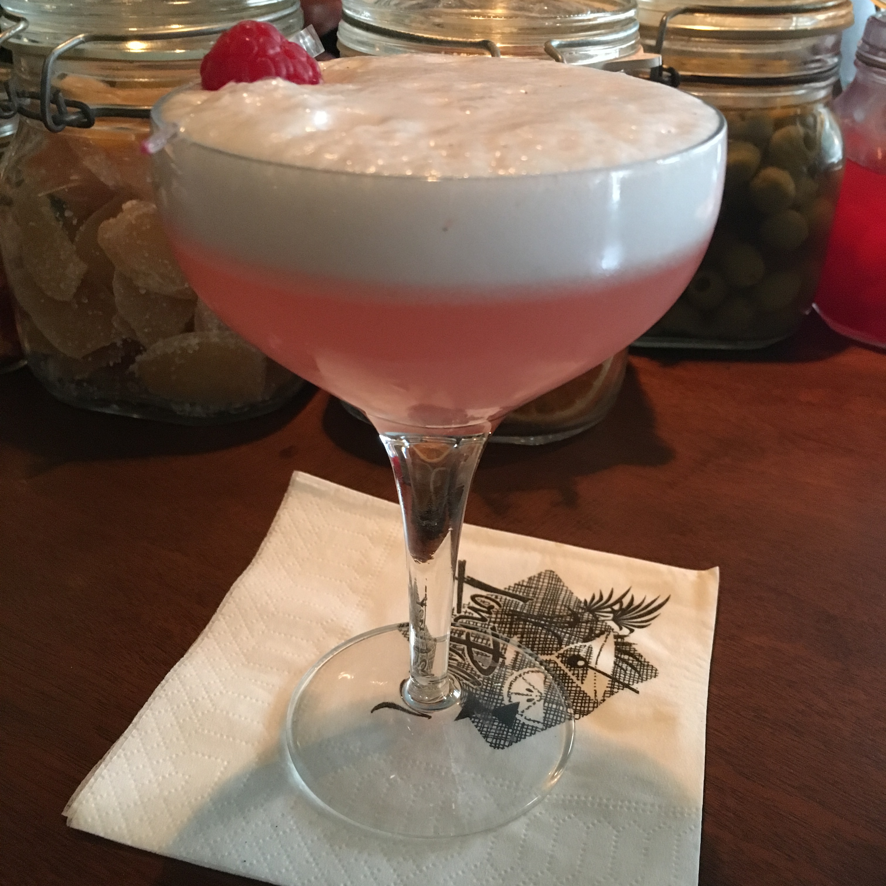 J’ai pris un « Clover Club », parce que dedans, il y a du gin, de la framboise et du blanc d’œuf shaké, ça avait l’air super. Et bien, c’était effectivement super.