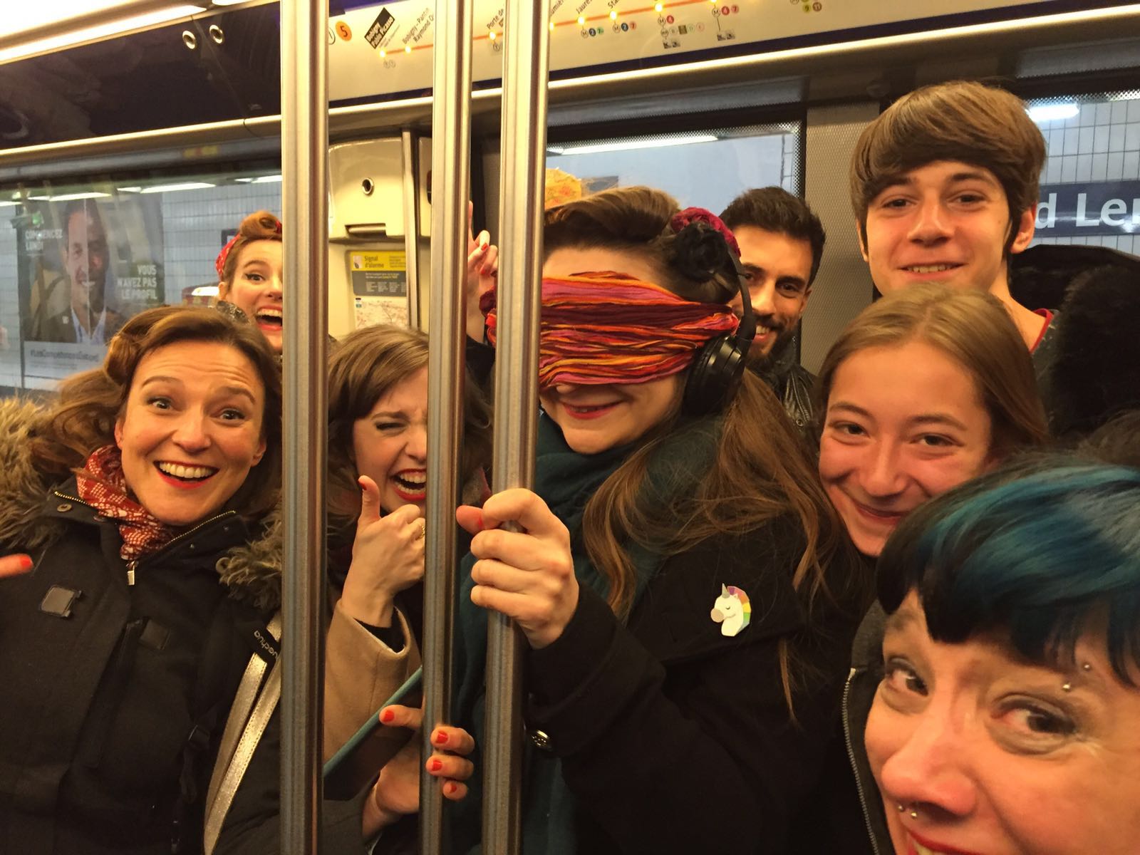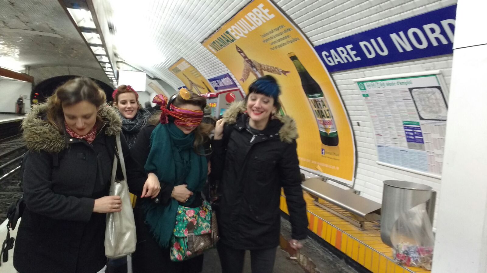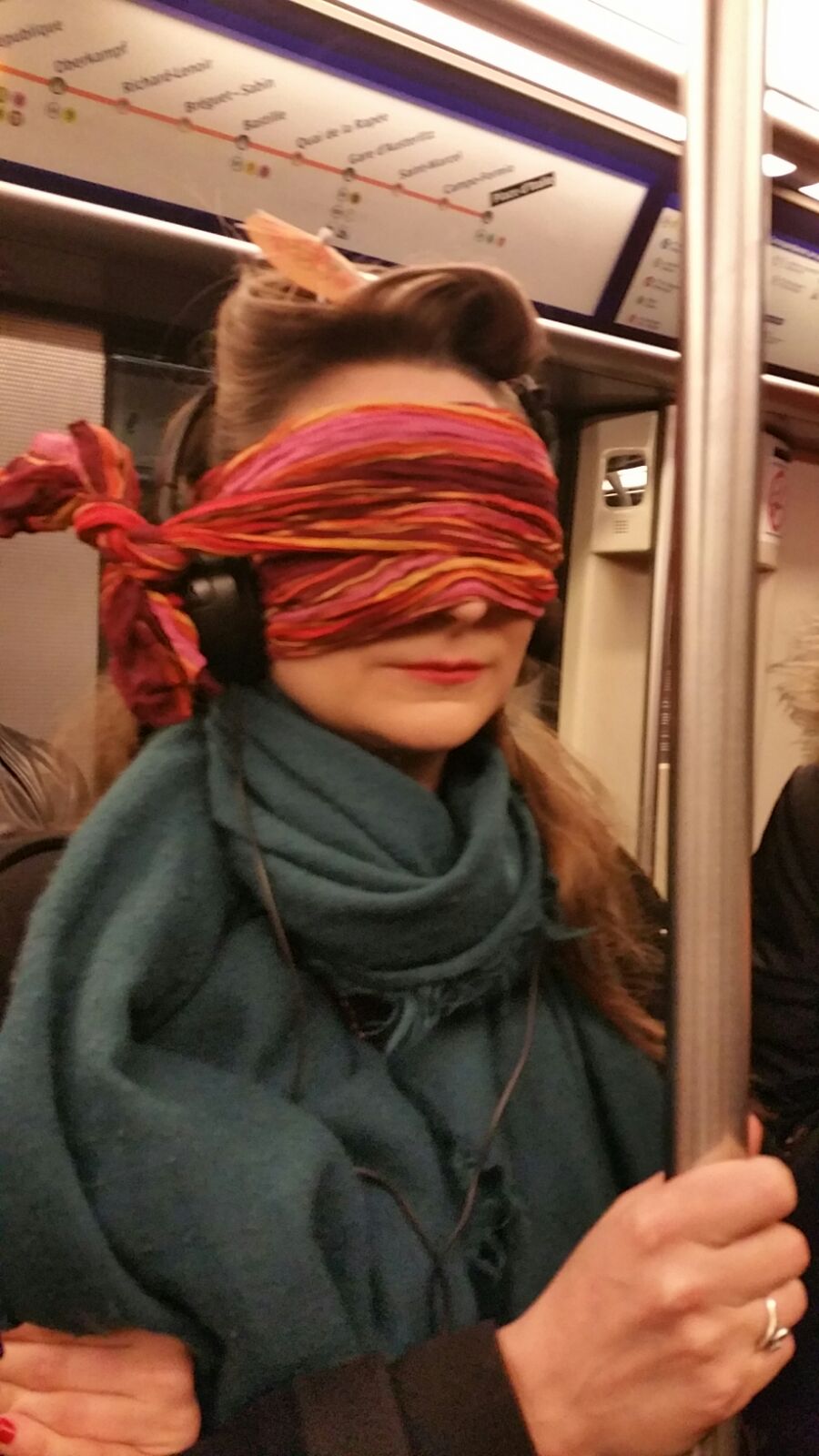 Je dois m’équiper, je ne vois plus rien, je n’entends plus rien du monde extérieur. La musique et le noir. Mon vertige se réveille, j’ai l’impression qu’il va y a avoir des trous partout et que je vais tomber. On se met à marcher. Je suis encadrée, et je serre les bras tendus comme jamais. De temps en temps, je sens mes guides vibrer, de rire. Haha, ah c’est marrant. On marche, on marche au moins mille ans. Je trouve qu’il n’y a pas beaucoup de trottoirs, je les soupçonne de me faire faire des tours de pâtés de maison. Je les sens rire et moi, je souris crispée. WWOOOOW, des escaliers. AAAAAAAH des escalators ! OH PUTAIN ON EST DANS LE MÉTRO ! Je trouve ça très dangereux, sachez-le. J’ai dû le dire, par dessus le noir et la musique « JE SUIS TRÈS INQUIÈTE HEIN ! ». Elles n’en ont vibré que plus fort. Surtout Jojo.