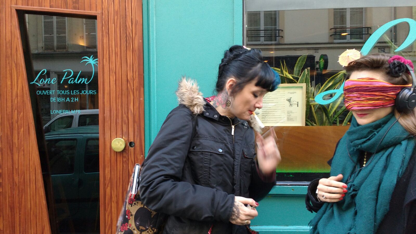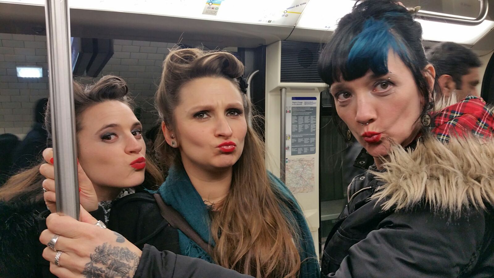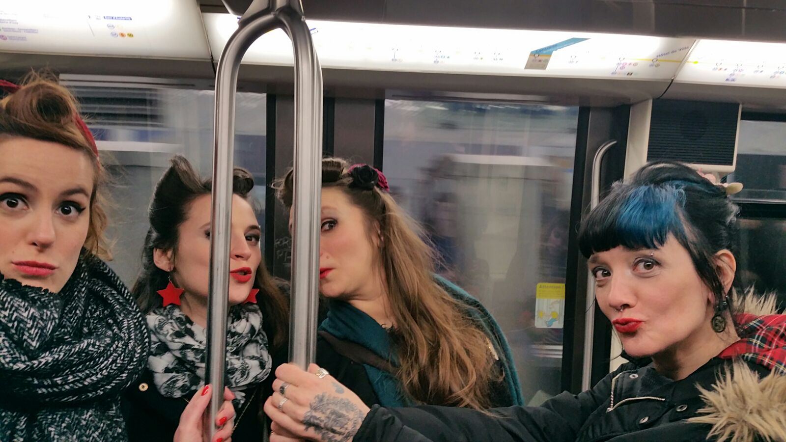 Je dois m’équiper, je ne vois plus rien, je n’entends plus rien du monde extérieur. La musique et le noir. Mon vertige se réveille, j’ai l’impression qu’il va y a avoir des trous partout et que je vais tomber. On se met à marcher. Je suis encadrée, et je serre les bras tendus comme jamais. De temps en temps, je sens mes guides vibrer, de rire. Haha, ah c’est marrant. On marche, on marche au moins mille ans. Je trouve qu’il n’y a pas beaucoup de trottoirs, je les soupçonne de me faire faire des tours de pâtés de maison. Je les sens rire et moi, je souris crispée. WWOOOOW, des escaliers. AAAAAAAH des escalators ! OH PUTAIN ON EST DANS LE MÉTRO ! Je trouve ça très dangereux, sachez-le. J’ai dû le dire, par dessus le noir et la musique « JE SUIS TRÈS INQUIÈTE HEIN ! ». Elles n’en ont vibré que plus fort. Surtout Jojo.