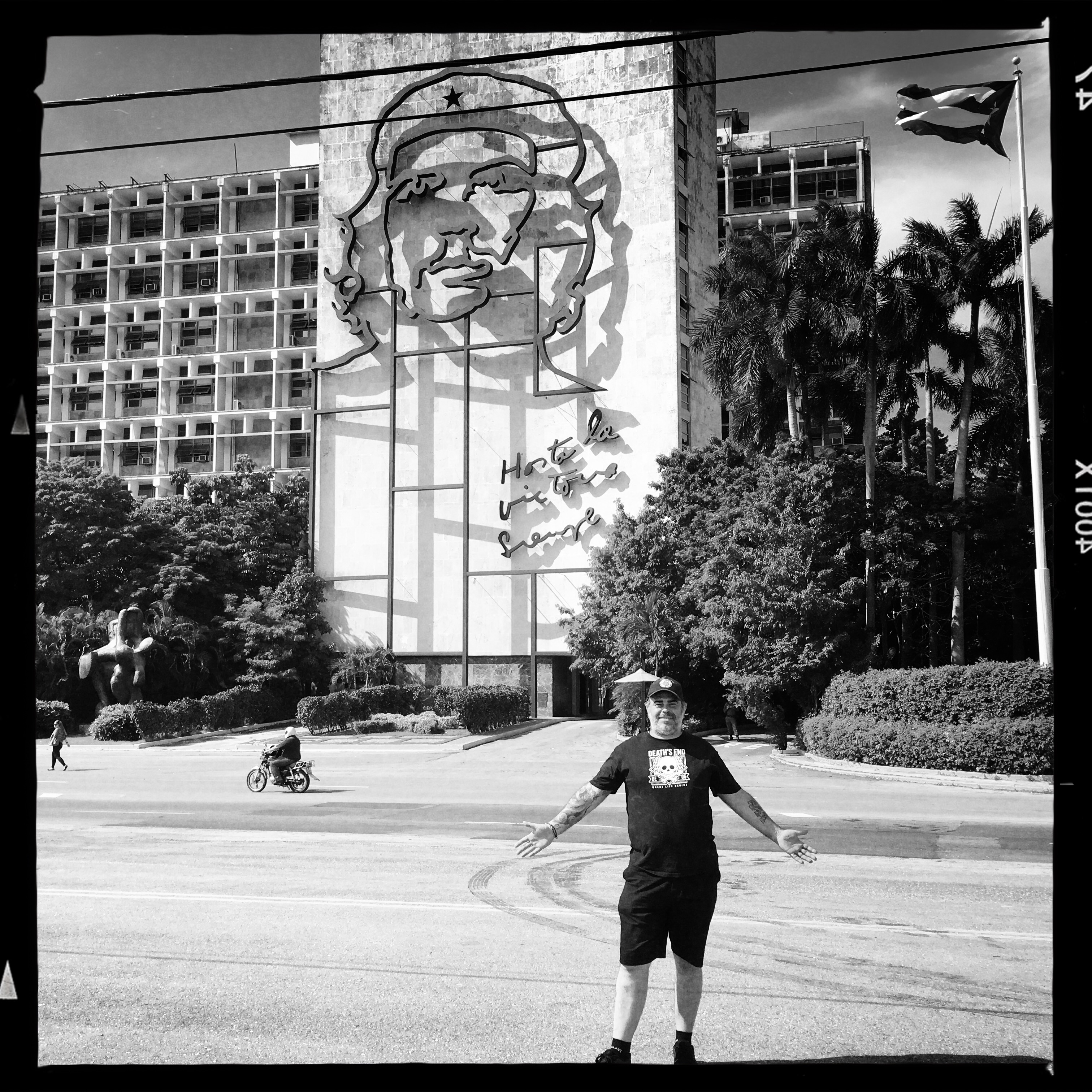On arrive sur la place : une douzaine de touriste éparpillés. Fidel et le Che dominent depuis leurs murs arty. On fait la photo classique, c’est important. Manu est ému, il le dit, et ça se voit.