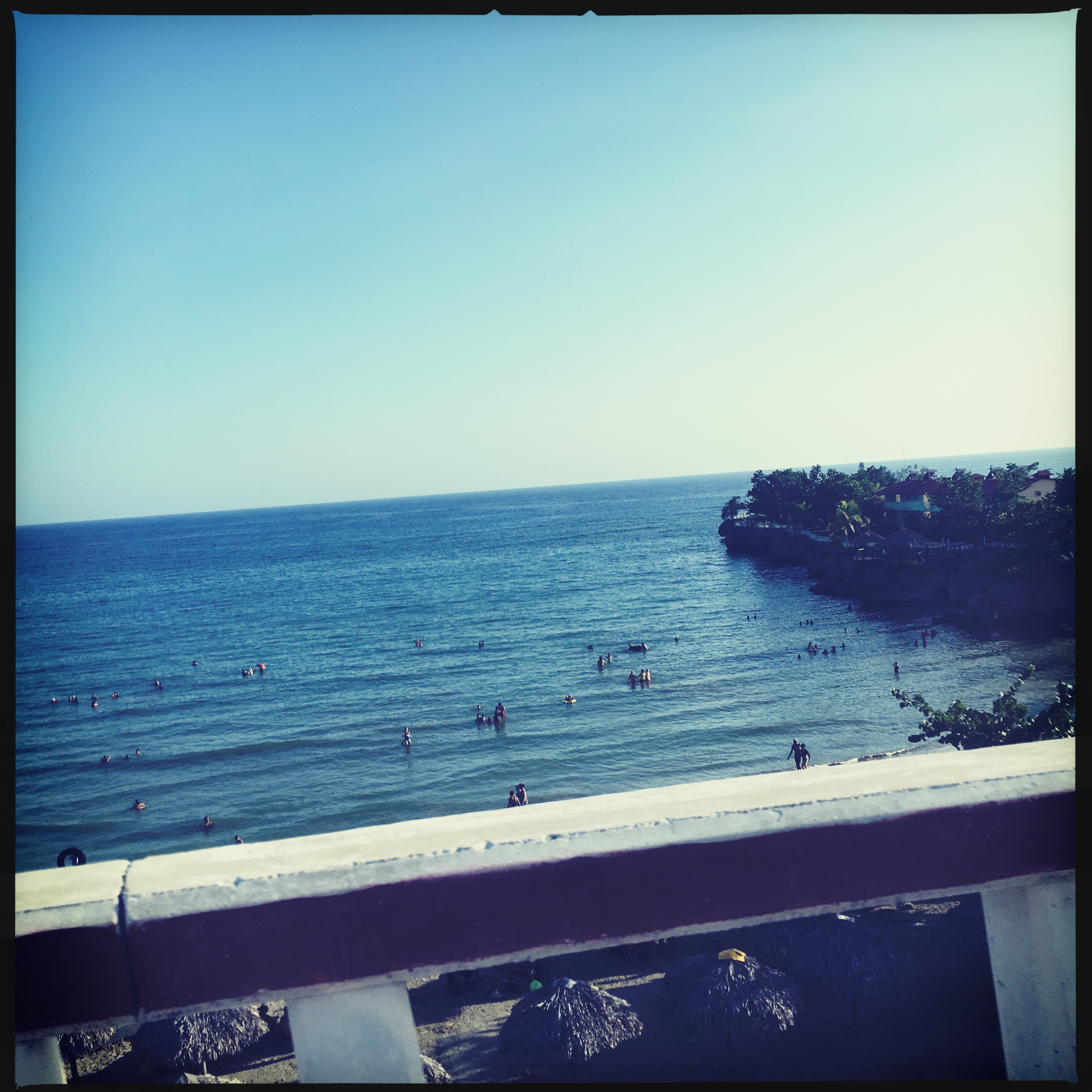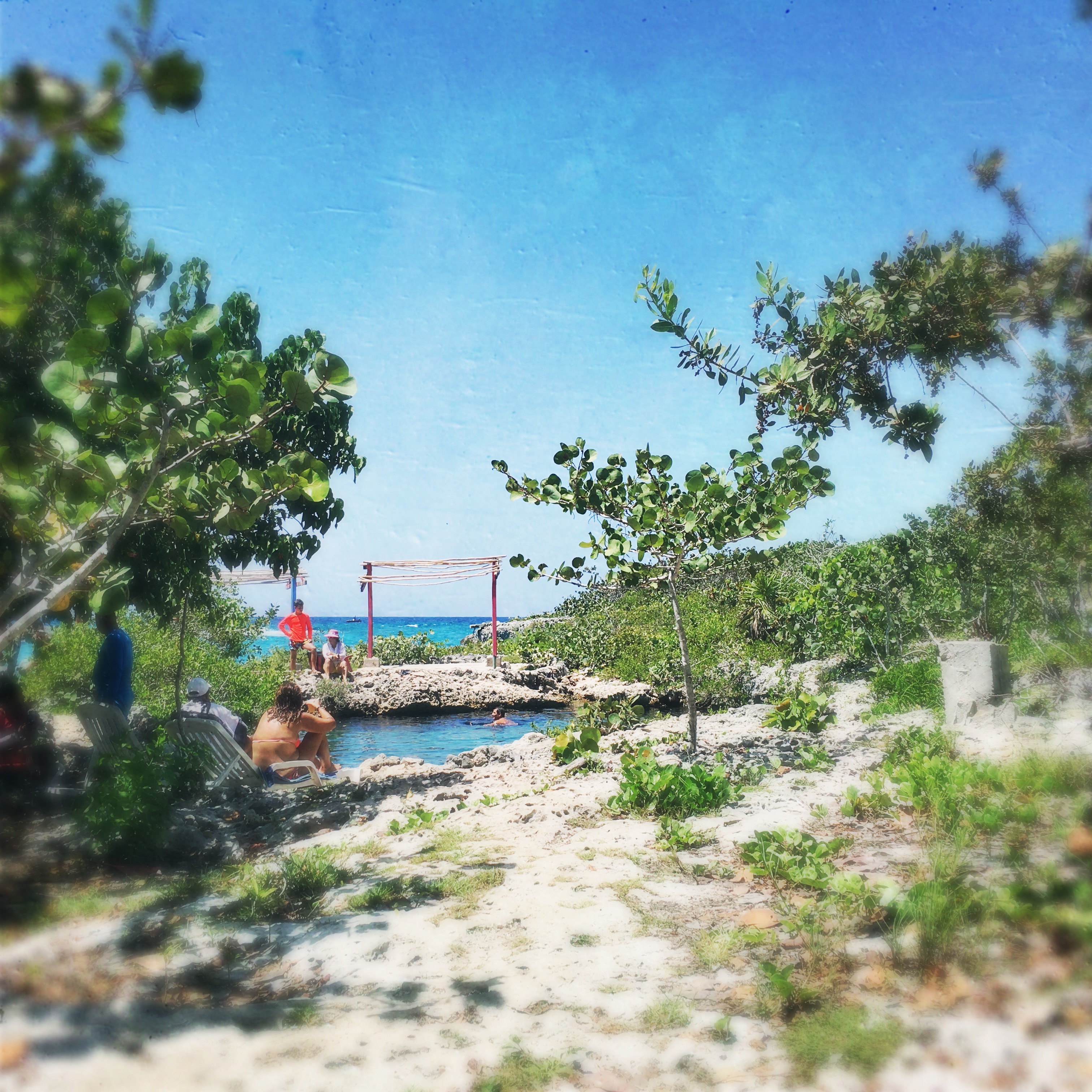 Un grand panneau affriolant nous accueille, posage de voiture, et nous payons l’entrée. C’est 15 CUC, boissons, bouffe à volonté, transat à dispo, mais surtout : le lieu. C’est magnifique, plusieurs criques où l’océan s’engouffre en faisant pfrrchrou pffrchou (je fais mieux l’océan que je ne parle espagnol, t’as vu ?).