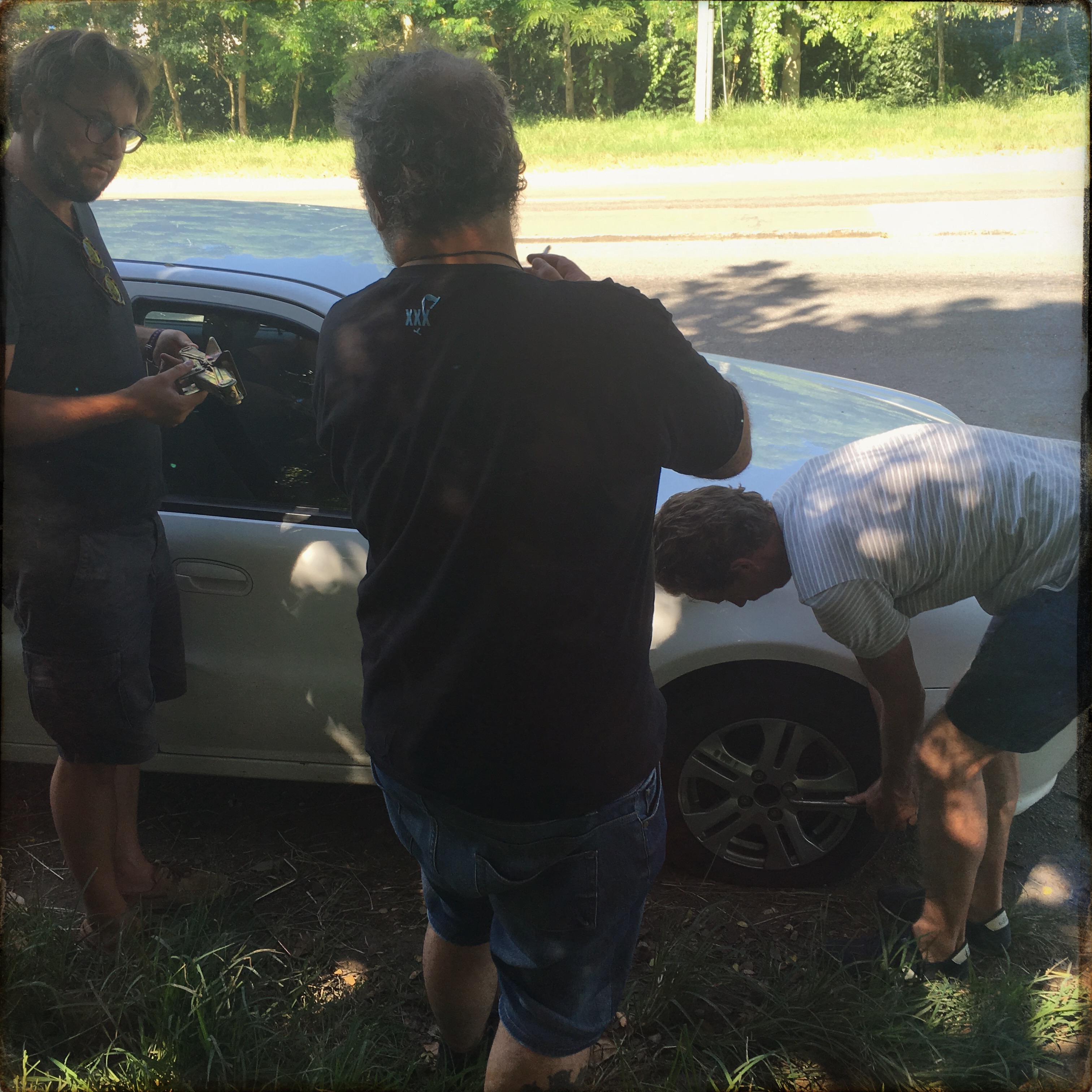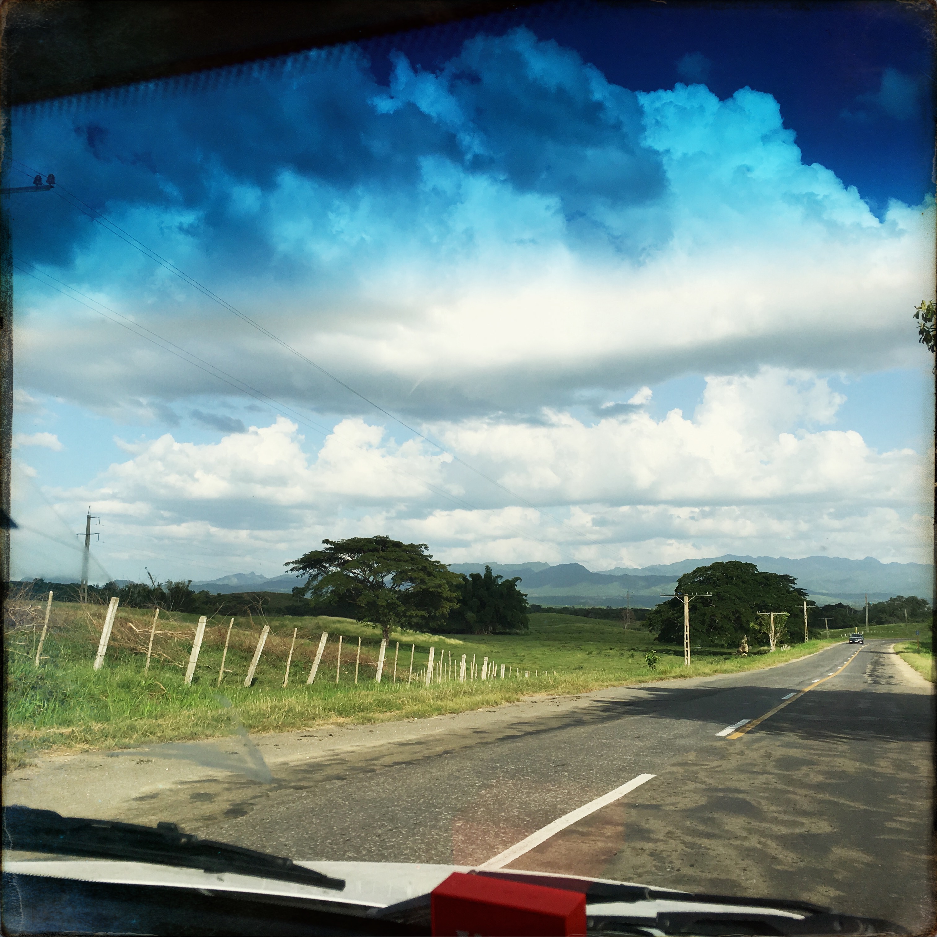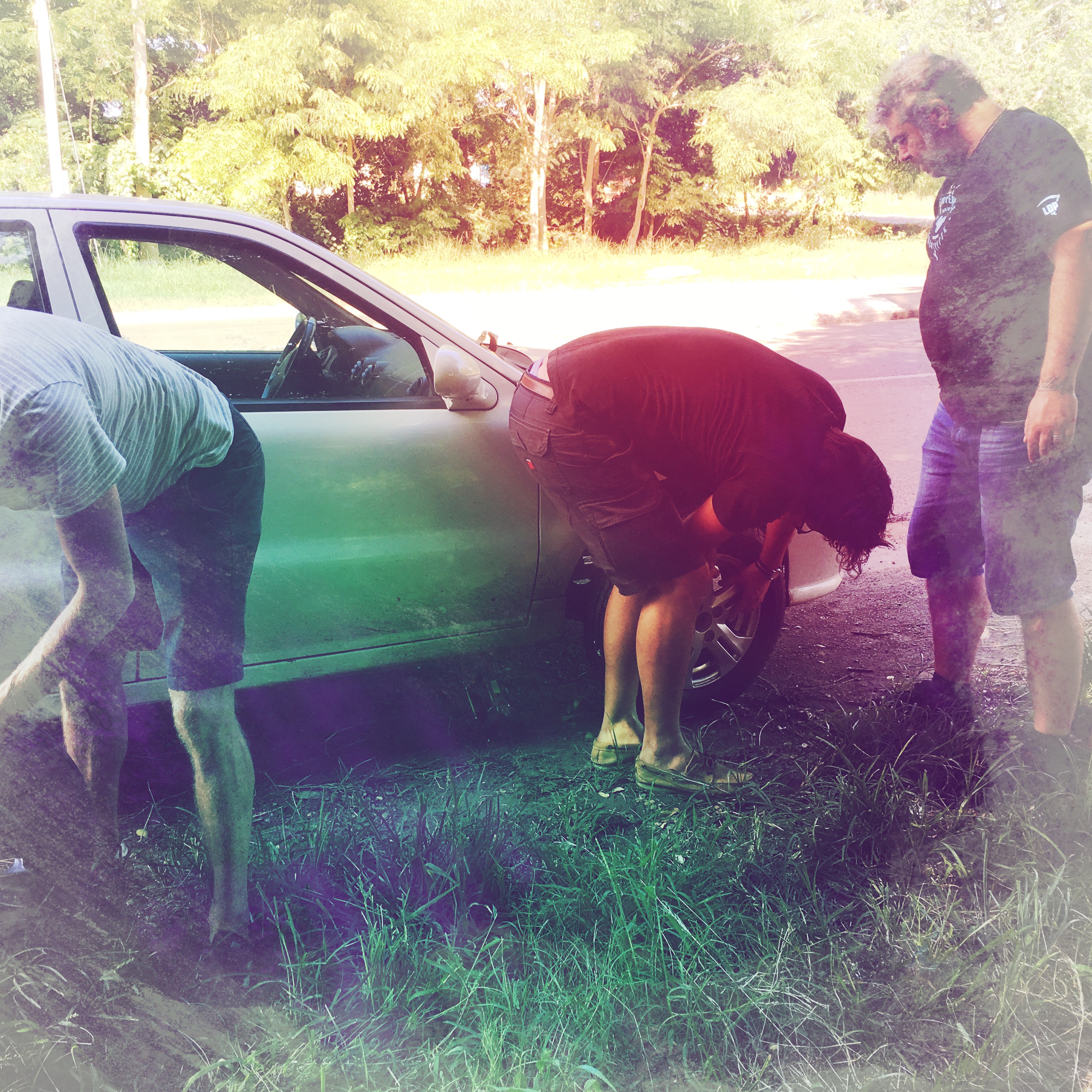 Ce qui devait arriver arriva. Enfin non, ça n’aurait pas dû, mais hé. Sur la to do list : crève un pneu à Cuba : c’est bon, c’est fait. En entrant dans Cienfuegos, un type en bagnole nous fait signe, force est de constater que le pneu avant droit est à plat. Arrête au bord de la route comme on peut. Il y a bien un pneu neuf dans le coffre. A trois, ils ont sué sang et eau pour faire monter notre voiture chinoise sur le cric chinois. La barre se tord, tout est retors. 20 minutes plus tard, le pneu est changé, tout le monde est un peu fier (moi moins, je me suis contenté de lire le contrat pour voir ce que ça allait nous coûter, je n’ai pas trouvé), et tout monde sent un peu mauvais. ❤ Hihi. On reprend la route, en écoutant chaque grincement de la voiture. Je pense que silencieusement, on se dit tous que la voiture en plastique appelée Geely va tomber en morceau au prochain carrefour. On met de la musique pour couvrir les bruits louches.