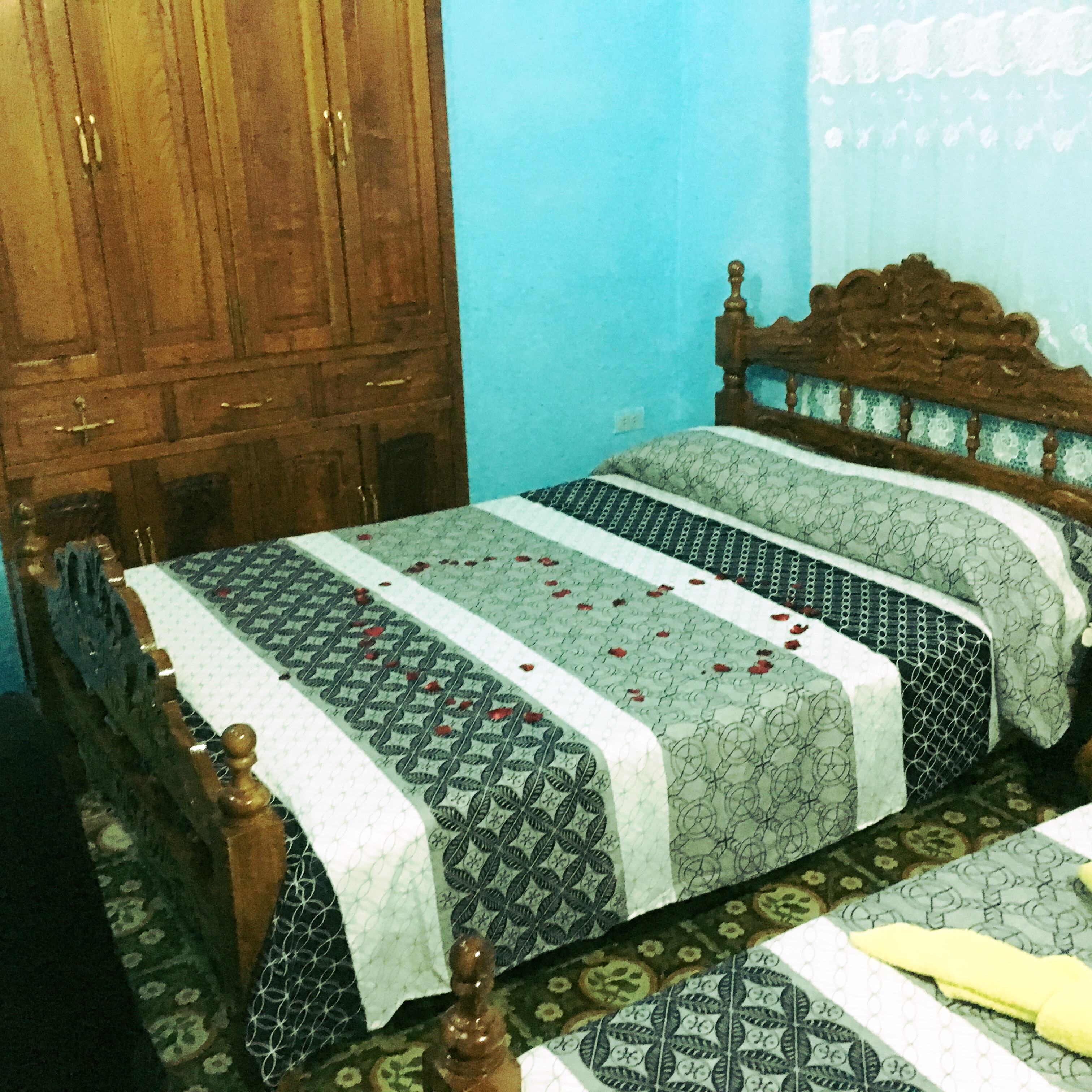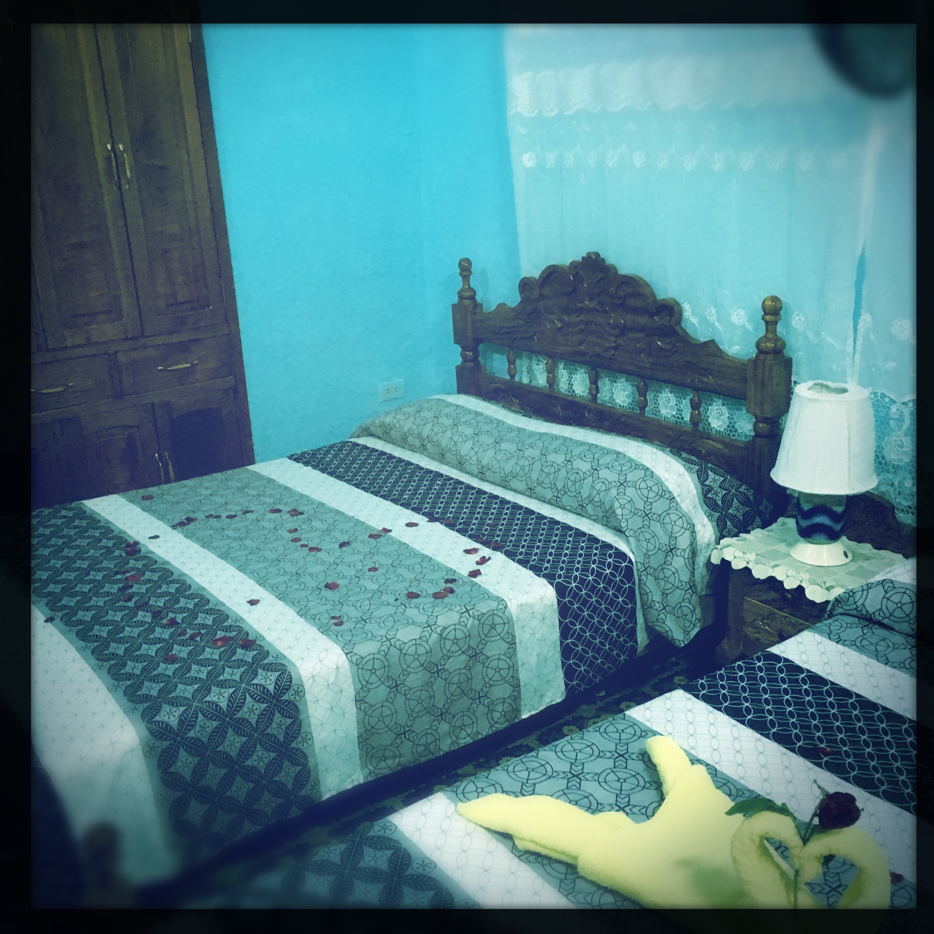 Aliuska nous attend sur le pas de la porte. Sa maison est une vieille maison coloniale magnifique. Elle a un an de moins que moi (elle me l’a dit en regardant la date de mon passeport). J’avais précisé que nous étions en lune de miel dans mes mails. Dans la chambre nous attendent des pétales de rose disposés en forme de cœur sur le lit, et les cygnes en serviettes de bain tiennent une rose entre leurs becs. C’est ultra mignon. Notre hôtesse sort une bouteille de cidre, et est remplit d’enthousiasme, c’est formidable. Elle se marie en décembre, je comprends mieux J