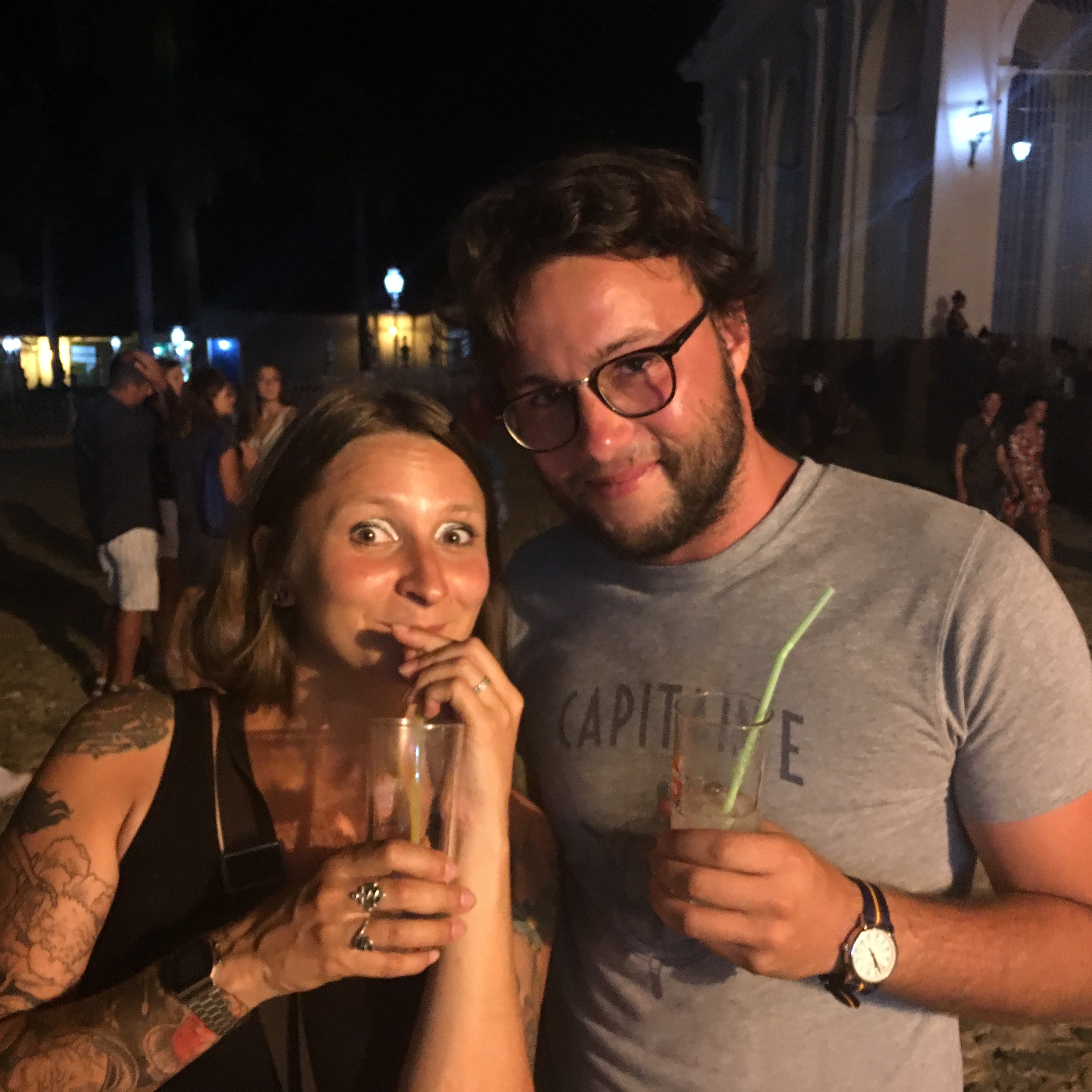 Nous retrouvons nos compagnons de route sur la place, on va boire un verre dans un bar (La Canchachara), puis un autre sur la place principale, près de la Casa de la Musica. Il y a des rabatteurs à mojitos un peu partout, qui viennent alpaguer la foule pour leur faire boire des cocktails à 3 CUC. On cause encore un peu, on s’échange nos FB pour garder contact, car il faut bien l’admettre, on est bien crevo de cette longo journo.