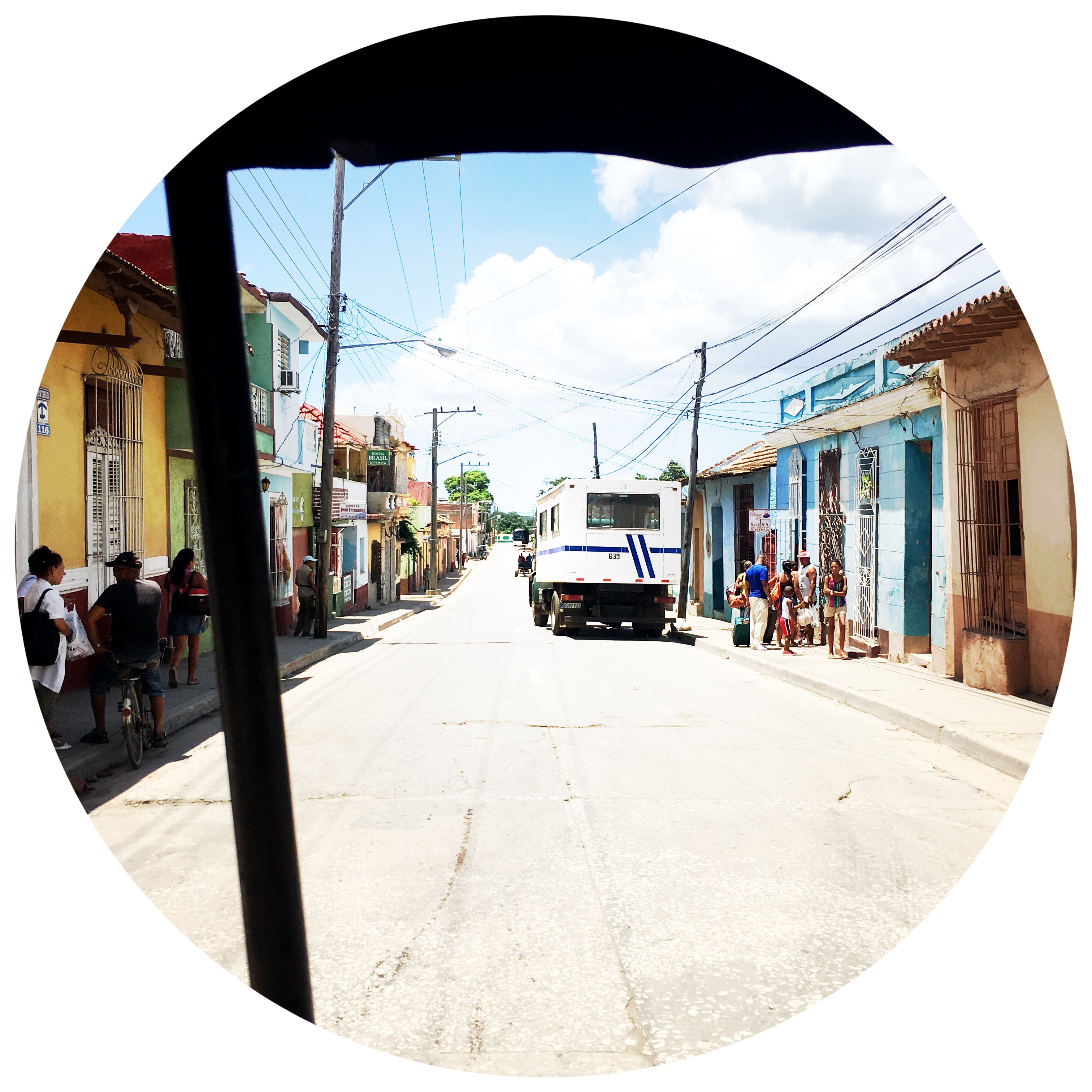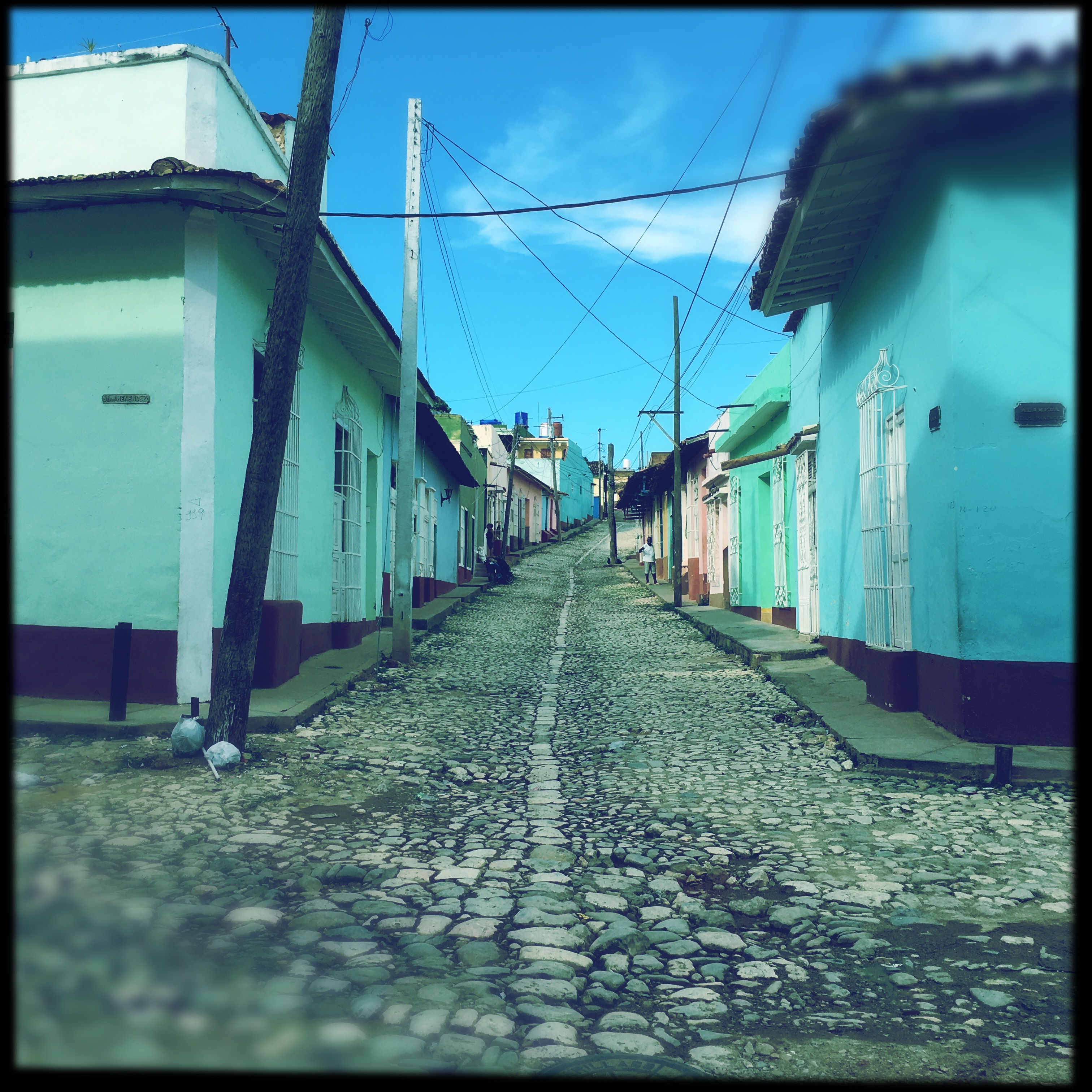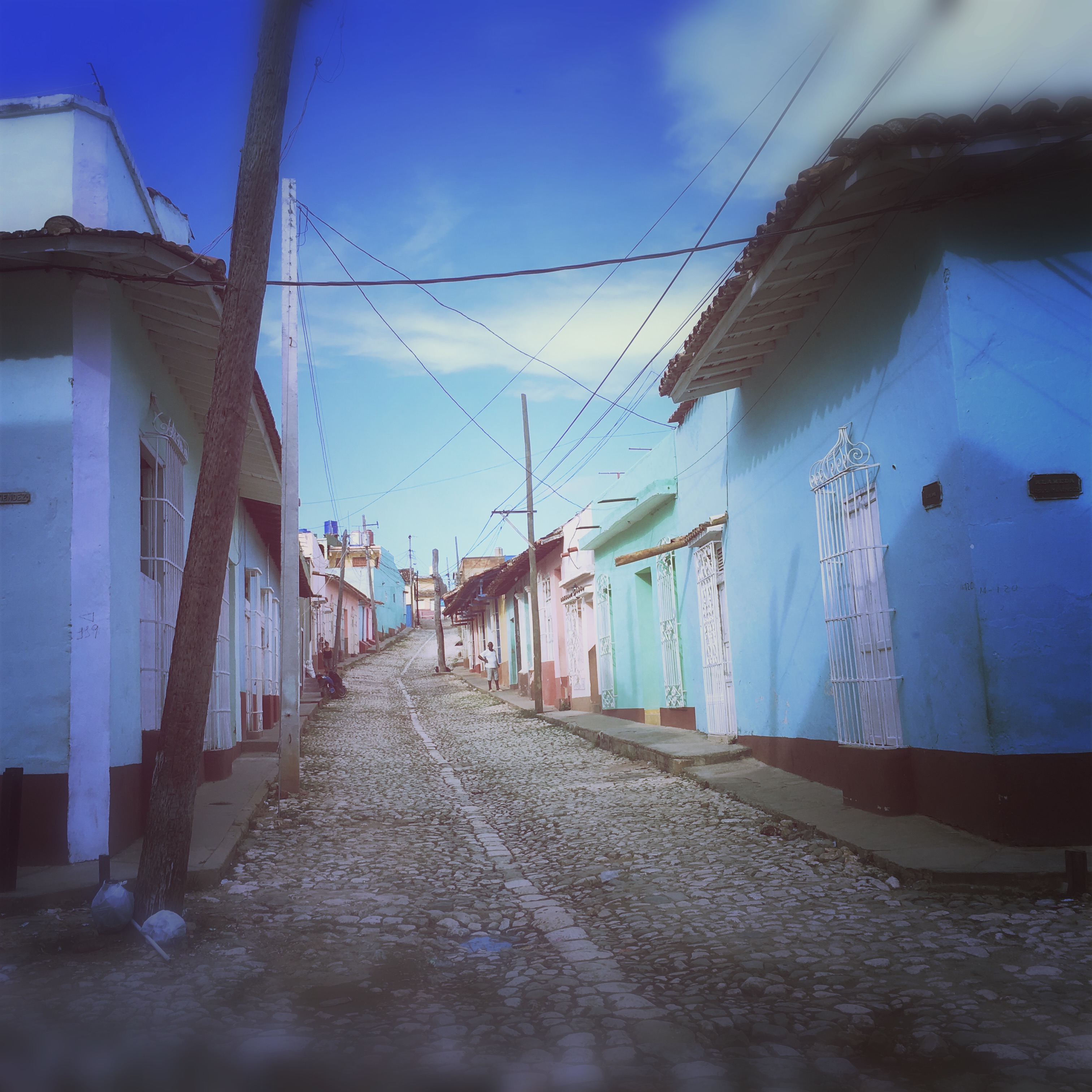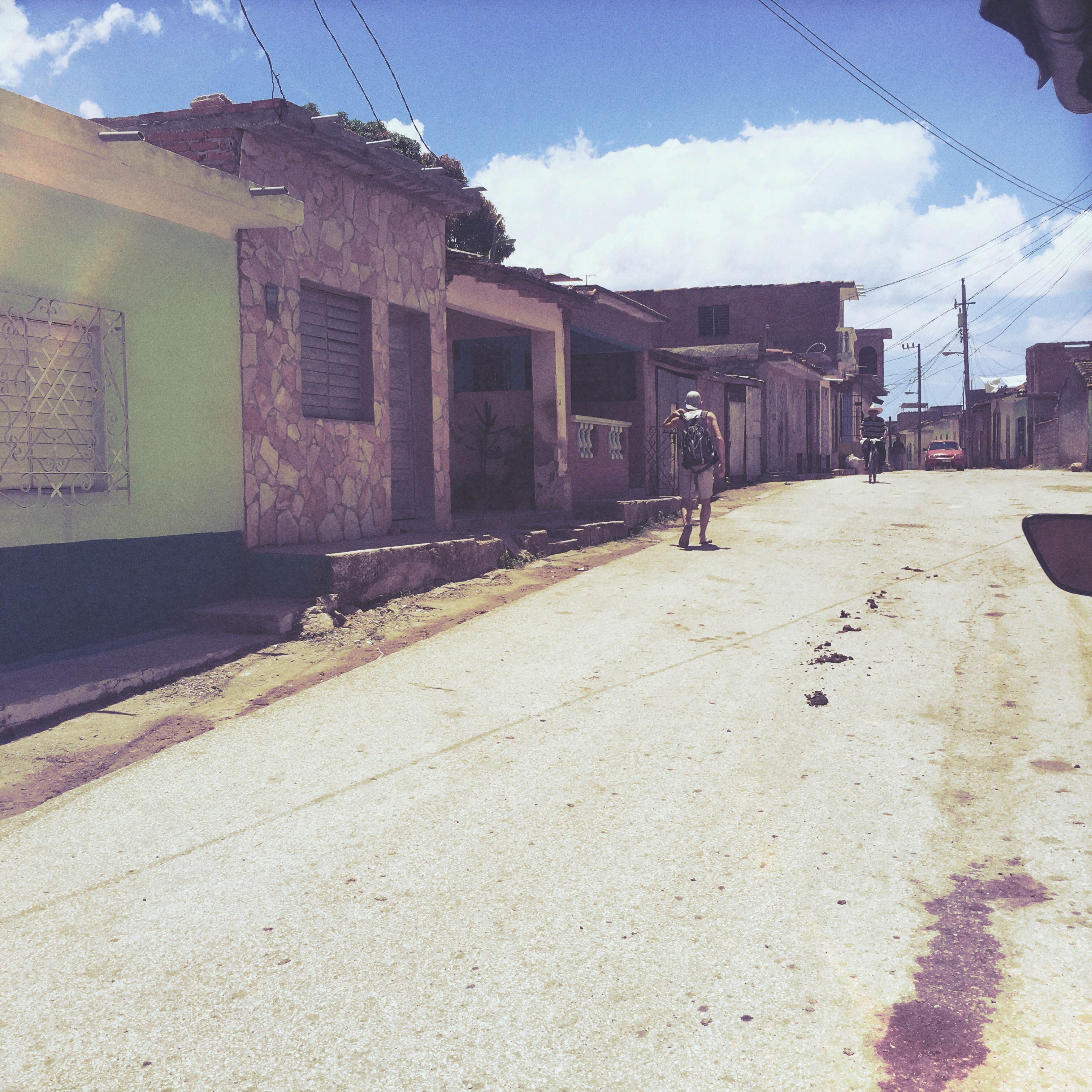 Il est 9h, le cowboy du jour passe me prendre. On part donc tous les deux en vélo-taxi, un gros tricycle avec un toit, qui semble excessivement fatigant à conduire. Zéro optimisation du coup de pédale. On traverse la ville. Trinidad est très différente de La Havane, encore plus de Vinalès ou de Playa Larga. Les routes sont pavées, c’est très chaotique. Dans le Routard, il était dit de jeter un œil à l’intérieur des maisons, en lisant, j’avais trouvé ça plutôt grossier comme suggestion. Mais en passant devant les maisons, le regard traine… Là aussi, c’est hors du temps, le mobilier semble ne jamais avoir bougé. Il y a souvent des rocking chair, des vieilles photos, des lustres un peu fou. Les maisons sont de toutes les couleurs, les gens semblent plus détendus ici, quelques sollicitations, mais ça va.