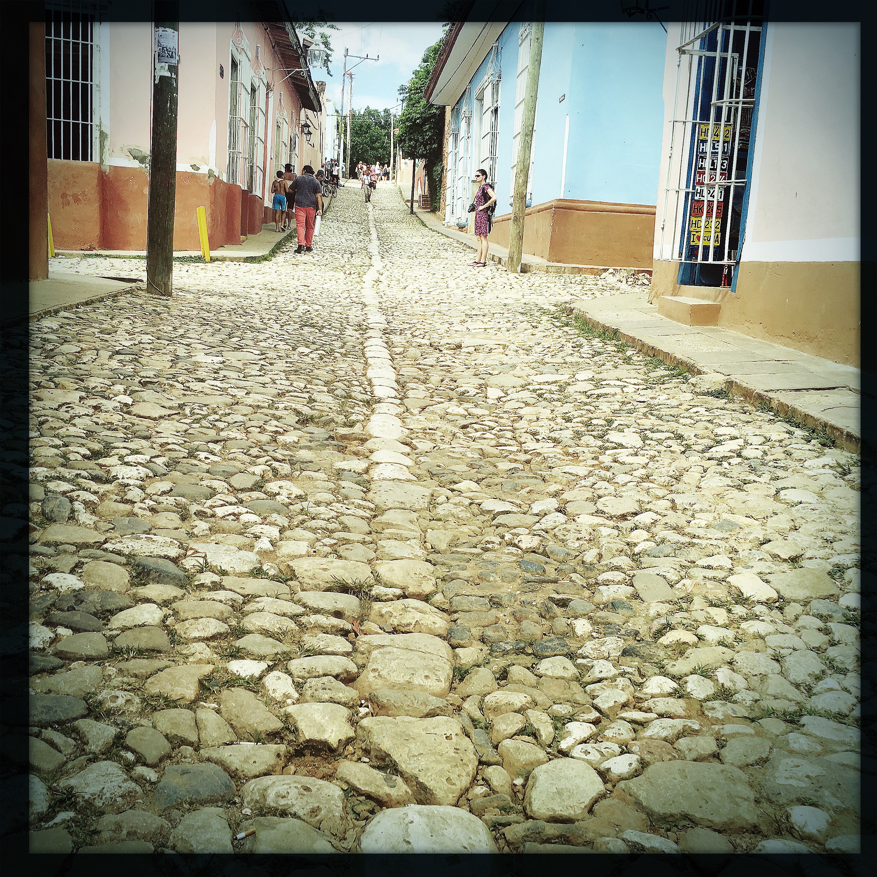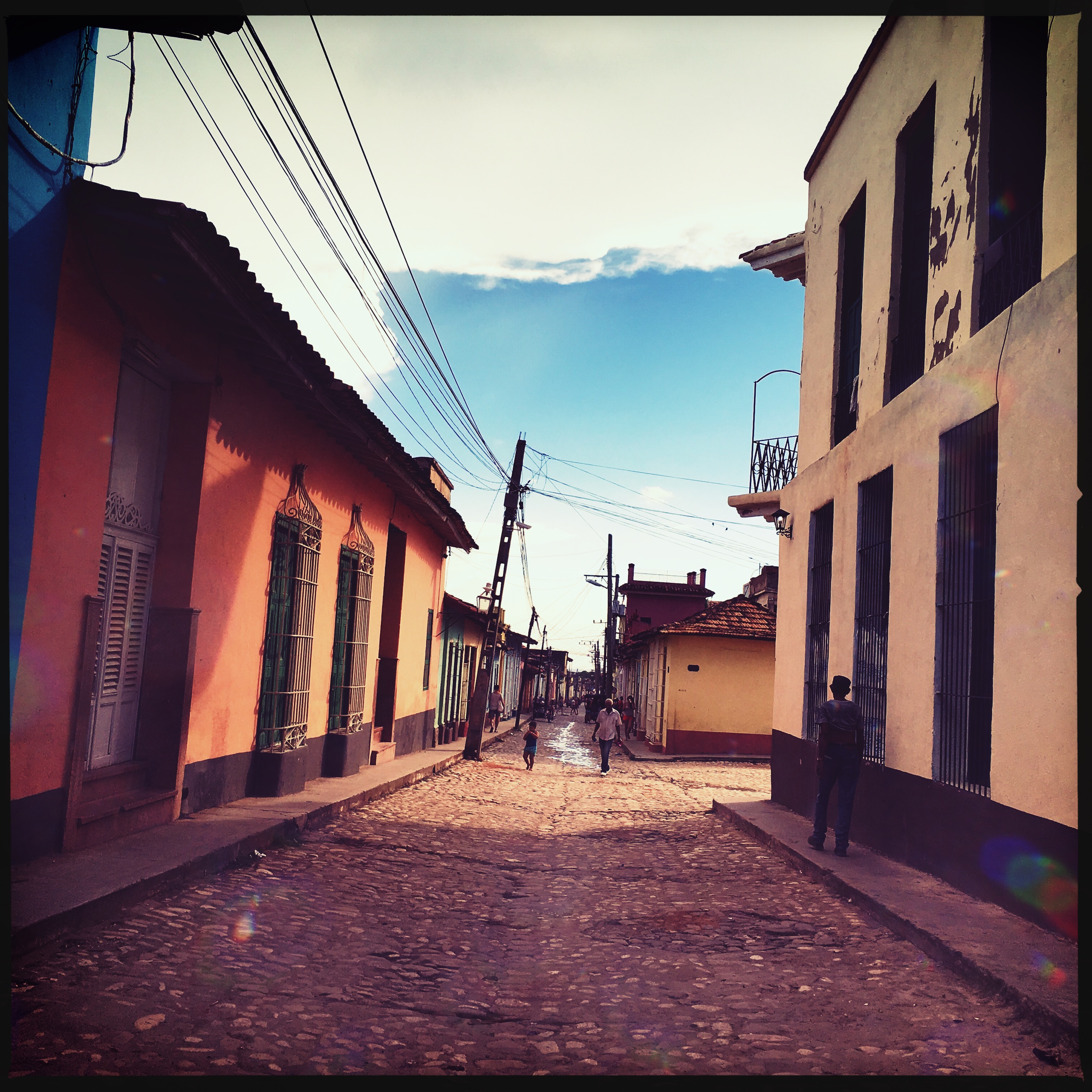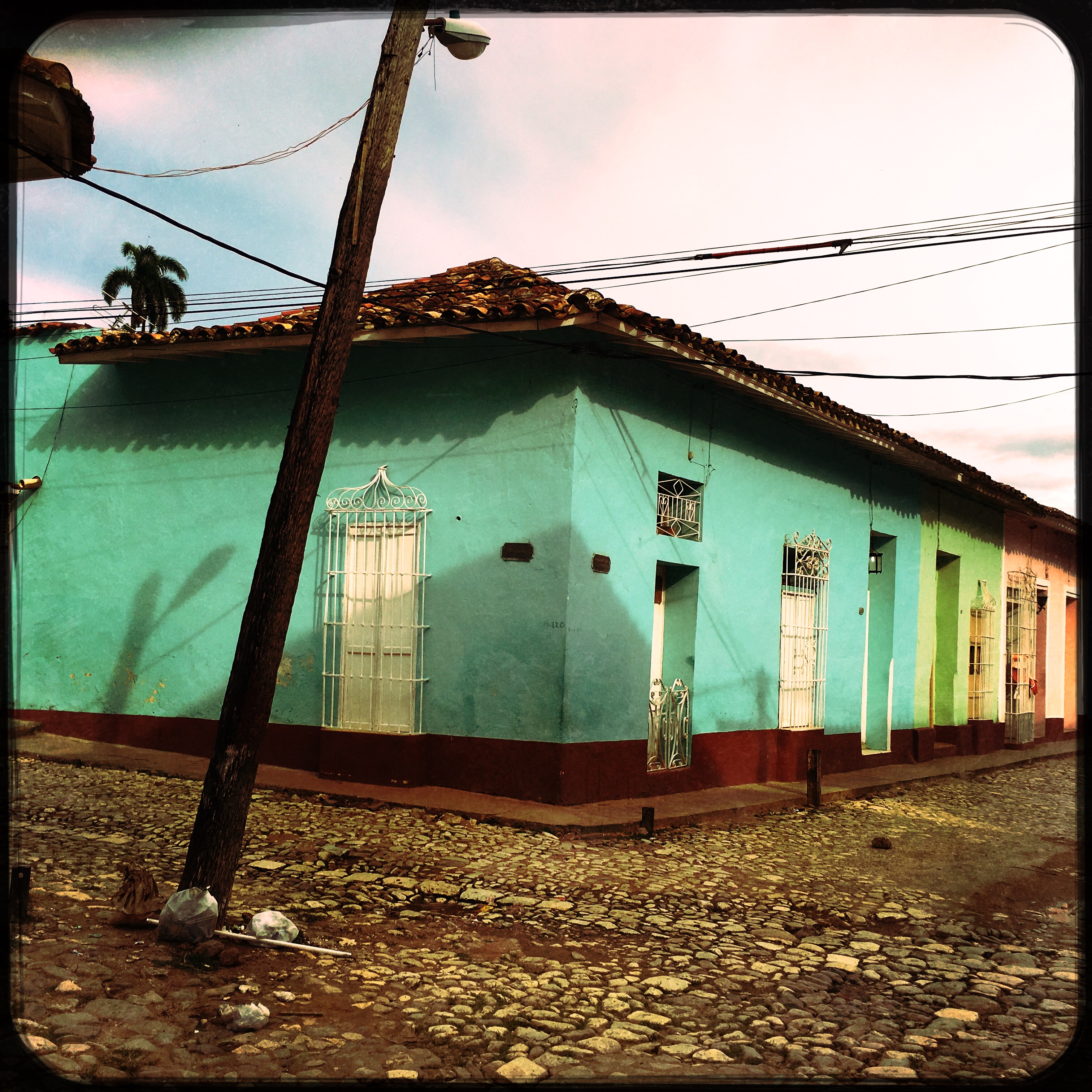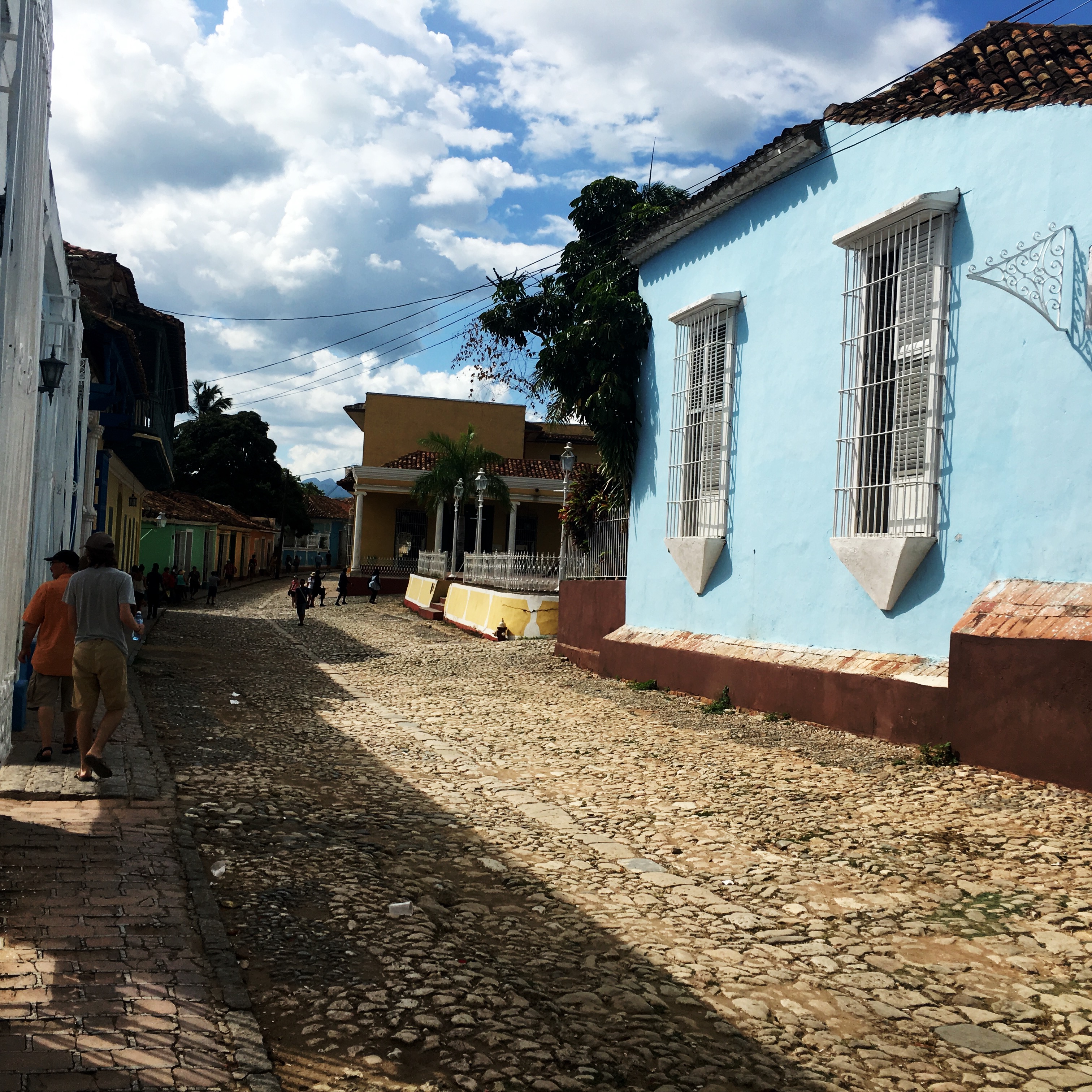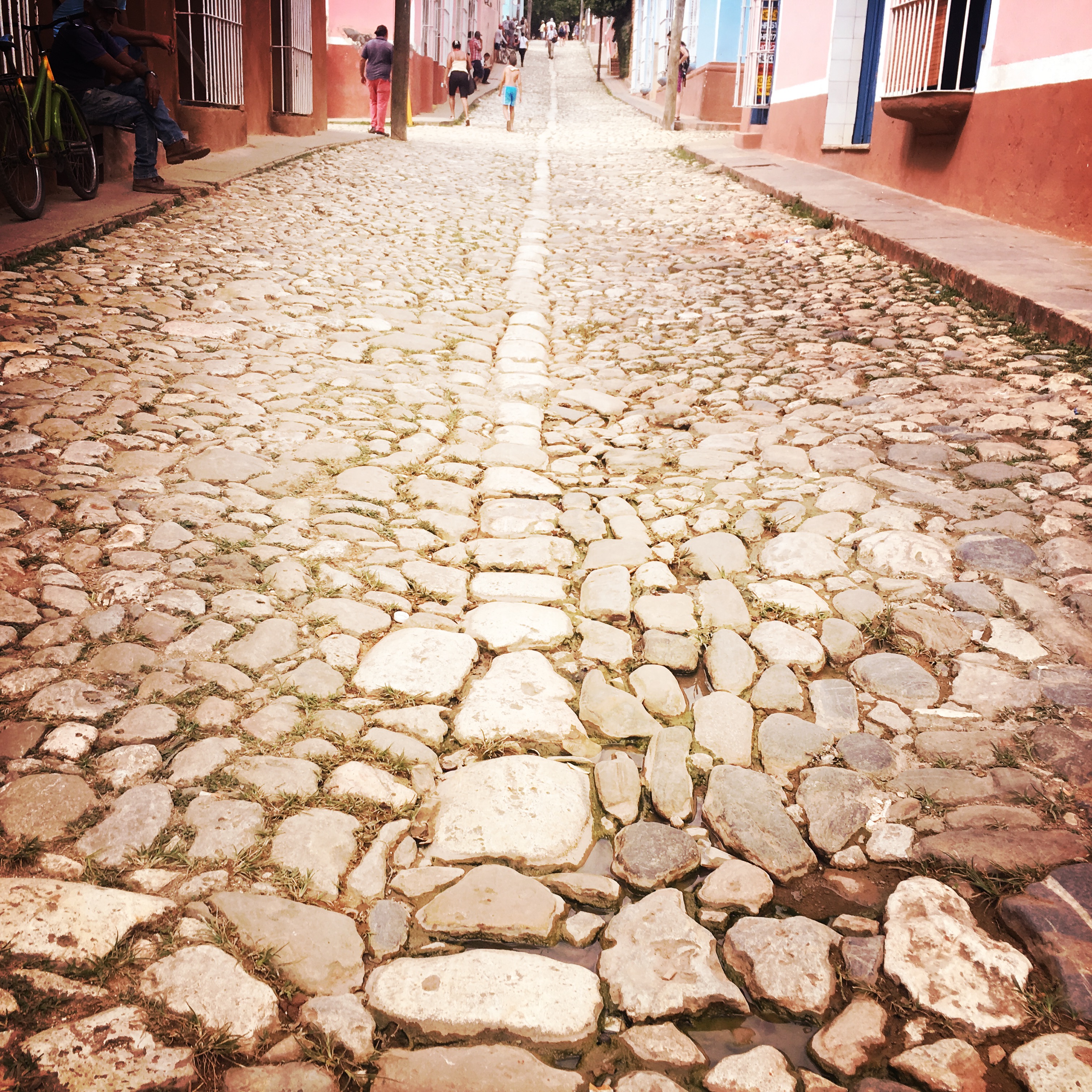 Il est 9h, le cowboy du jour passe me prendre. On part donc tous les deux en vélo-taxi, un gros tricycle avec un toit, qui semble excessivement fatigant à conduire. Zéro optimisation du coup de pédale. On traverse la ville. Trinidad est très différente de La Havane, encore plus de Vinalès ou de Playa Larga. Les routes sont pavées, c’est très chaotique. Dans le Routard, il était dit de jeter un œil à l’intérieur des maisons, en lisant, j’avais trouvé ça plutôt grossier comme suggestion. Mais en passant devant les maisons, le regard traine… Là aussi, c’est hors du temps, le mobilier semble ne jamais avoir bougé. Il y a souvent des rocking chair, des vieilles photos, des lustres un peu fou. Les maisons sont de toutes les couleurs, les gens semblent plus détendus ici, quelques sollicitations, mais ça va.