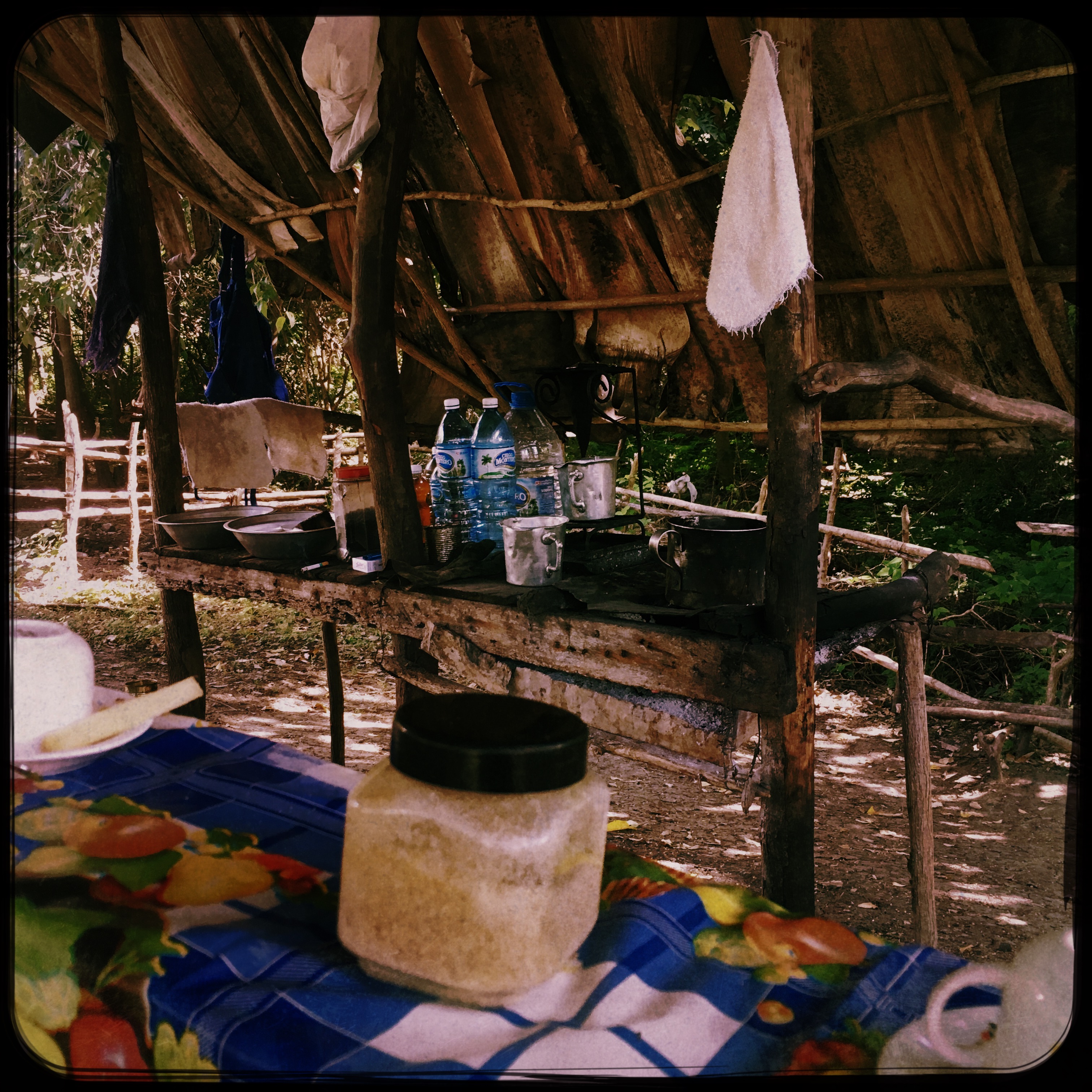 Ah, on s’arrête encore. Un comptoir improvisé, là aussi, au milieu de rien, mais à l’ombre, avec des petites tasses à café, et des bouteilles de miel disposées tout autour. Je suis invitée à m’asseoir, le monsieur du comptoir en feuilles de palme commence son spectacle. Qu’il interrompt assez vite, car un groupe arrive. Je préfère, cela m’évite d’être le centre d’attention. (Une américaine bondinette fait partie du groupe fraichement arrivée, elle se fera appeler Shakira par le monsieur sans cesse. Je l’ai échappée belle).