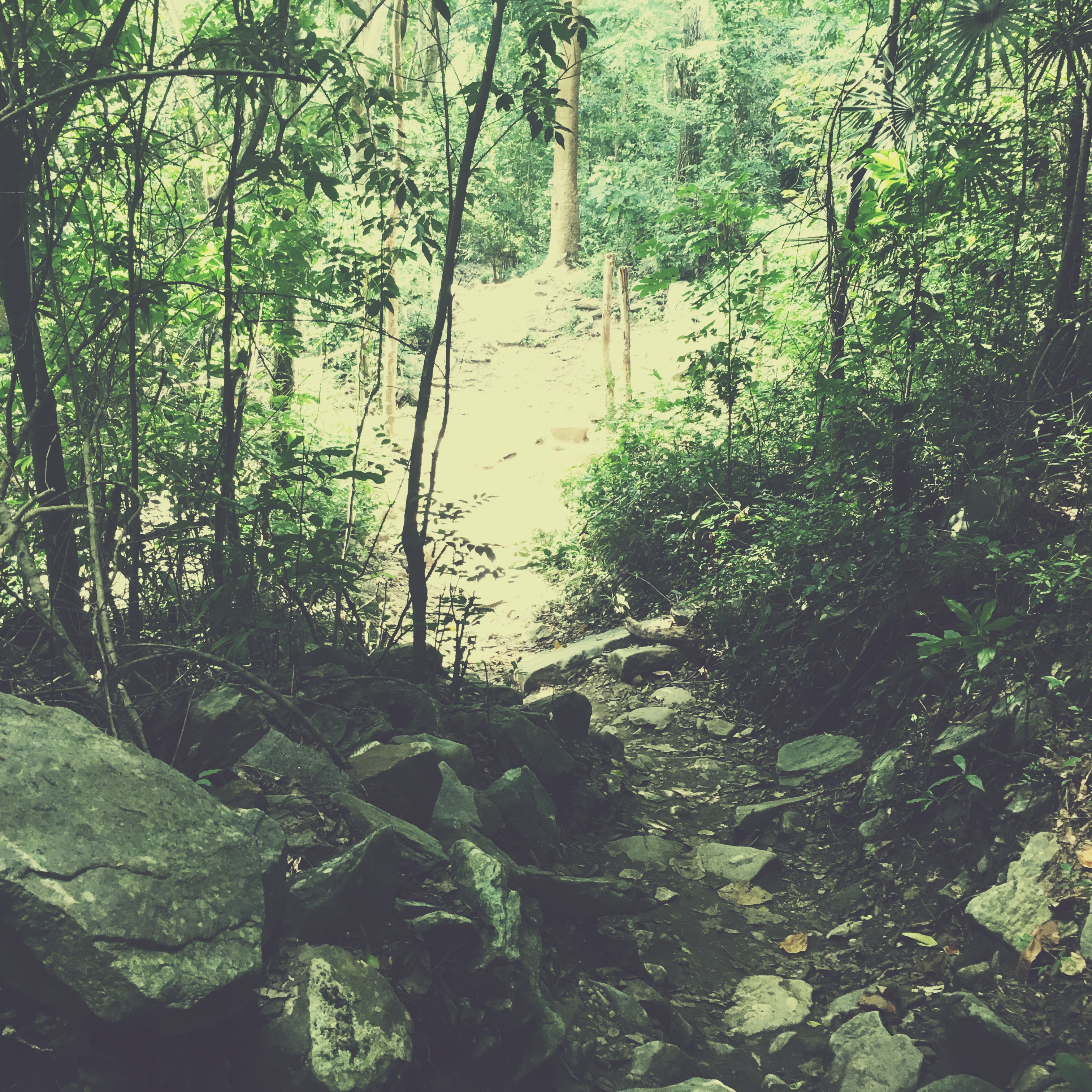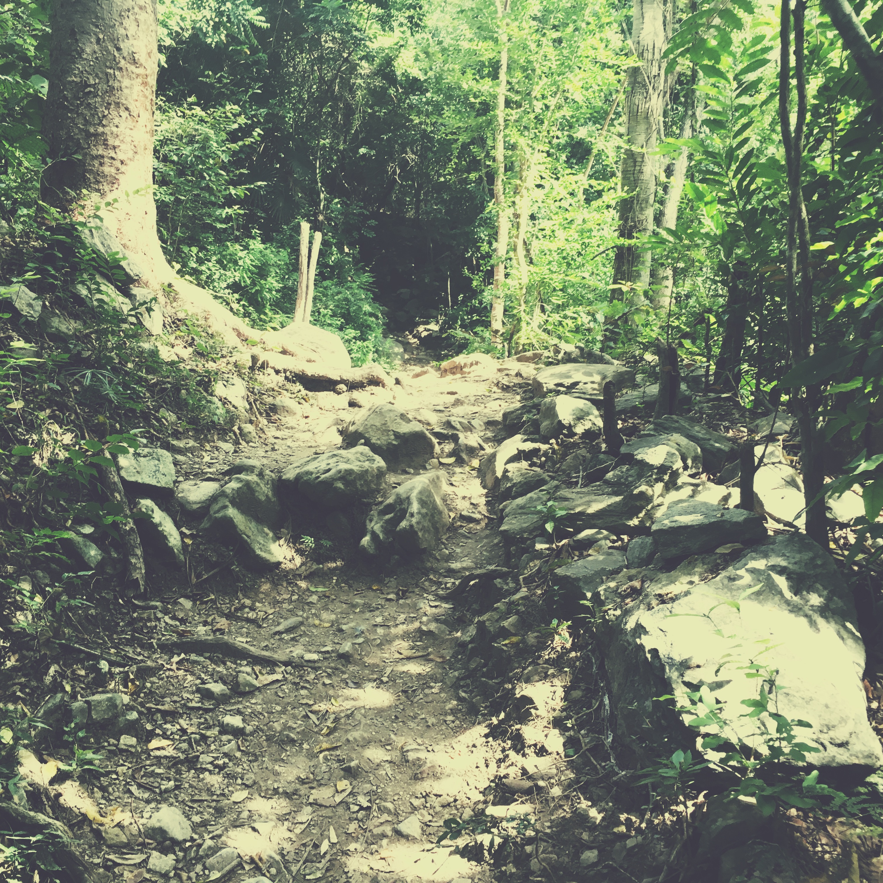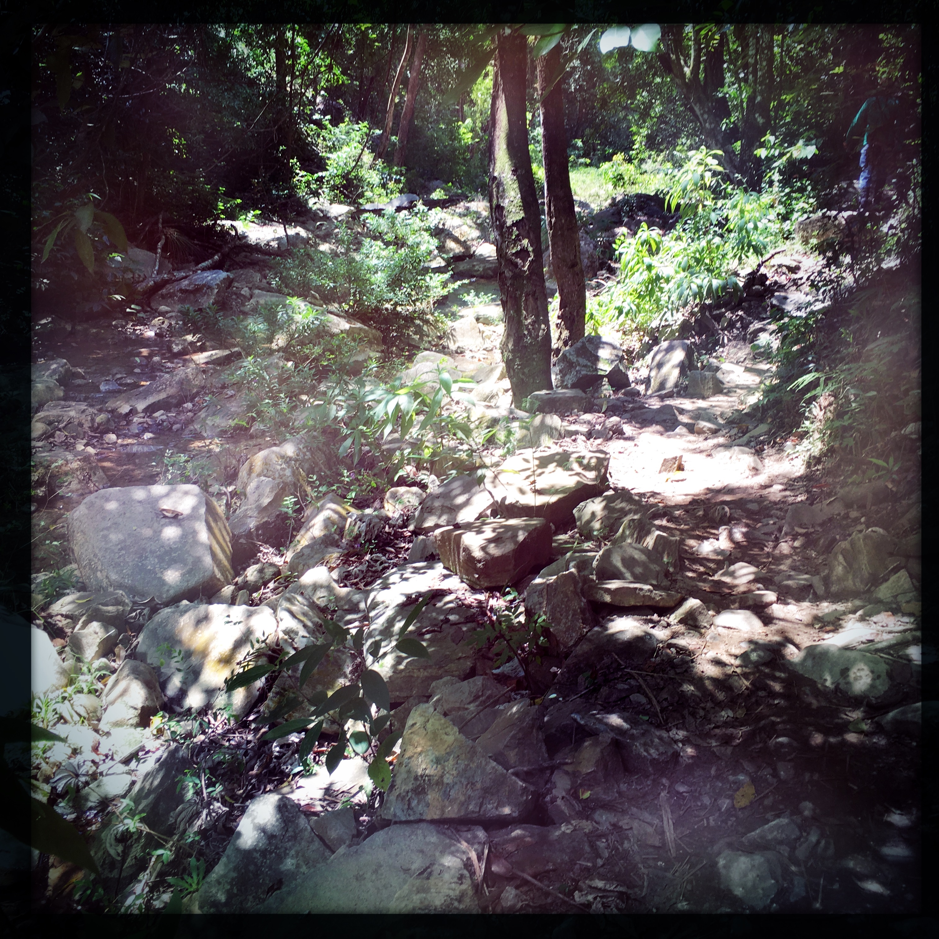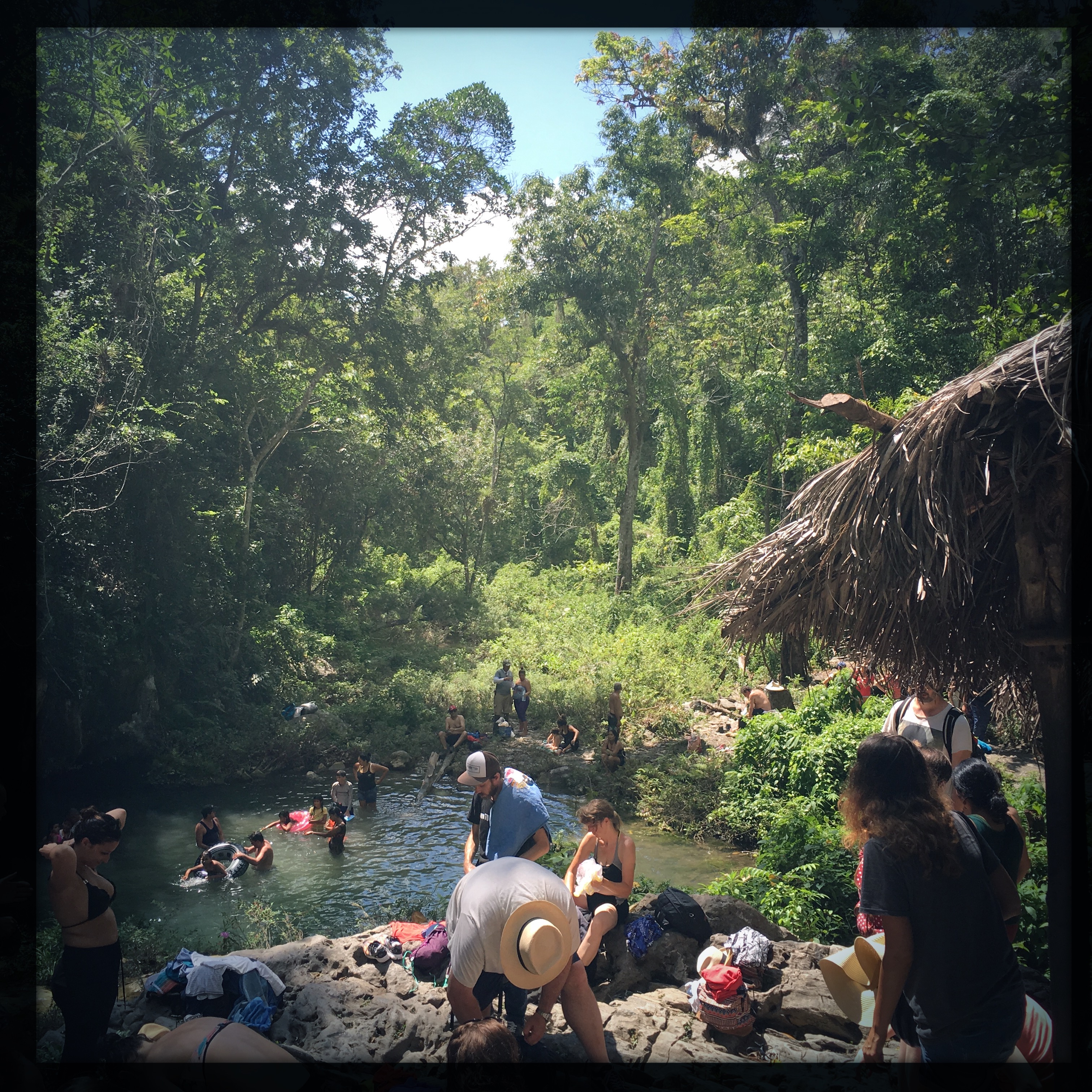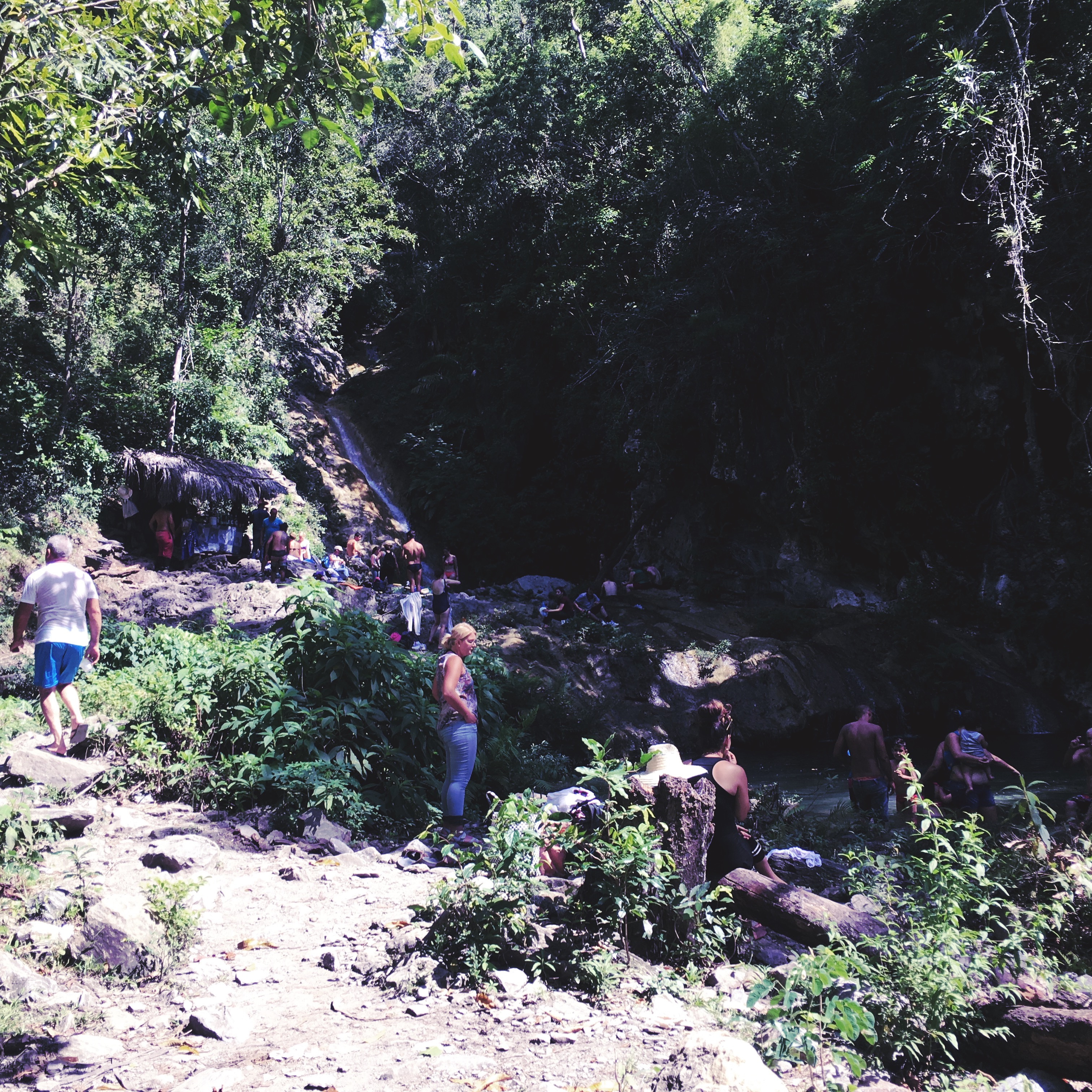 Je m’enfonce dans la forêt, c’est silencieux comme une forêts, et je suis toute seule. Je pense que ça dure 8 minutes, c’est très long, j’ai cru que je m’étais perdu. Mais j’entends de la musique, le bruit de l’eau s’intensifie, je tourne, et la voilà : la cascade. Alors, je ne suis pas toute seule, c’est sûr. Mais ça m’est complètement égal. C’est beau beau beau. Il y un genre paravent chiotte pour se changer (je suis quand même un peu étonnée de voir que des gens se sont dit « Tiens je vais chier là, en écoutant la cascade ». Je m’éloigne un peu, je me colle en maillot de bain et dans un paréo, je garde mes converse pour m’approcher, parce que les rochers sont coupants et glissants. Cowboy est arrivé entre temps, il me fait signe de lui confier mon sac. C’est cool parce que y’a plein de monde et c’est un peu la foire à la tong. Quelques un de ses collègues me proposent de les épouser, ou me jettent des « preciosa » quand je passe pas loin.