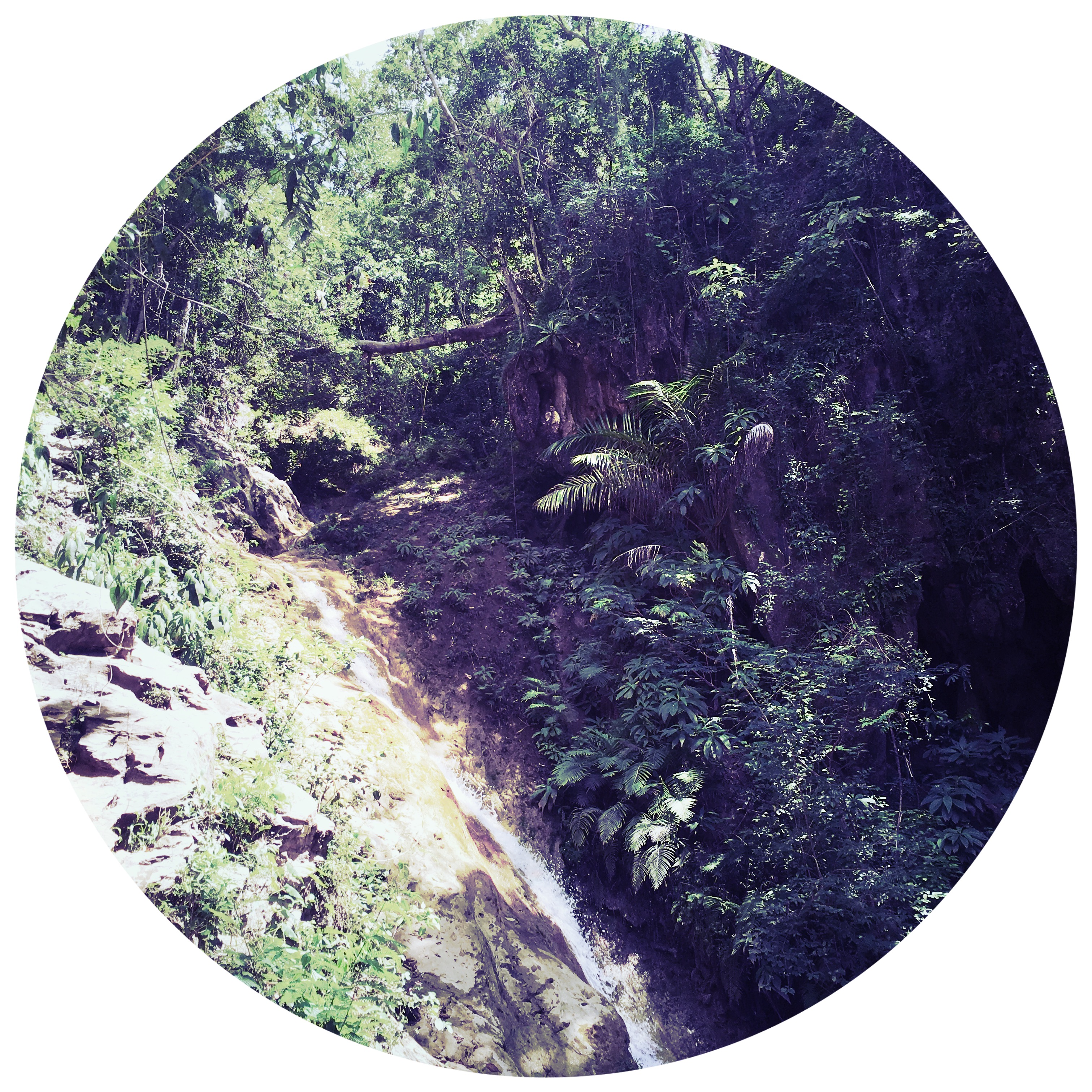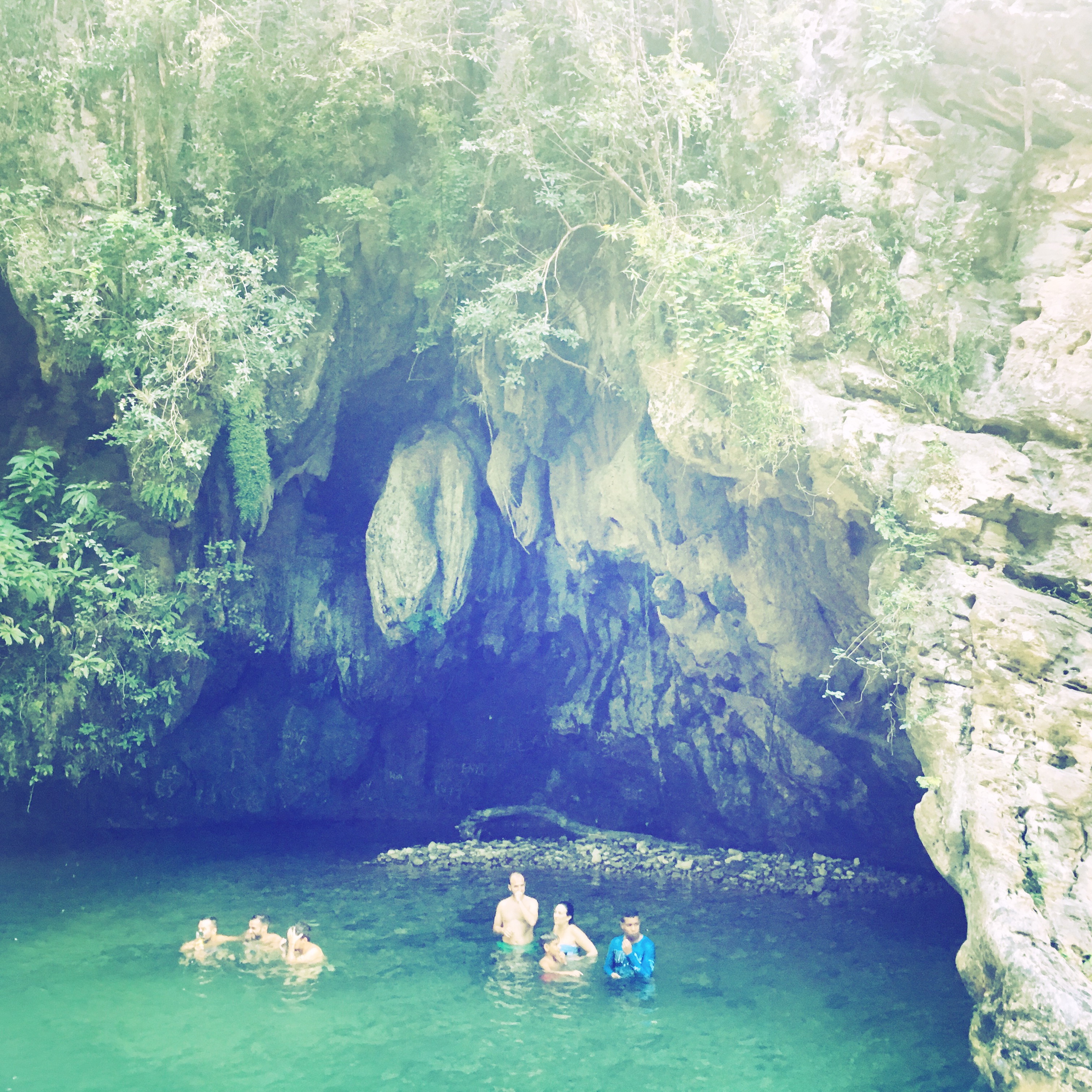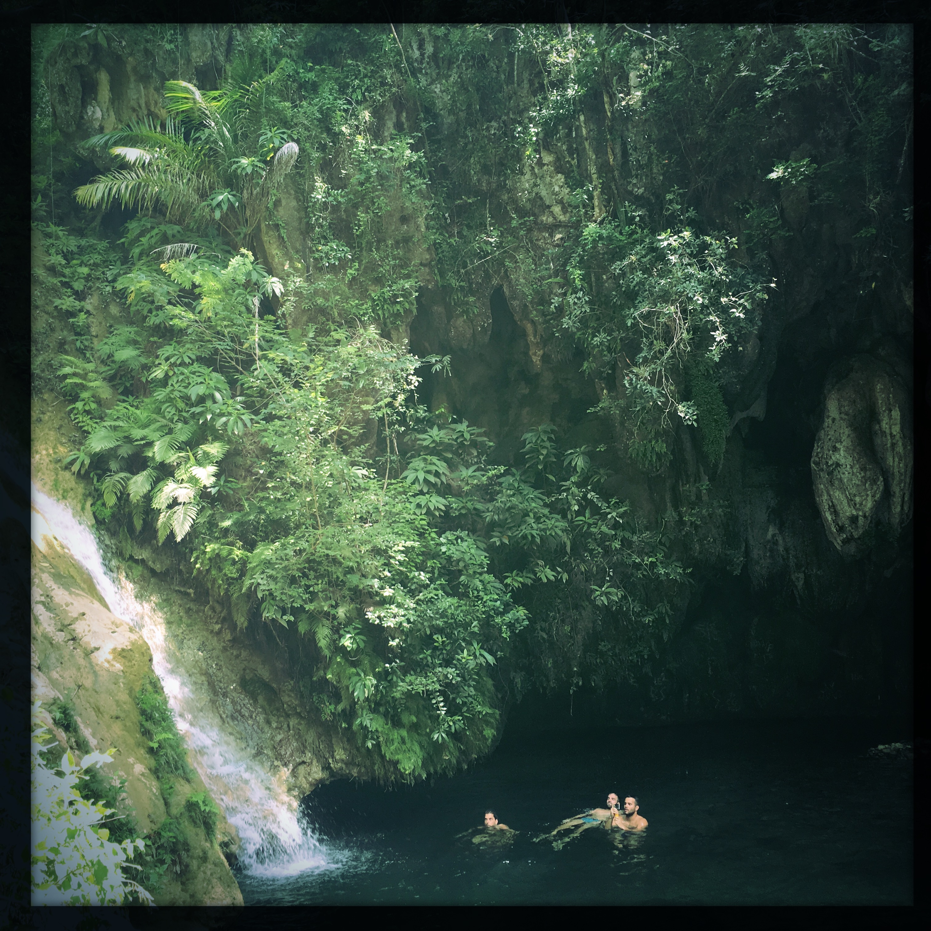 Je me jette dans l’eau fraiche. En haut à gauche au dessus de moi, des grottes, des stalagtites, et à droite, la cascade, l’eau se rue vers nous. Je m’allonge sur le dos, je fais l’étoile d’eau claire. Les sons autour de moi n’existent plus, je regarde le ciel et les arbres, je profite de la fraicheur, je regrette que Manu ne soit pas avec moi, mais je me console en me disant qu’il se repose, et que la balade est nettement plus trash qu’à Vinalès, et qu’il n’était pas du tout en état.