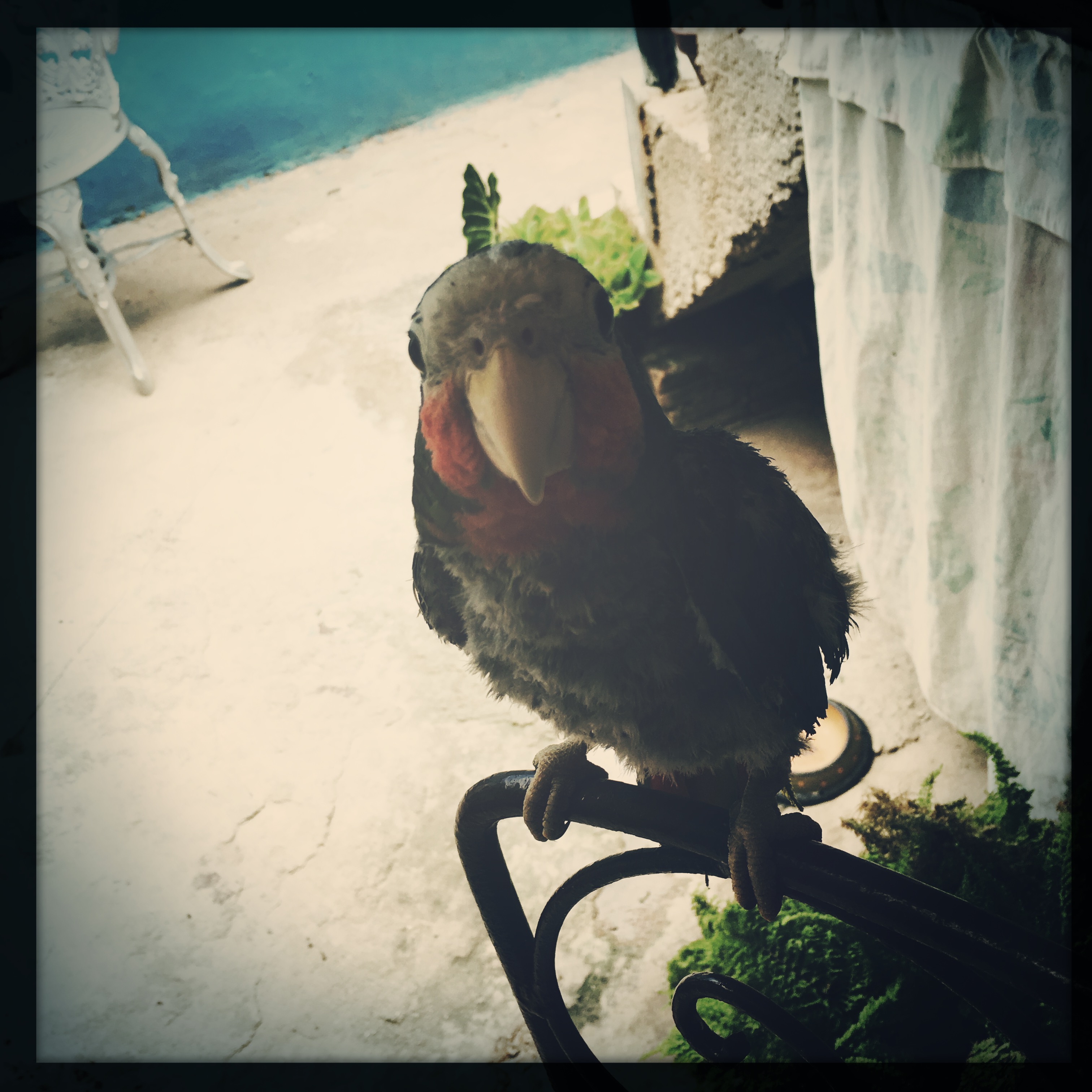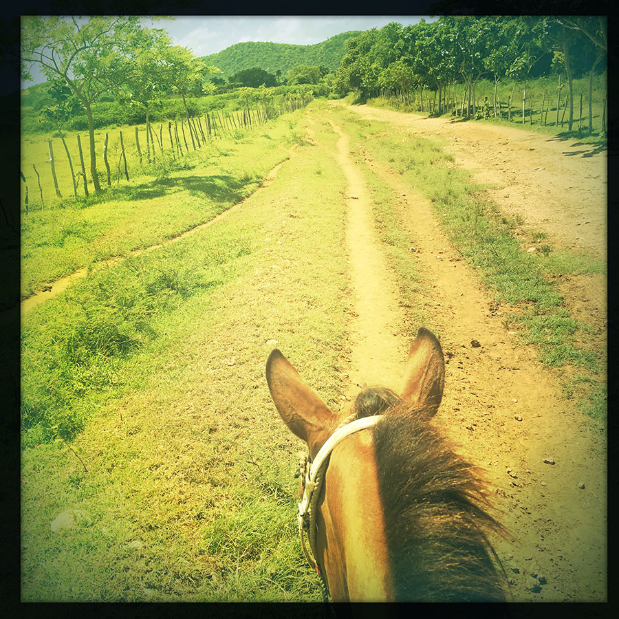 Ce matin, au réveil, Manu semble avoir de la fièvre, son dos est rouge comme un truc super rouge, et chaud comme un truc super chaud. Il a mal partout. Bref ça ne va pas fort fort. Nous avions prévu de faire du cheval ce matin, c’est déjà réservé mais cela ne semble indéniablement pas judicieux qu’il y aille. On tergiverse un peu, et finalement, on décide que j’y vais toute seule comme une grande. Le petit déjeuner est prêt, j’ai précisé hier que je voulais du café avec plein d’eau, Aliuska est catastrophée, et me dit que certainement le plus mauvais qu’elle ait préparé de toute sa vie. Il est formidable ! On mange des œufs, du fromage et ce drôle de jamon rond reconstitué et un peu gras. Il y a des fruits, encore ces foutus fruta bomba qui proutent. Je retente de goûter, au réveil, c’est comme manger un égout aux couleurs chatoyantes.