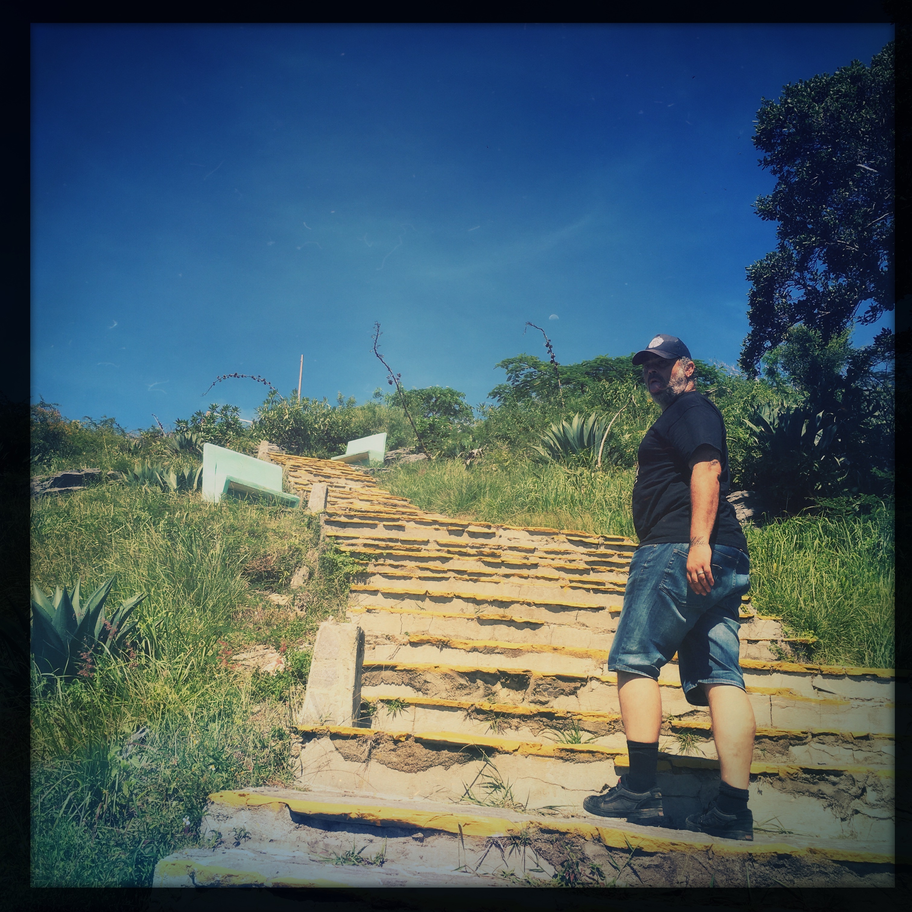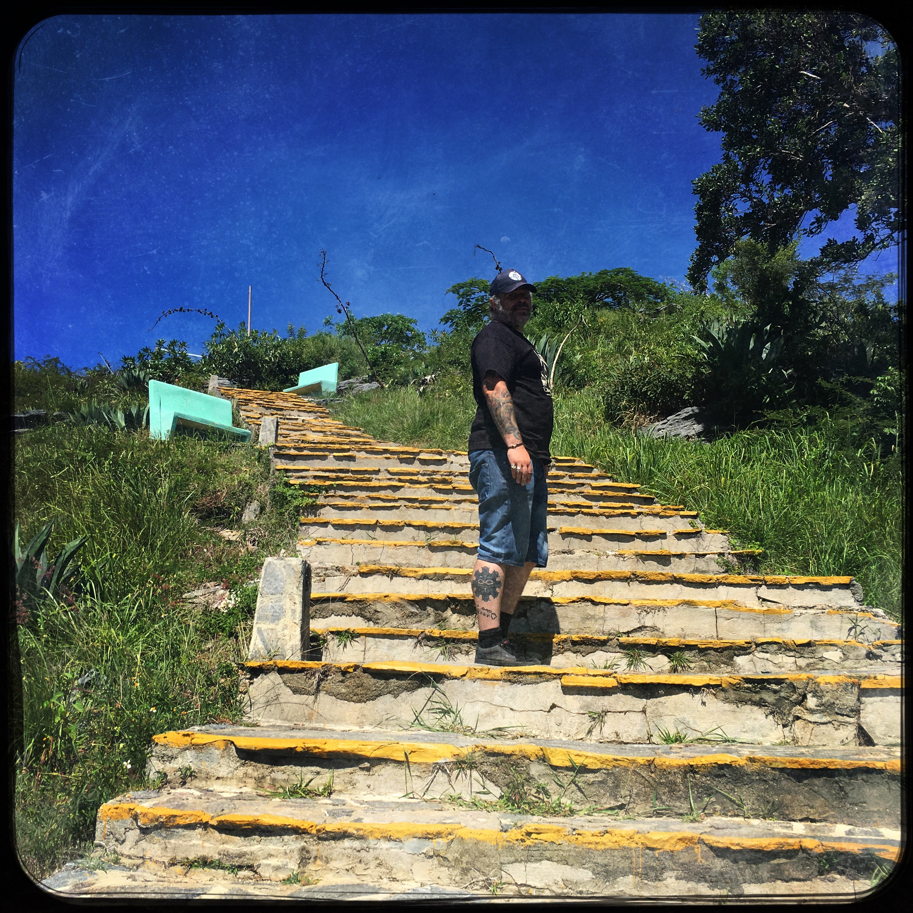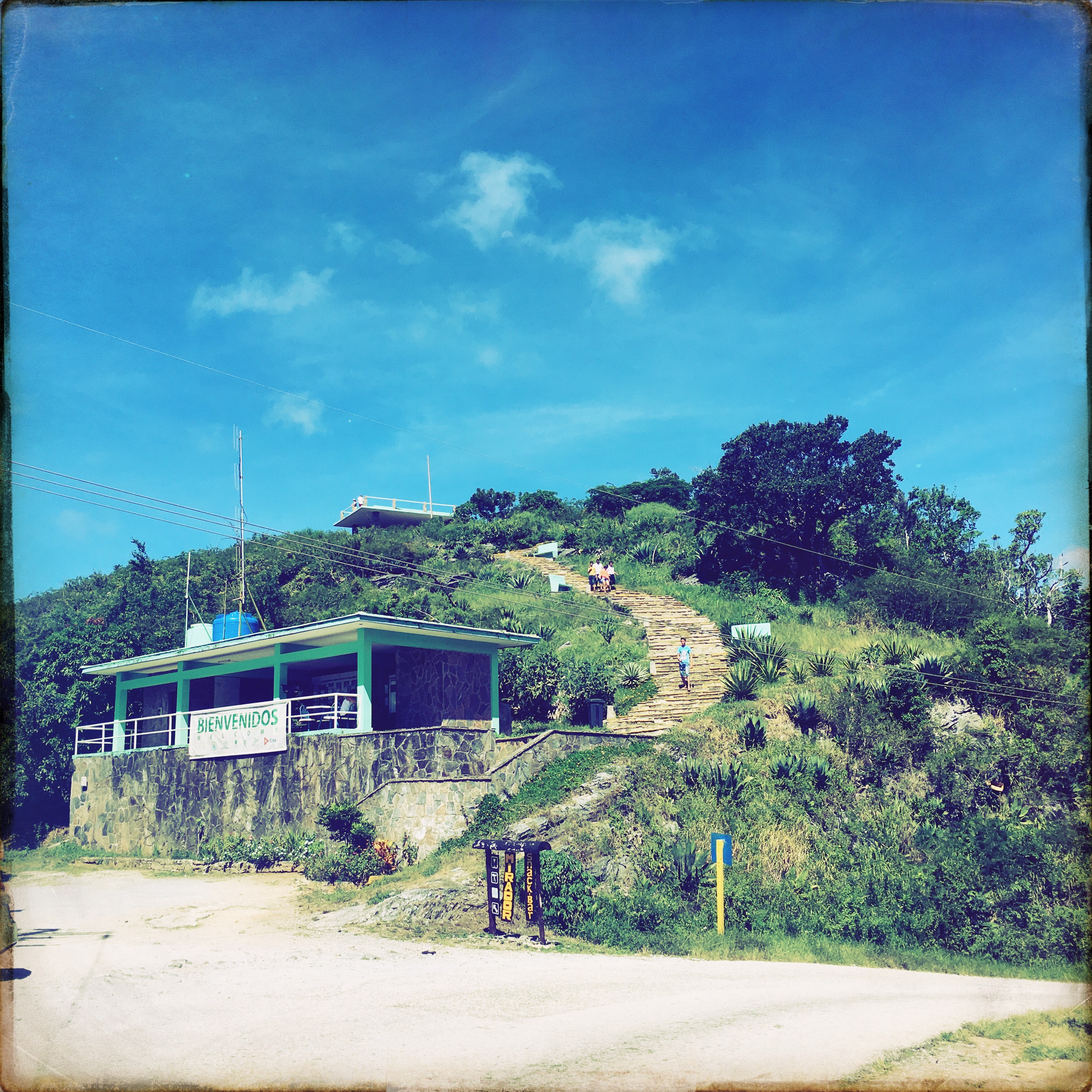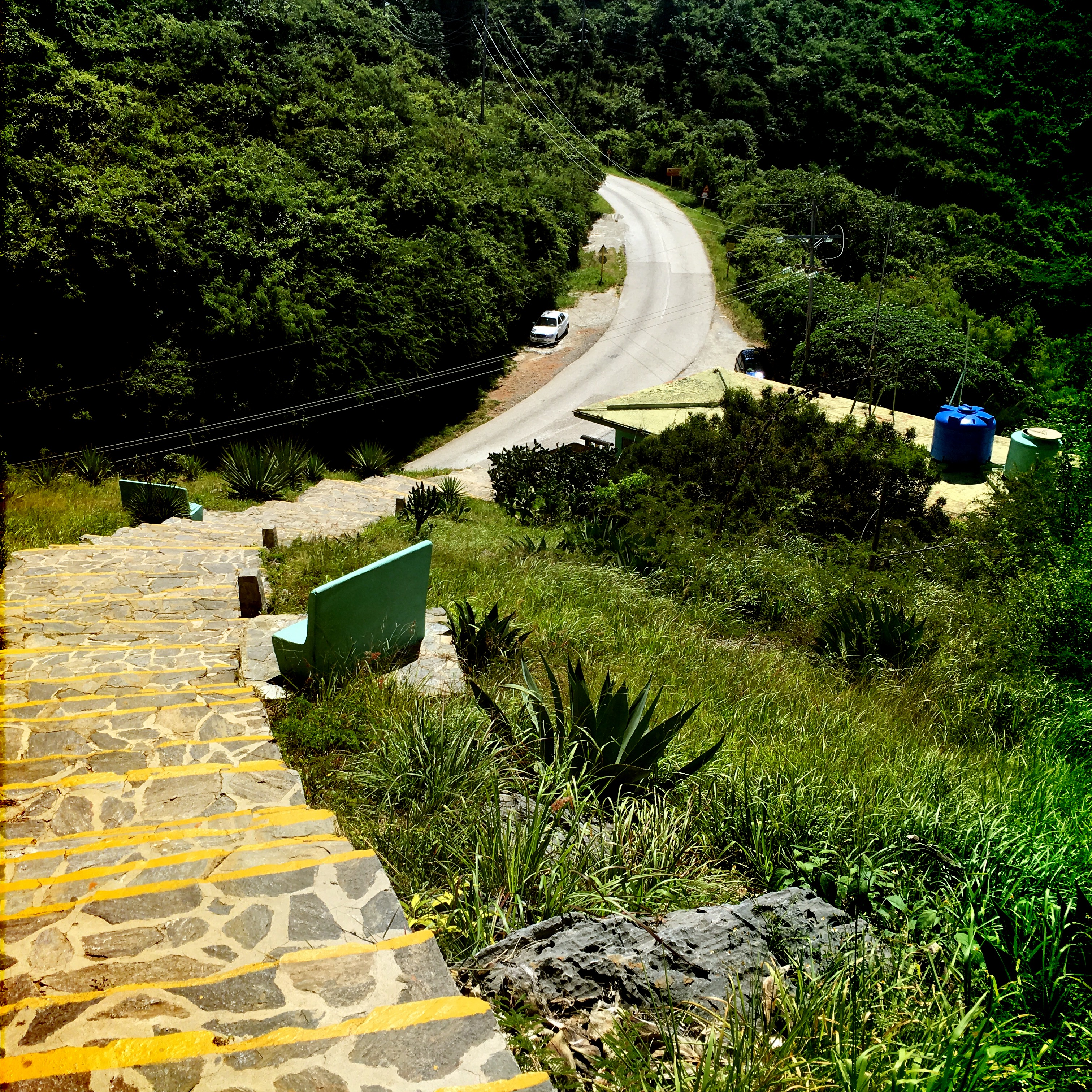 Alors oui, la route est muy muy difficile. Ça grimpe à fond les ballons, ça descend tout pareil, il y a une rigole mal rebouchée qui creuse le bitume tout du long pendant les premiers kilomètres. On s’arrête, il y a un mirador en haut d’un bon paquet de marches, mais, étant en haut de la montagne, on se dit que ça doit valoir le coup. On grimpe, à mi-chemin, un monsieur vend des bananes, et se trimballe une mygale pour que les touristes fassent des photos. Je ne peux pas m’empêcher de me dire que ce business à cet endroit ne doit pas être super super rentable, y’a pas foule foule dans les parages…