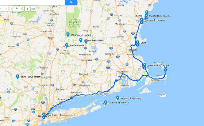 Départ le 14 août… petit à petit, on sait un peu mieux ce qu’on a envie de faire, de visiter. New York ? Se perdre dans les rues, manger et marcher pour compenser. Viens ensuite le road trip en Nouvelle Angleterre : trouver où louer la voiture, faire des étapes, ne pas faire des étapes ? J’ai mis des points sur une carte, en lisant des blogs de voyage, en farfouillant sur AirBNB, en regardant la carte… En bleu, c’est le trajet aller, à peu de chose près, je ne sais pas par où passer au retour.