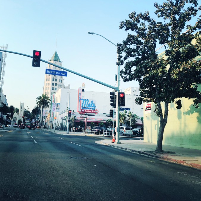 Los Angeles : toutes les routes traversées ont des noms familiers. Melrose, Hollywood, Santa Monica Boulevard, Sunset Boulevard, Mullholland drive. des films et des chansons partout. De loin, les lettres Hollywood, de traviole sur leur montagne me réjouissent complètement. Des restaurants, des magasins, des cabinets de voyance, un marchand ambulant de gombo (plat de la Louisiane, j’ai cru que Manu allait piler pour en acheter).