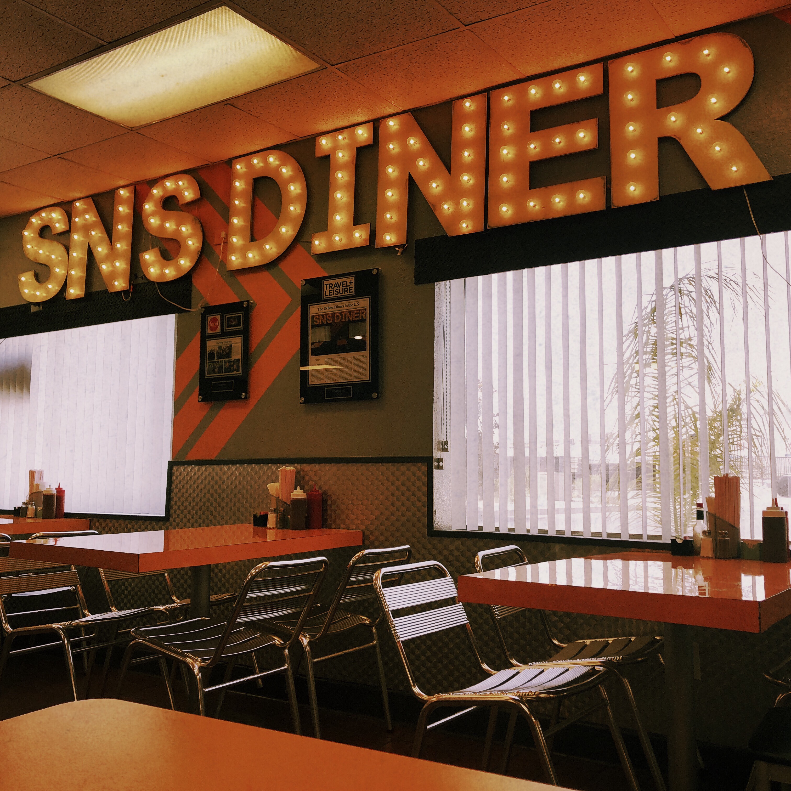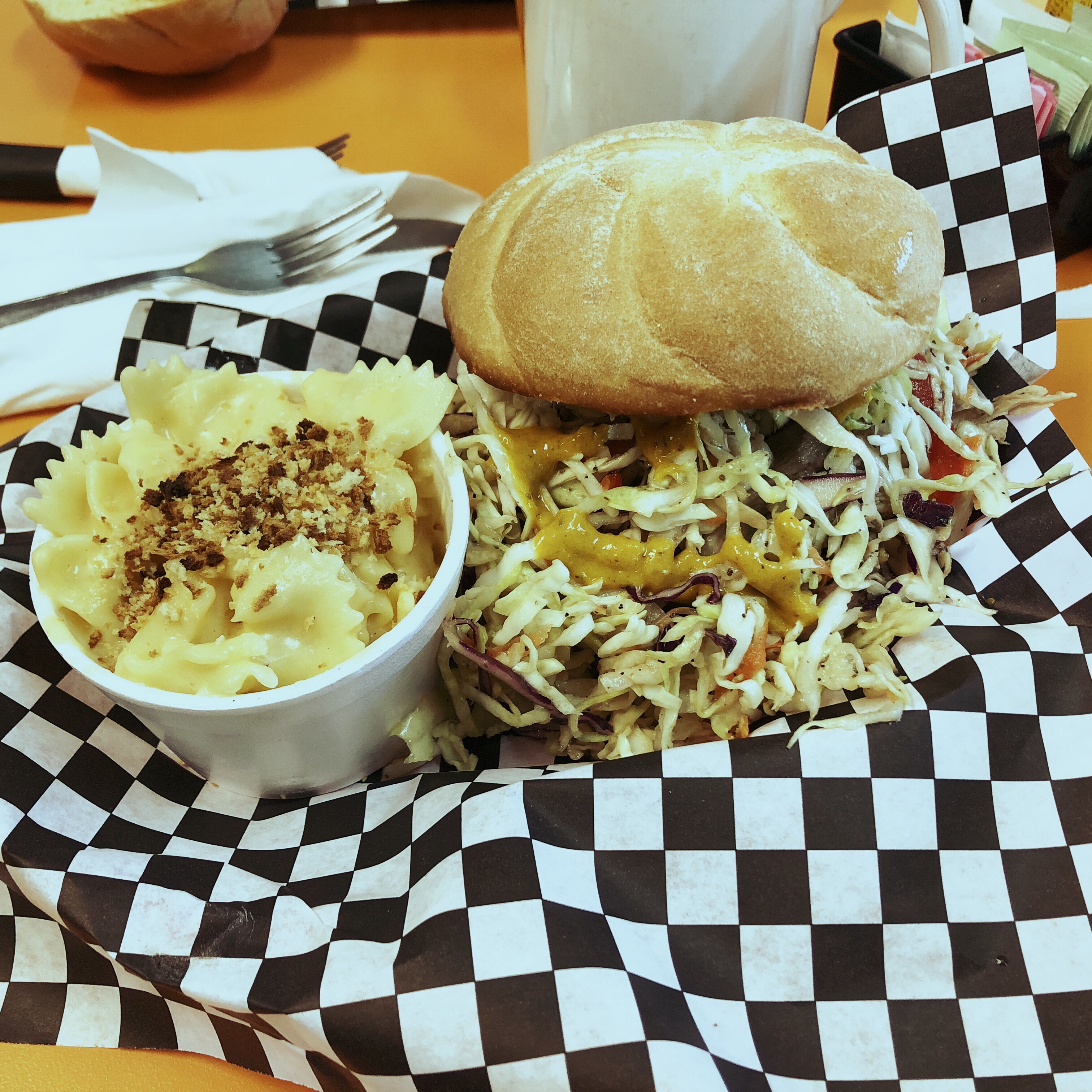 Je jette un œil sur mon appli de roadtrip pour trouver un endroit où petit déjeuner. Dans 6 km, un diner, c’est super ! Les notes de l’Internet sont bonnes. 6 km, c’est vite fait. On arrive dans une zone un peu moche, où la station essence porte le même nom que le restau. Je propose qu’on aille ailleurs, ça ne fait pas très envie tout ça. On rentre et ça sent teeeellement bon ! C’est super traditionnel à l’intérieur, très joli, on s’assoit. Grosse déception, ils ne servent plus de petit déjeuner. Il est trop tard. Il faut retourner le carte et déjeuner. De fait, il est midi. Il y a du pulled pork. Adjugé, on commande. En regardant autour de nous, on découvre que ce dîner a été dans des tas de sélections de magazines et de guides. Huhu. On se croirait dans les émissions de casting de chant où le jury évalue mal les gens avec un à priori débile et après, c’est la révélation et tout le monde pleure.
