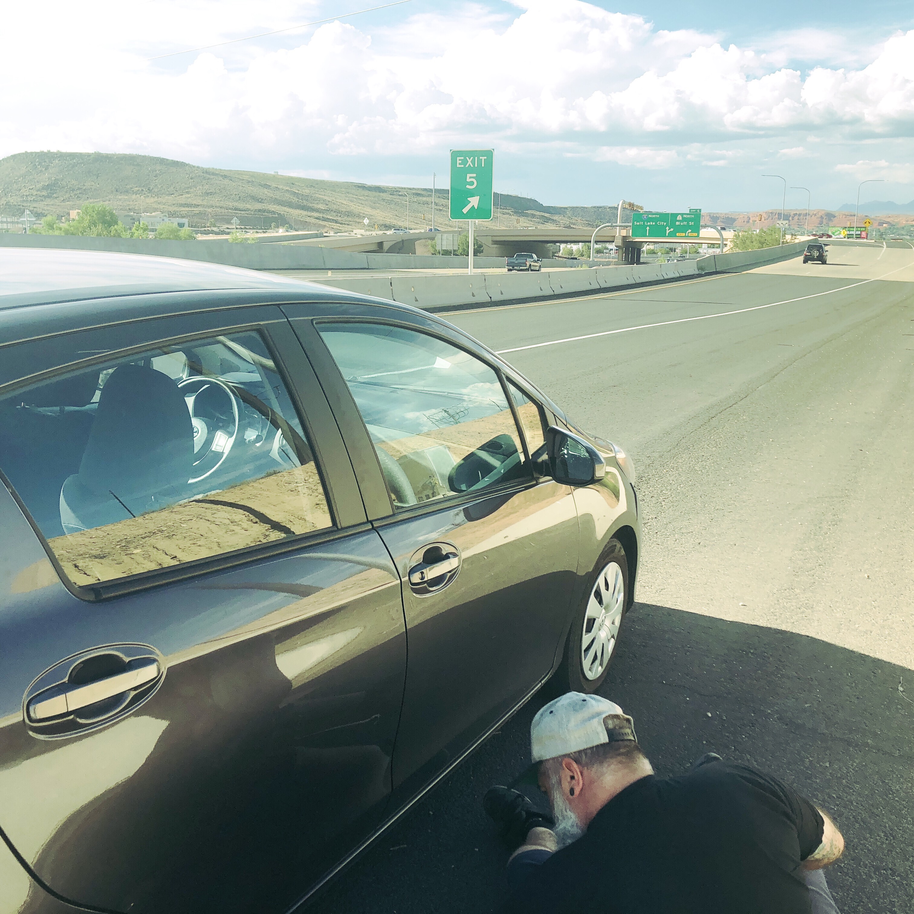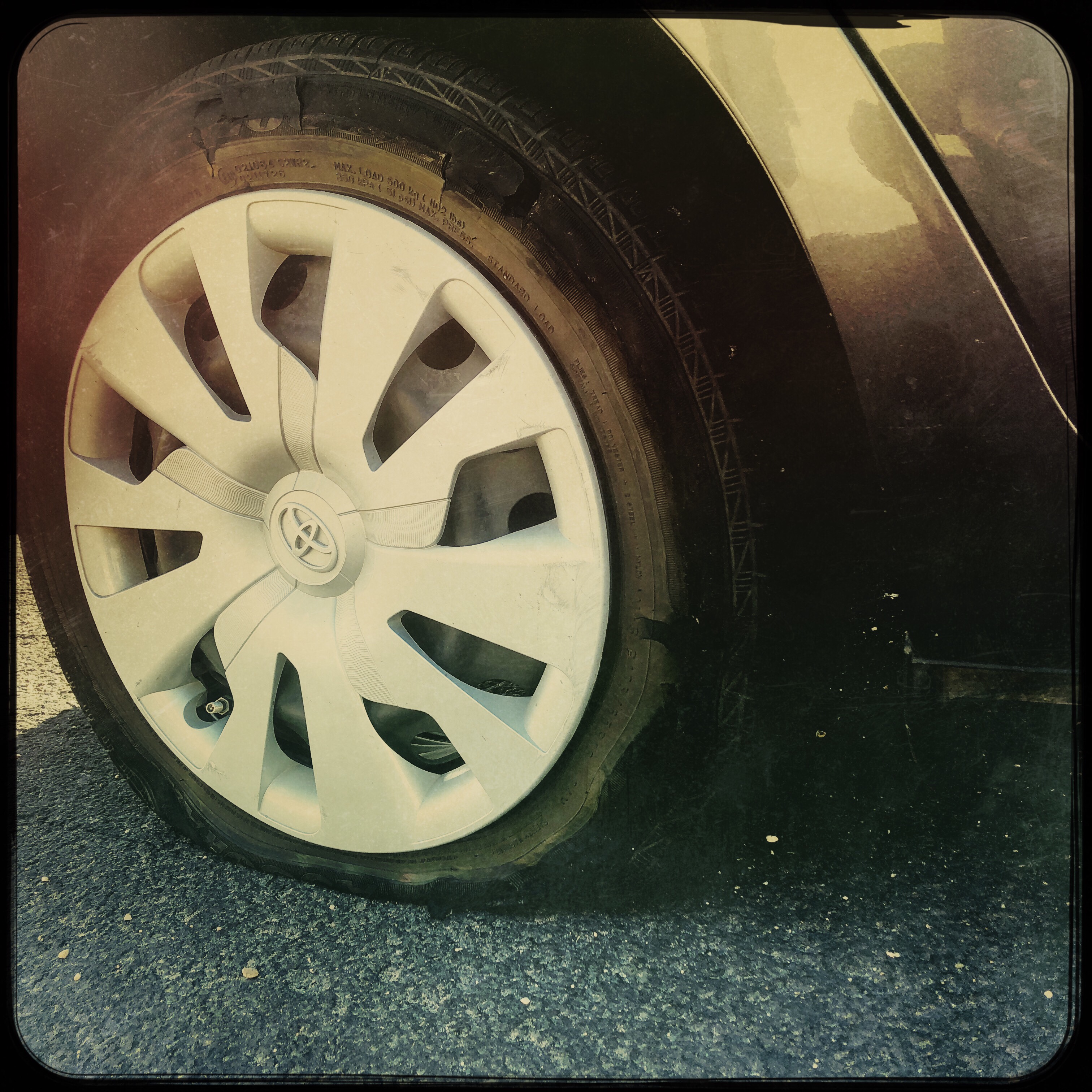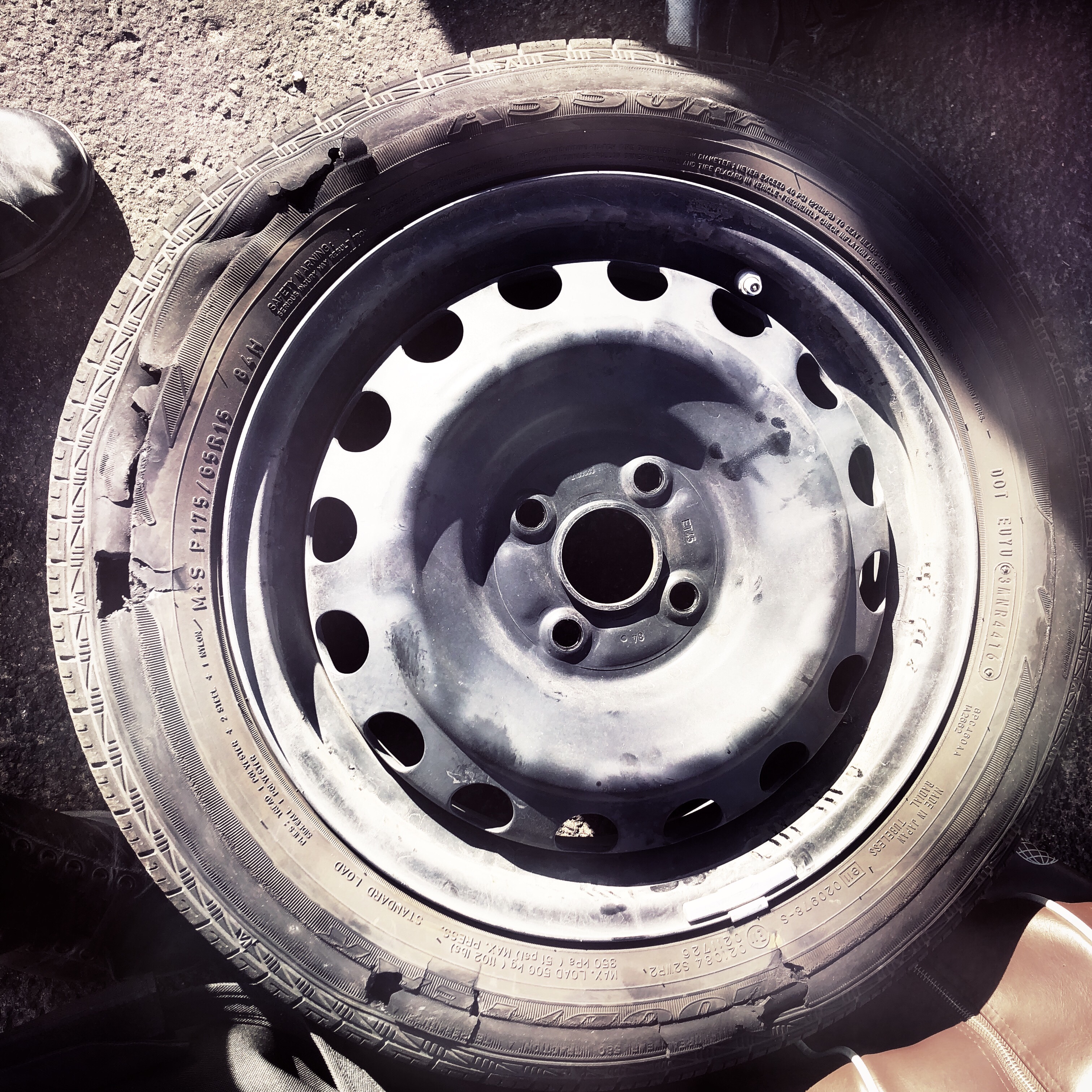 Il ne reste que 4 km quand la voiture se met à trembler. Aucun doute, on a crevé un pneu. On s’arrête en catastrophe le long de la route avec les voitures qui passent près de nous à ouatmille à l’heure.