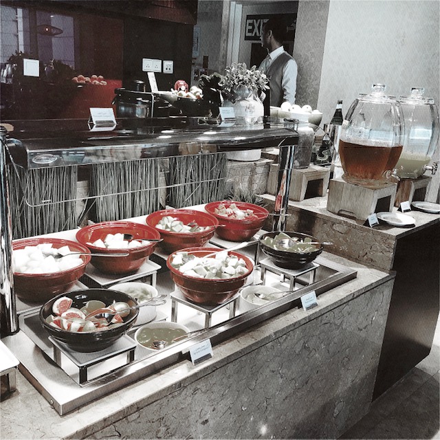 La salle est grande il y a un grand ilot central avec une cuisine ouverte, et des tas de stands thématisés. Fruits, jus de fruits frais à composer soi-même, plat indien, waffles et pancakes, oeufs brouillés, plats du Qatar, un salad bar, du maquereau et du saumon fumé, du bacon de bœuf, etc, etc. C’est sans fin. Nous remplissons nos assiettes en gambadant, on nous amène un thé, et mon jus de fruits par moi-même composé (carotte, pomme, gingembre citron). On mange, on se ressert, c’est bientôt l’heure, nous avons rendez-vous avec une autre personne de l’ambassade, qui doit nous accompagner à l’Institut Français pour que nous rencontrions des classes de petits enfants et leur raconter des bêtises.