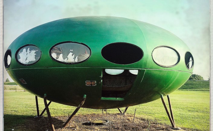 Premier stop typique : le Launching Pad. Un diner (rappel : prononcer dailleneur) de bord de Route 66, devant lequel est planté une statue gigantesque d’un monsieur de l’espace qui tient une belle fusée suppositoire. Dans le diner (dailleneur), au fond, il y a un musée de la Route dans une petite pièce. Manu achète une carte, et les vieux monsieur qui travaillent là sont vraiment gentils. On nous propose de l’aide, on nous sourit avec bienveillance et je me désole que ces vieux messieurs ne soient pas plutôt chez eux à jouer à la PlayStation, plutôt que de bosser encore et encore.