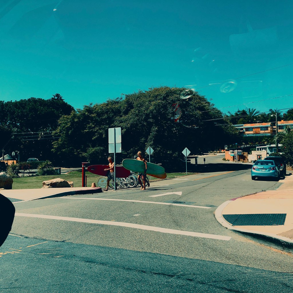 Donc La Jolla, ce sont des palmiers, des espaces verts, plein de gens super équipés, des surfeurs blonds, musclés qui transportent des surfs et une tannée pour se garer. On trouve malgré tout une place.