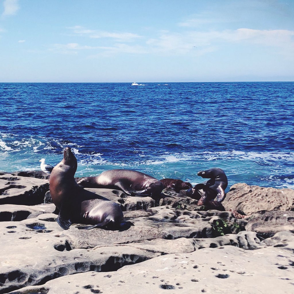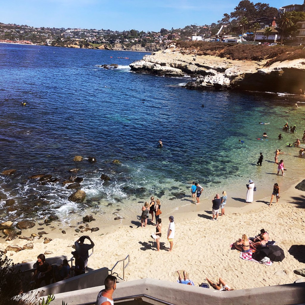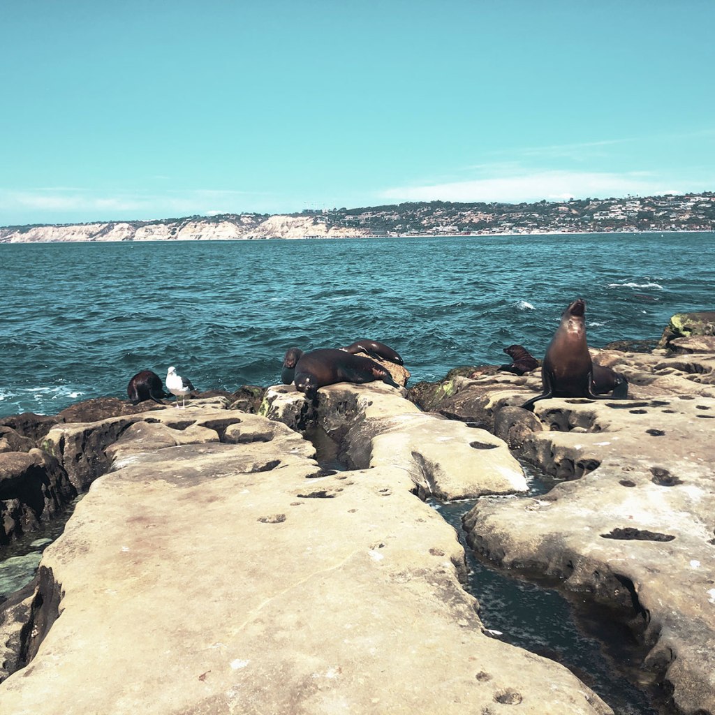 Arrivés à La Jolla, constat doit être fait, on est loin du désert, et on n’est plus du tout tout seuls. Ça s’est déjà un peu senti au début de l’autoroute, qui fait tout de même 7 voies dans un sens, 7 voies dans l’autres. Ça fait un sacré paquet de voitures, et donc un sacré paquet de gens.