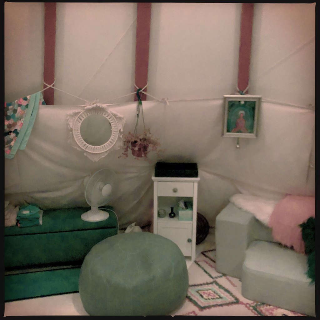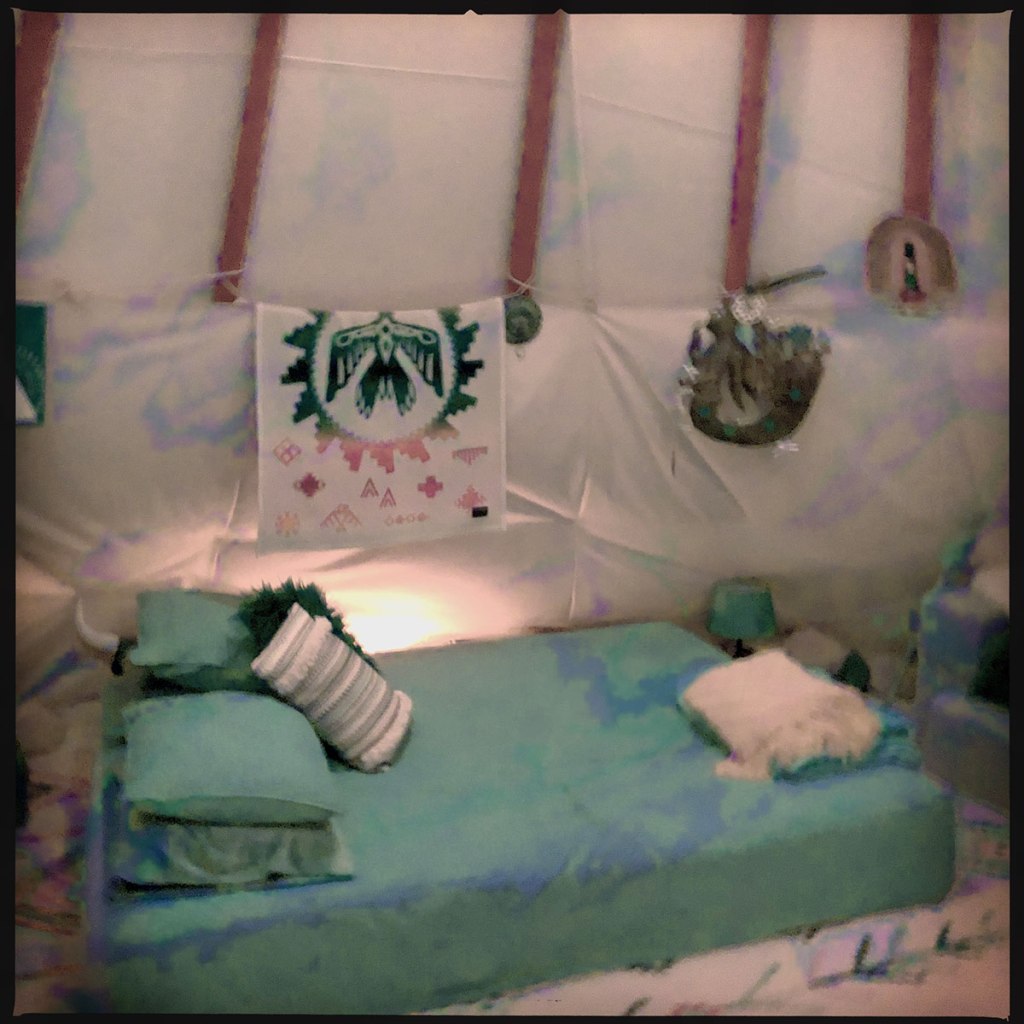 L’espace est incroyable. Tout est décoré avec goût, il y a tout ce qu’il faut, un grand lit, des canapés, un frigo, de quoi cuisiner. Les toilettes sont dehors, avec une douche ouverte sur le ciel, mais avec de l’eau chaude. Ils nous proposent même de dormir là cette nuit si on a envie. On ne veut pas trop leur rajouter du bordel à ranger et des draps à changer, on décline, même si ça aurait été super. À l’intérieur du tipi, il y a une lumière qui change de couleur, avec une télécommande, au milieu, un feu à gaz hyper élégant. C’est un endroit absolument reposant. On discute un moment, on se parle de nos vies, de nos voyages, et encore une fois on conclut que Airbnb, c’est parfait pour rencontrer des gens, et en savoir un peu plus sur le monde.