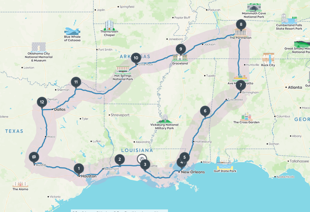Une fois les billets en boite, j’utilise le site roadtrippers pour tout organiser. J’ai un point de départ, un certain nombre de jours, quelques caprices de visite, et hop, je mets des croix sur mon plan d’écran.