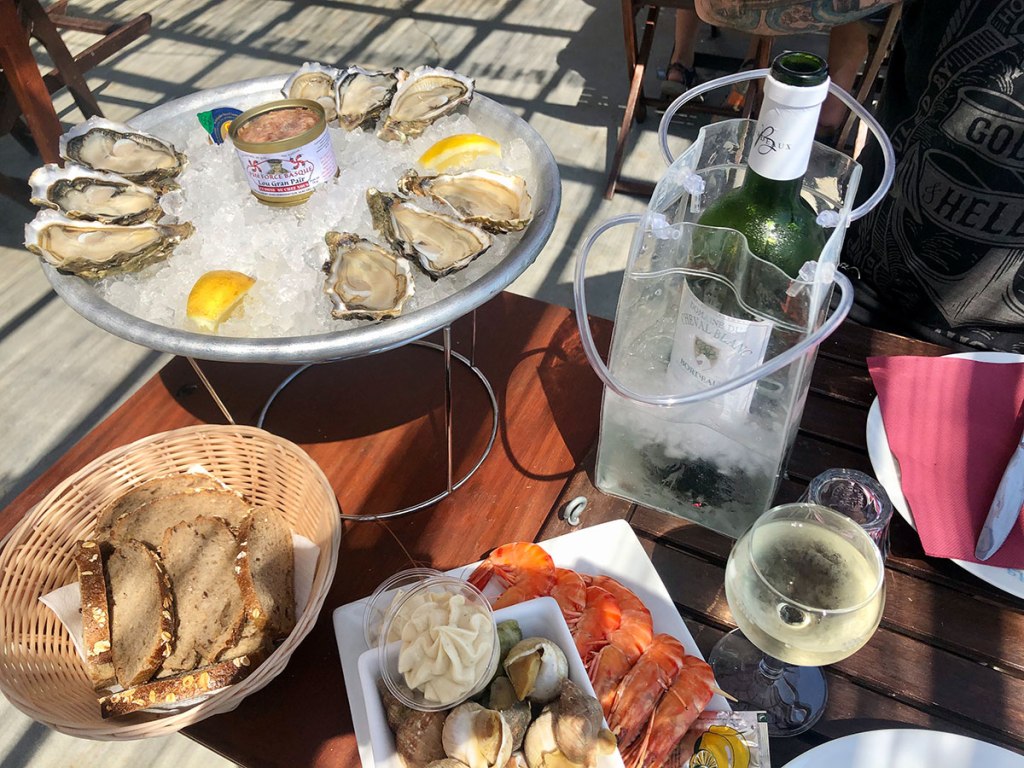 Manger des huîtres en respirant la mer ! Mâcher des bulots en écoutant les mouettes ! Je ne sais pas dans quel bouillon ils avaient été bouillu, mais ils étaient délicieux, ces bulots. On a bu du vin blanc pour parfaire la balade. Notre table donne sur la plage, c’est vraiment super.