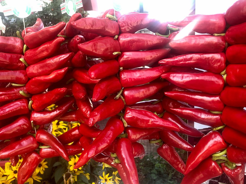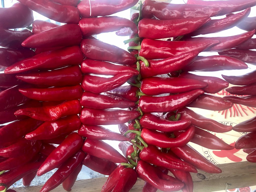 Direction Espelette ! Sur la route, on a croisé une bonne cinquantaine de boulangerie auto-proclamée « LA maison du gâteau basque », gâteau basque is the new donut. On en a partagé quelques-uns (pas tous le même jour hein), mais dis donc, c’est bon ce truc. Un genre de pâte sablée avec de la crème pâtissière au milieu. Du beurre au sucre mais pas tant gras. Bref, on arrive à Espelette. Un petit parking dans un pré à l’entrée du village, un bout de marche, et effectivement, c’est LE village du piment.