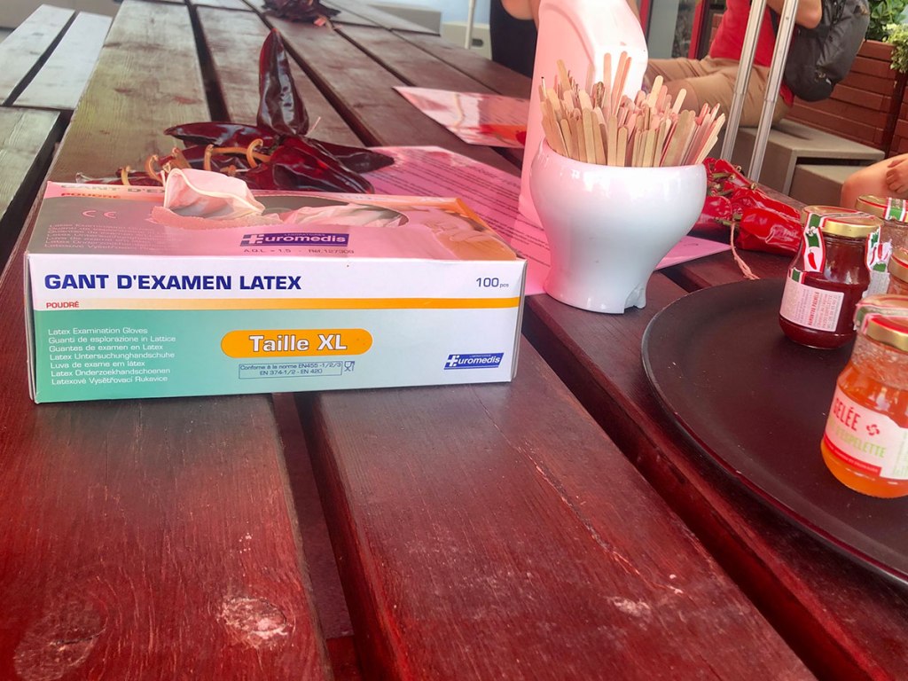 C’est ensuite le moment de la dégustation. Avec les masques, c’est un peu marrant. C’est Fantomas au restaurant. Tout ce qu’on goûte est super délicieux, on va faire trois emplettes, et je craque sur le gin au piment d’espelette. Mes gins tonics auront un goût de pays basque. Des gins tonix.