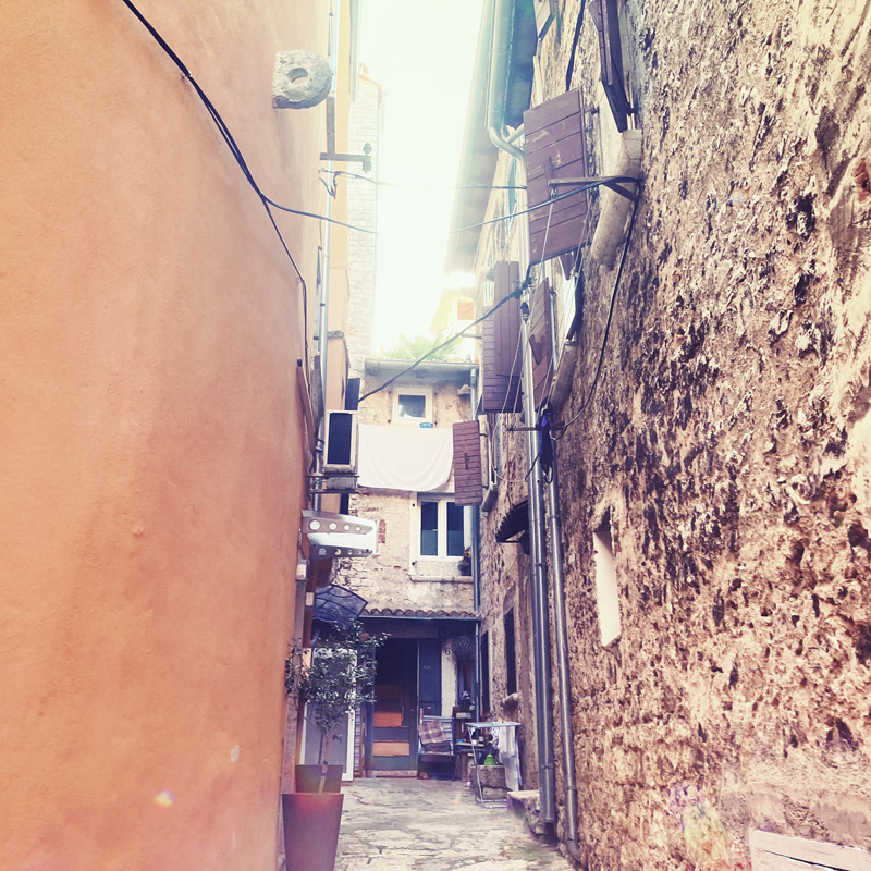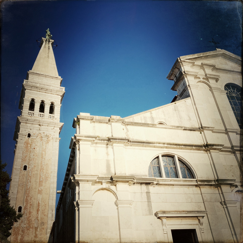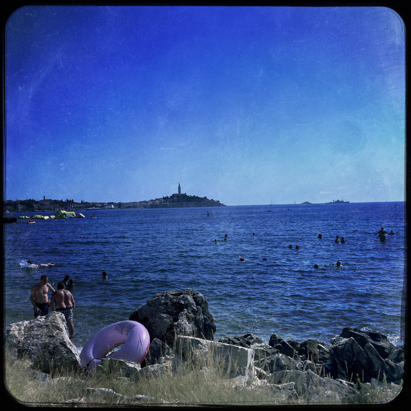La plage, ce sont des cailloux surtout, mais la mer est bonne, merci l’Adriatique ! Après une entrée hésitante et maladroite et surtout un poil ridicule, on barbote un moment avant de sécher sur l’herbe. En face de nous, on vois Rovinj. Un grand clocher dépasse, ça a l’air de grimper. J’en lis un peu plus sur la ville. « Perle de l’Istrie », « Venise miniature ». Adjugé, allons voir cette merveille.