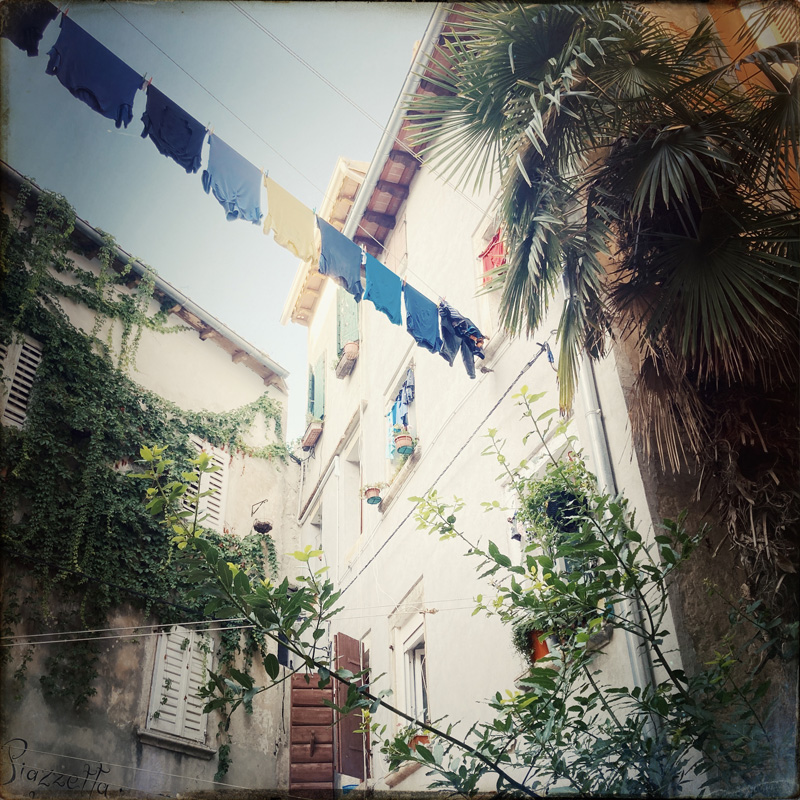 Ce soir, on dort à Rovinj. C’est une petite ville le long de la mer. J’ai trouvé un Airbnb un peu excentré qu’on a même un peu de mal à trouver. C’est vieillot et tout à fait charmant. On a un logement pour nous tout seul, avec une terrasse bordée de roche. La mer n’est pas loin à pied, genre 700 m. Banco, allons ploufer.