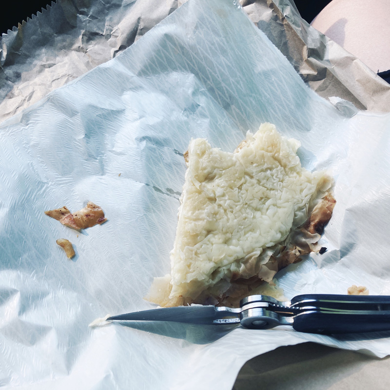 En chemin, il faut petit déjeuner quand même. Alors on fait un court stop dans un petit marché qui fait aussi bakery, et je choppe un burek. J’en fais des fois selon la recette arménienne de la famille du papa des filles, mais là, ce n’est pas tout à fait pareil. C’est entre la banitsa et le burek. Je pense que c’est de la pâte filo, avec un fromage, genre feta, mais en gratin. C’est super comme petit déj. Vous devriez essayer.