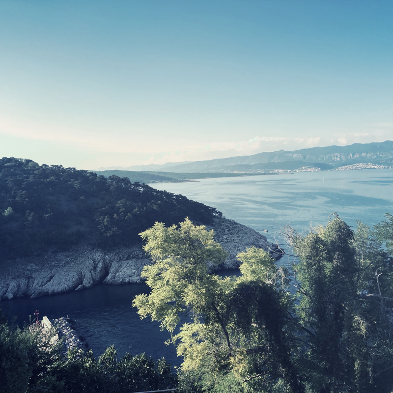 Pour accéder à l’île, c’est assez facile, il y a un pont. C’est bien les ponts. En plus, il est gratuit là. On traverse le bout de mer pour se rendre à Vrbnik (je crois qu’on prononce Veurbnik, mais c’est à vérifier). Après le pont de Krk (à prononcer comme vous pouvez), il reste une trentaine de km pour arriver à Vrbnik. Sur la route, toujours plus de vignes. Mais pendant un furtif instant, je vois des petites biches (faons ?) qui cavalent au milieu du raisin et des oliviers, c’est aussi magique que bref.