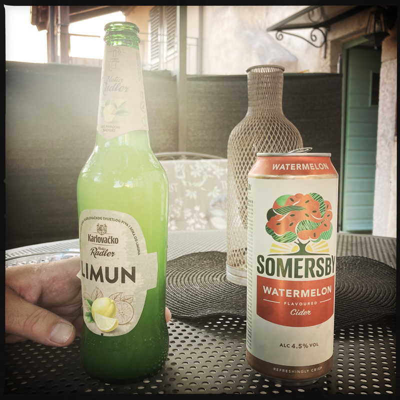 On s’arrête acheter du miel sur la route (c’est un peu comme le vin et l’huile d’olive, il y en a partout), et après une douche et une petite balade dans la ville (4km, c’est moins qu’hier, mais ça grimpe), on rentre et Manu fait le diner. Au passage on est passé dans un truc touristique à souhait, où ils vendent des truffes (plus cher qu’au supermarché), de l’huile d’olive, du miel et DU GIN ! DU GIN DE L’ÎLE de KRK ! Le monsieur nous fait goûter, et c’est bon dis donc. Après, il nous fait goûter, attention la bouche : du gin aux truffes. Alors pardon, mais c’est n’importe quoi. L’idée est bien. Mais quand même. On ne peut pas mélanger tous les trucs délicieux et croire que ça sera forcément doublement délicieux. Bon en même temps, on fait bien de l’avocat crevette. Je pourrais ptêt me lancer dans le gin avocat-crevette…