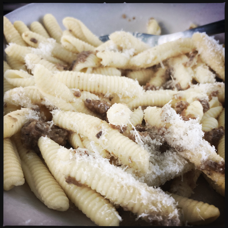 Pour le vrai diner, on a pris des pâtes fraîches, et un pesto aux truffes. Oui madame. C’est la mode. On mange sur la petite terrasse de devant notre maison d’un jour, et ce, à l’ombre de la vigne vierge qui croule sous le raisin (immangeable, j’ai dû vérifier avant de faire n’importe quoi pour le dessert.)