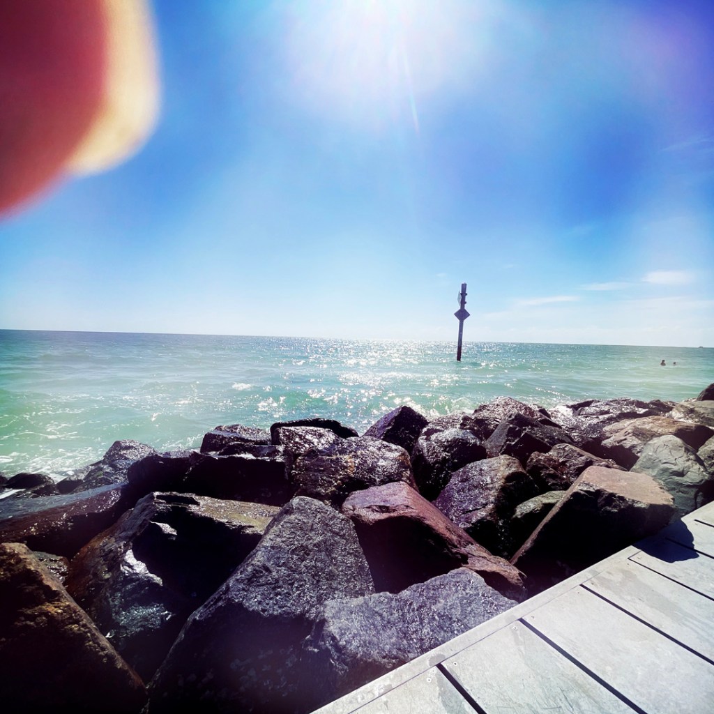 J’insiste un tout petit peu pour qu’on se baigne. (De fait, le sable c’est toujour pénible, dans le slip). Bon en gros j’ai dit « Oh, on se baigne ? Elle a l’air super ! ». Manu a levé les yeux au ciel et a dit ok, et après, il a fait une tirade sur le sable qui est chiant et tout.