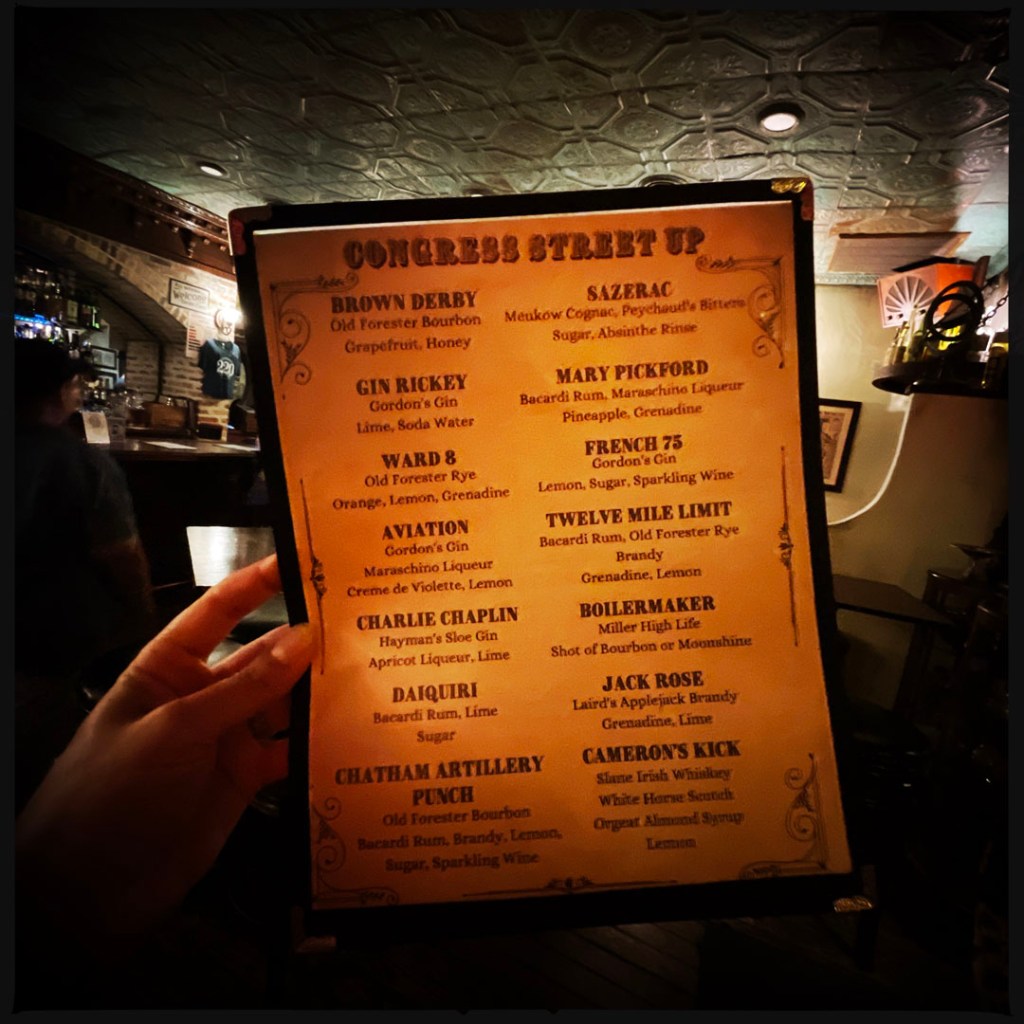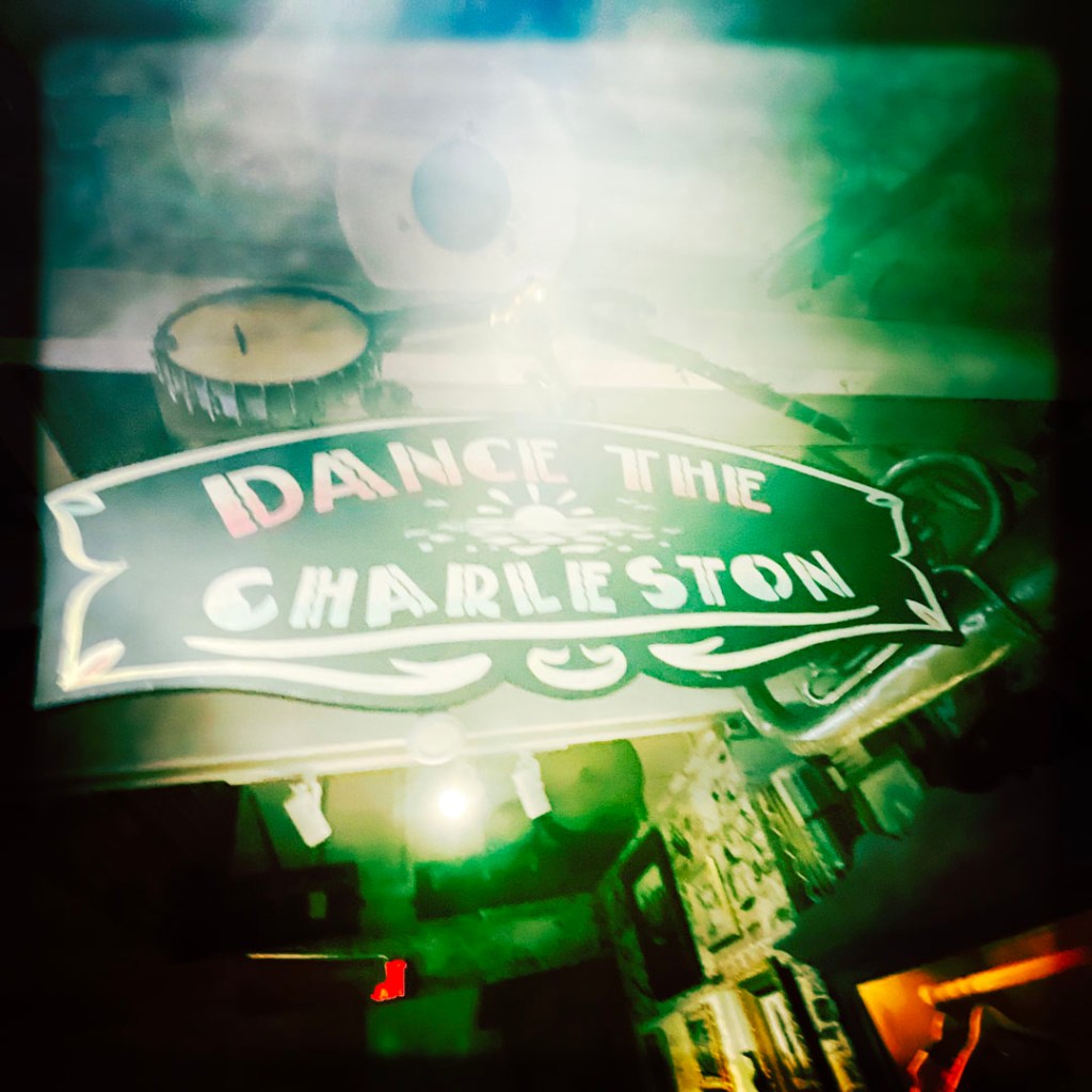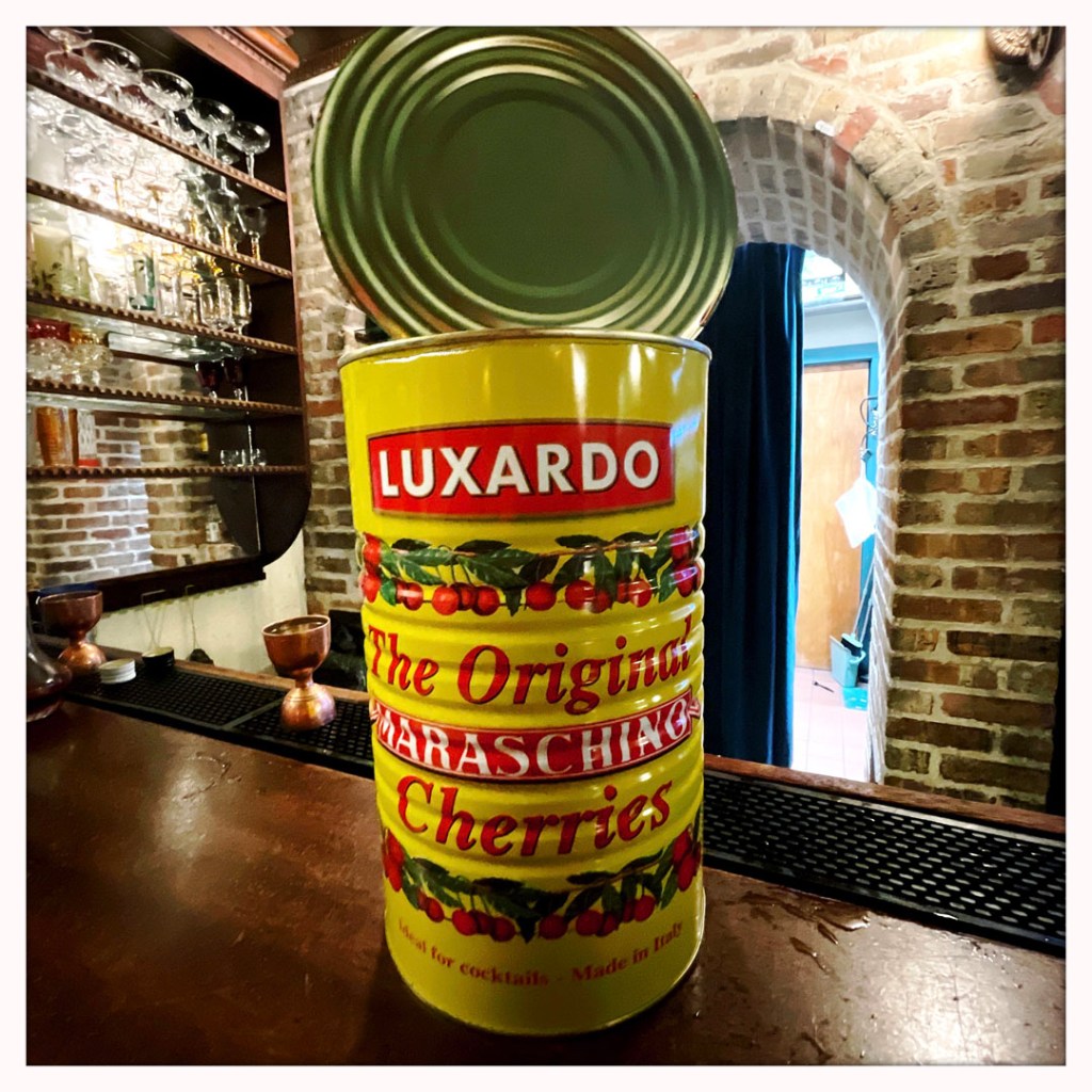 Un cocktail est inclu dans la visite (parce que j’ai payé à l’entrée, c’est pas magique non plus). On peut choisir parmi des cocktails de l’époque. Je dis que je veux bien du gin merci beaucoup monsieur. Je prends un « Aviation » et Manu un « French 75 ». C’est super super bon. Et surtout, dans le mien, y’a une petite cerise. Je me dis que. ça va être naze comme un fruit confit. Je croque dedans du bout des lèvres. Oh bon sang. C’est comme un bonbon bon. Je vais demander au barman ce que c’est. des cerises Maraschino, c’est italien. C’est génial, il m’en faut mille boites pour tout mes futurs gin tonic.