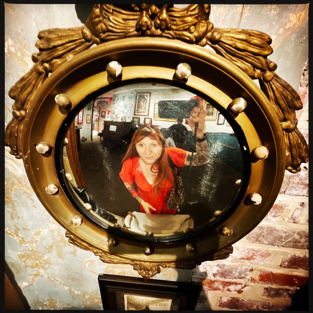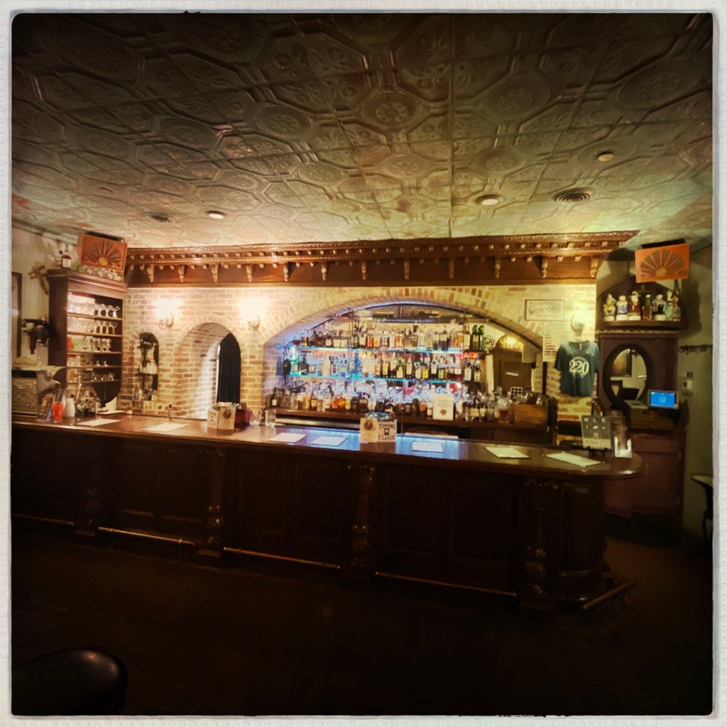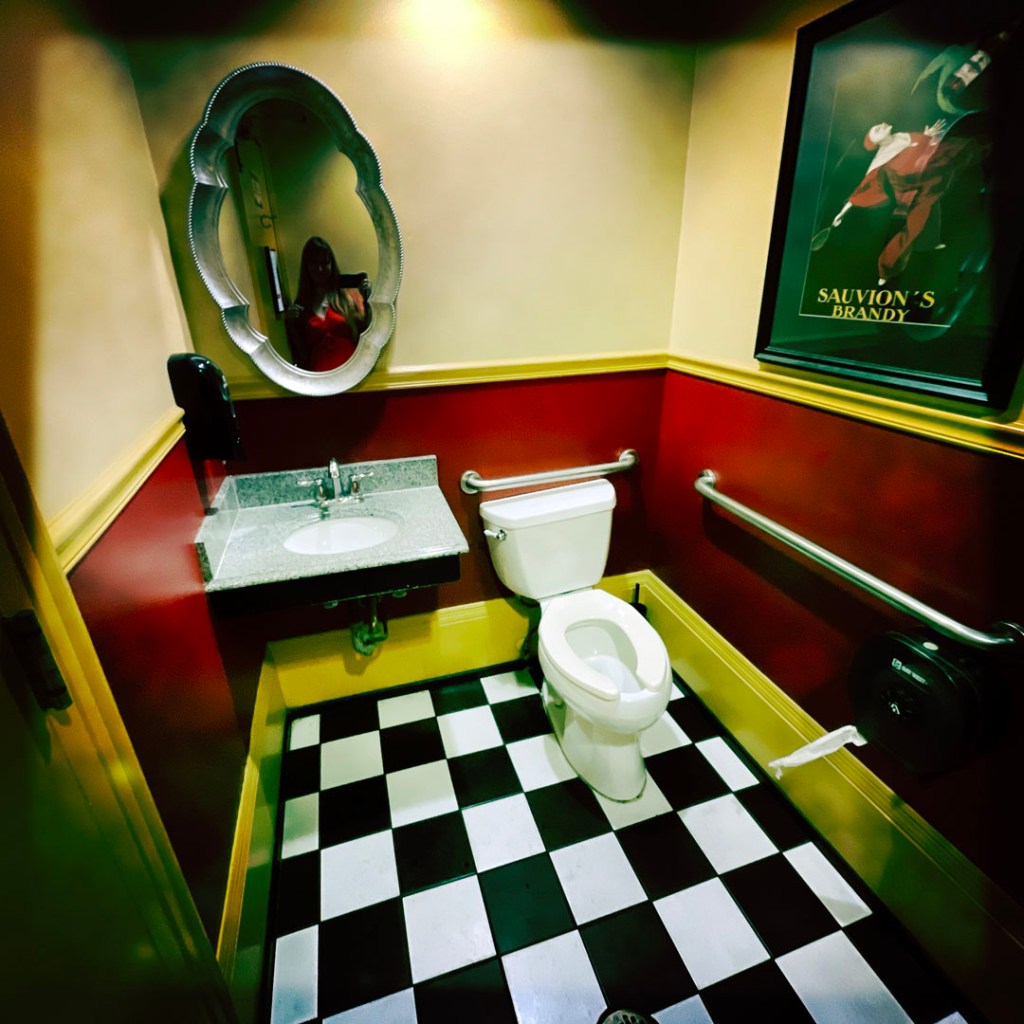 Un cocktail est inclu dans la visite (parce que j’ai payé à l’entrée, c’est pas magique non plus). On peut choisir parmi des cocktails de l’époque. Je dis que je veux bien du gin merci beaucoup monsieur. Je prends un « Aviation » et Manu un « French 75 ». C’est super super bon. Et surtout, dans le mien, y’a une petite cerise. Je me dis que. ça va être naze comme un fruit confit. Je croque dedans du bout des lèvres. Oh bon sang. C’est comme un bonbon bon. Je vais demander au barman ce que c’est. des cerises Maraschino, c’est italien. C’est génial, il m’en faut mille boites pour tout mes futurs gin tonic.