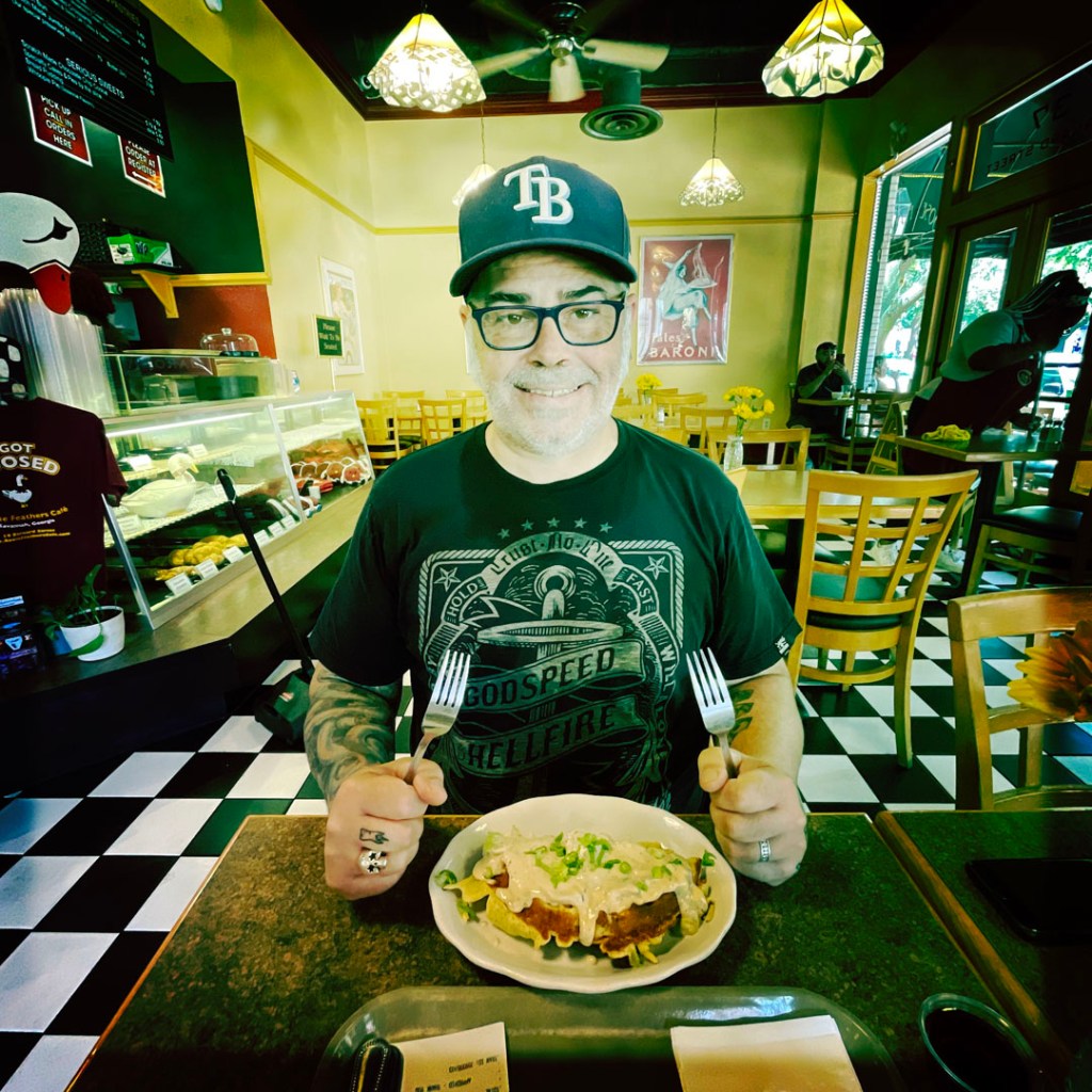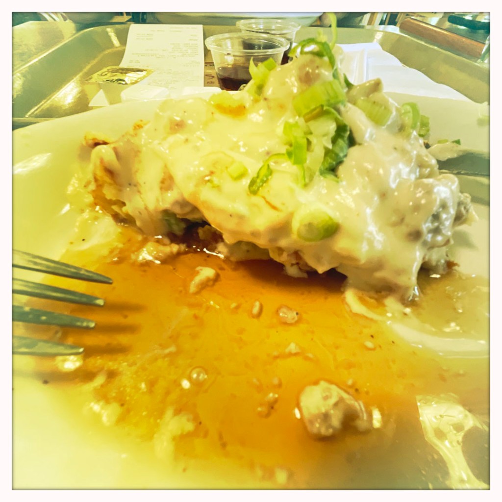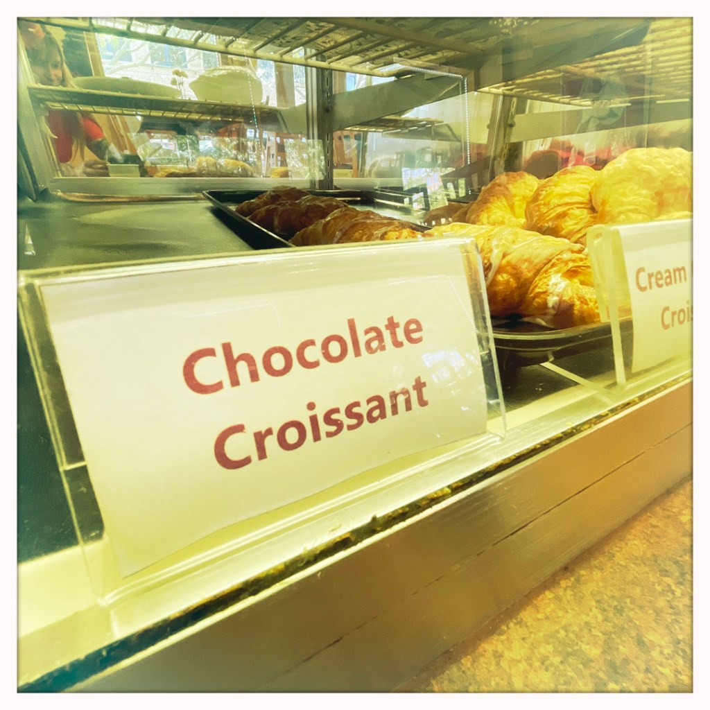 On trouve un super endroit de petit déjeuner. Des waffles au maïs, avec un genre de sausage gravy. Ils font aussi des croissants, et je pense qu’ils ont réglé cette sombre histoire de pain au chocolat vs chocolatine. Ils appellent ça : un croissant au chocolat. AH ON FAIT MOINS LES MALINS LES RÉGIONAUX ?!