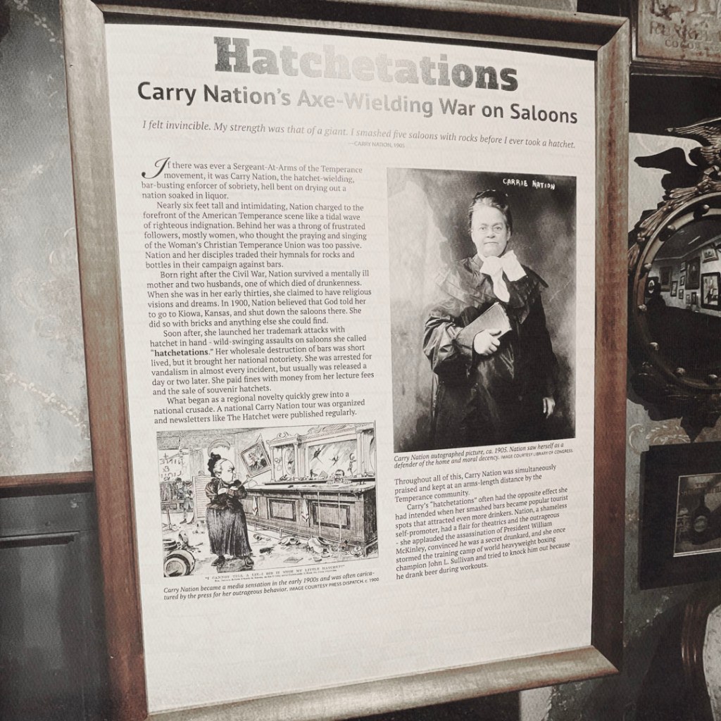 De fait, ils n’avaient pas tout à fait tort, machin est bien mort assez rapidement à cause de la picole excessive, laissant dans la mouise sa femme et sa fille. Mais : super cool, Carry s’est remariée, mais elle était super colère après l’alcool. Elle a lancé une section locale de la Woman’s Christian Temperance Union (WCTU) dans son bled et elle a demandé à Dieu ce qu’elle pouvait faire au sujet de ces saloperies de saloons. Dieu lui a dit (sympa le mec) « Va a Kiowa. Je serait à tes côtés. »