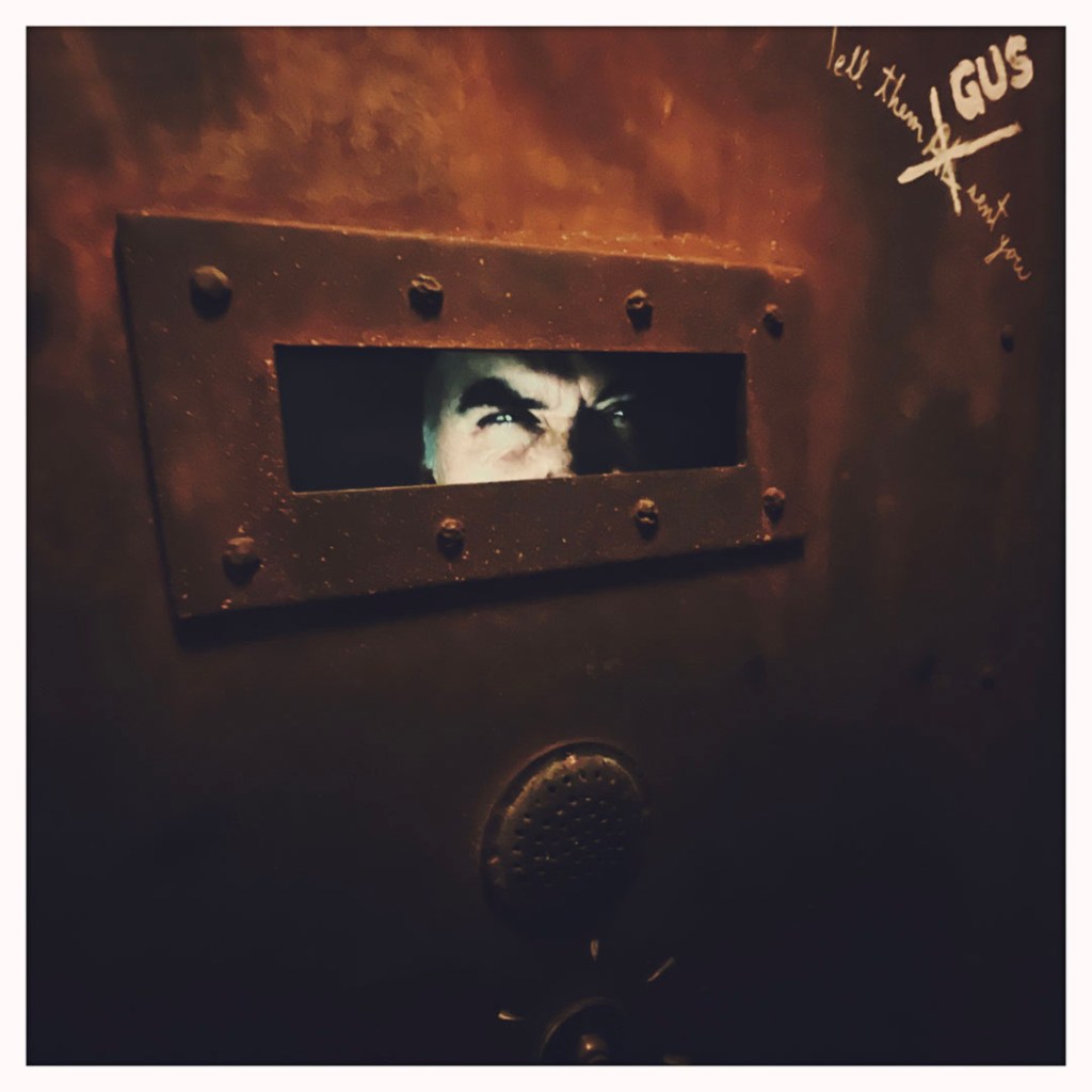 À un moment, on se retrouve dans une grosse porte en métal. Dans une fente. de boîte aux lettres, les yeux d’un type (c’est un film, je ne suis pas dupe), et une grosse voix qui dit que faut dire le mot de passe. C’est écrit sur la porte. « Telle them GUS sent you. »