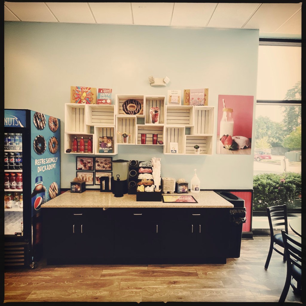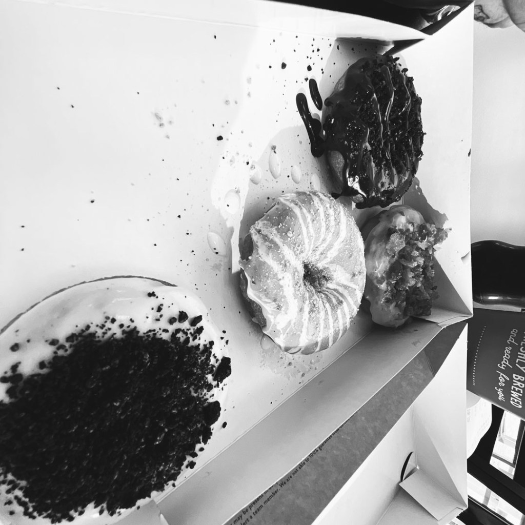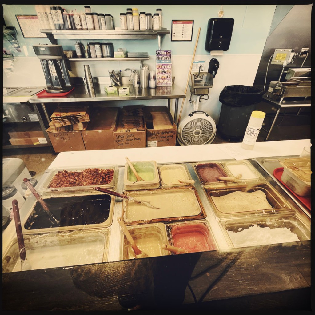 En chemin, je trouve un truc de donuts TRÈS DIFFÉRENT de d’habitude. Ils font les donuts à la demande, oui madame, oui monsieur. On choisit les toppings et on les mange chaud à même la boite. Écoutez, c’était vraiment très bon. J’en ai même pris un sirop d’érable bacon, c’était n’importe quoi super.